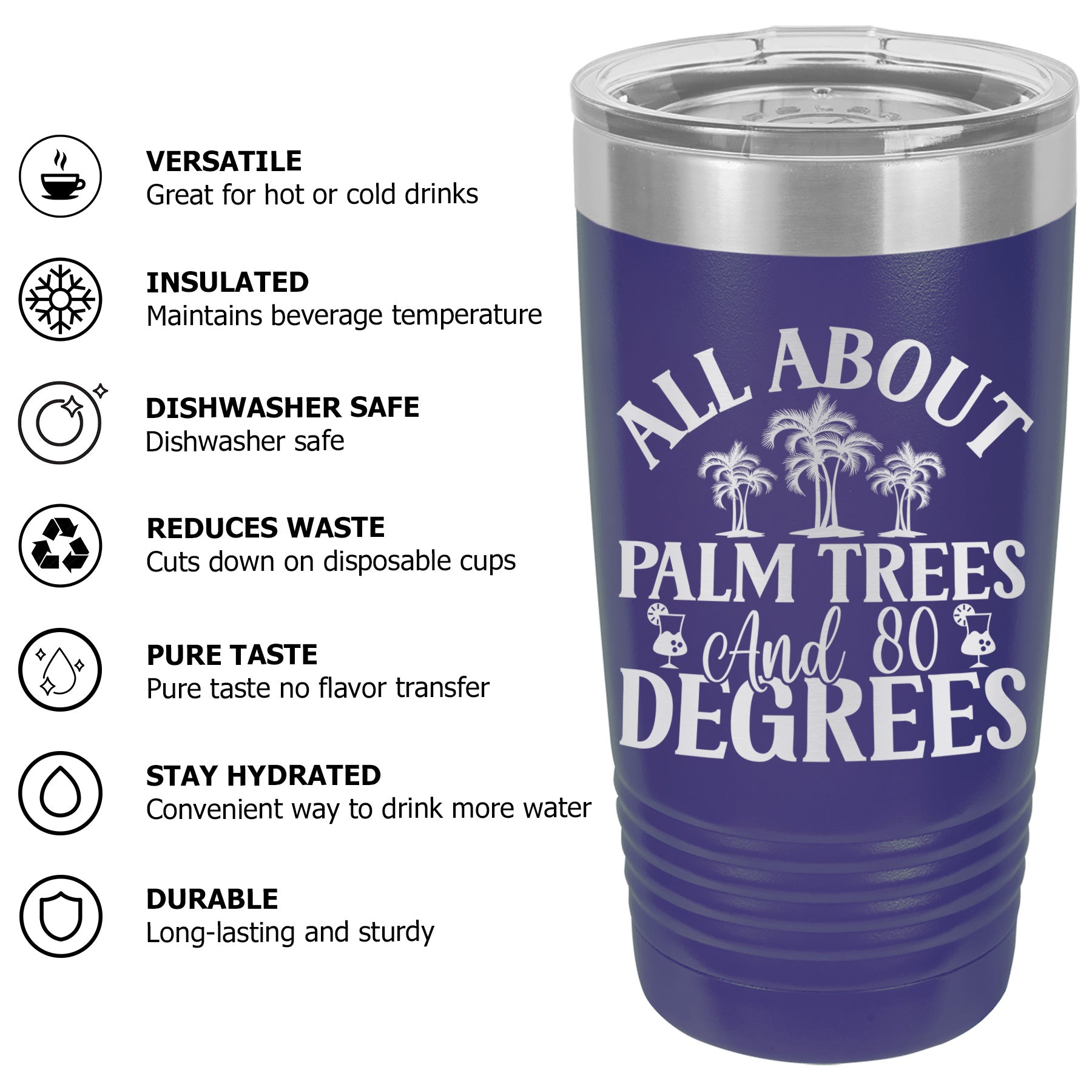 The Palm trees, 80 degrees, beach fun Tumbler Cup Mug is perfect for those craving sunshine walks by the beach. Enjoy palm trees summer vibes with sunshine and ocean breeze on hot days, and feel the sunshine and sandy toes with every sip.