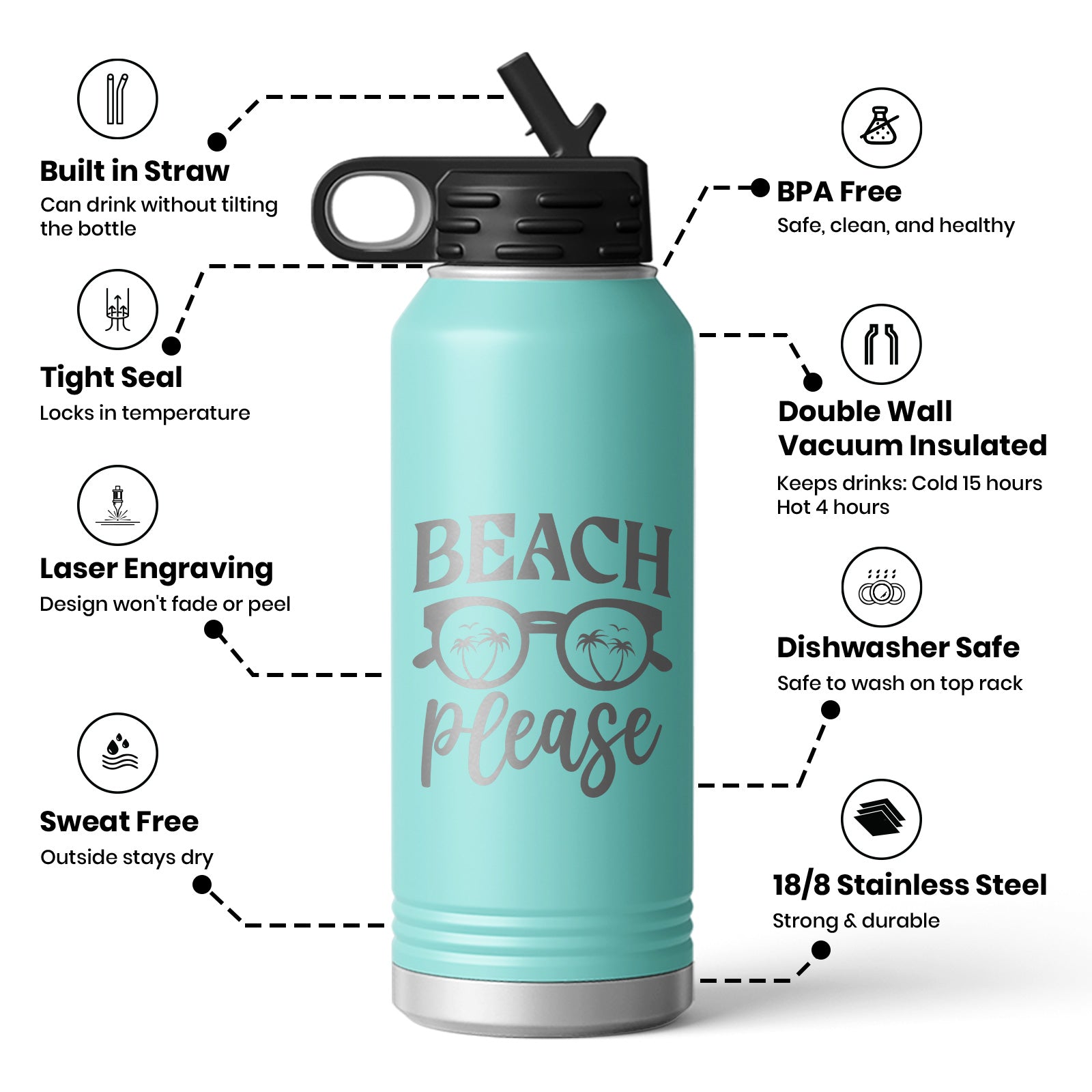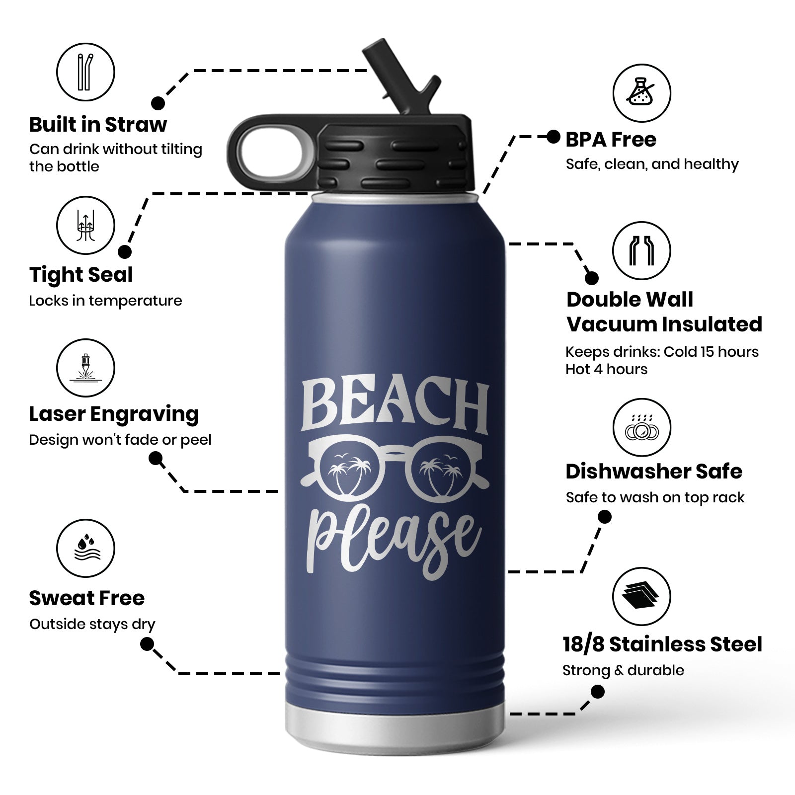 The Summer Adventure, Beach Please Water Bottle is a must-have for beach walking and relaxing. Stay hydrated in style with this durable bottle featuring summer fun by the ocean design. Perfect for summer beach waves, with a design that captures the essence of summer breeze and sunshine, and beach mode activated vibes.