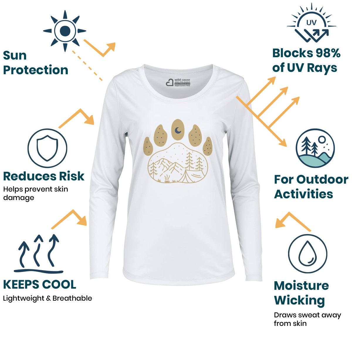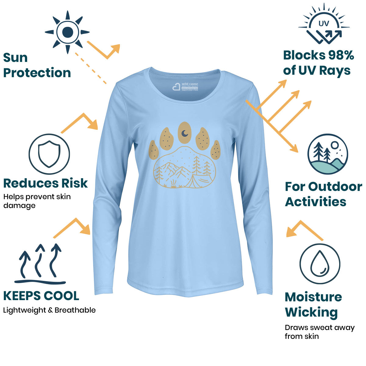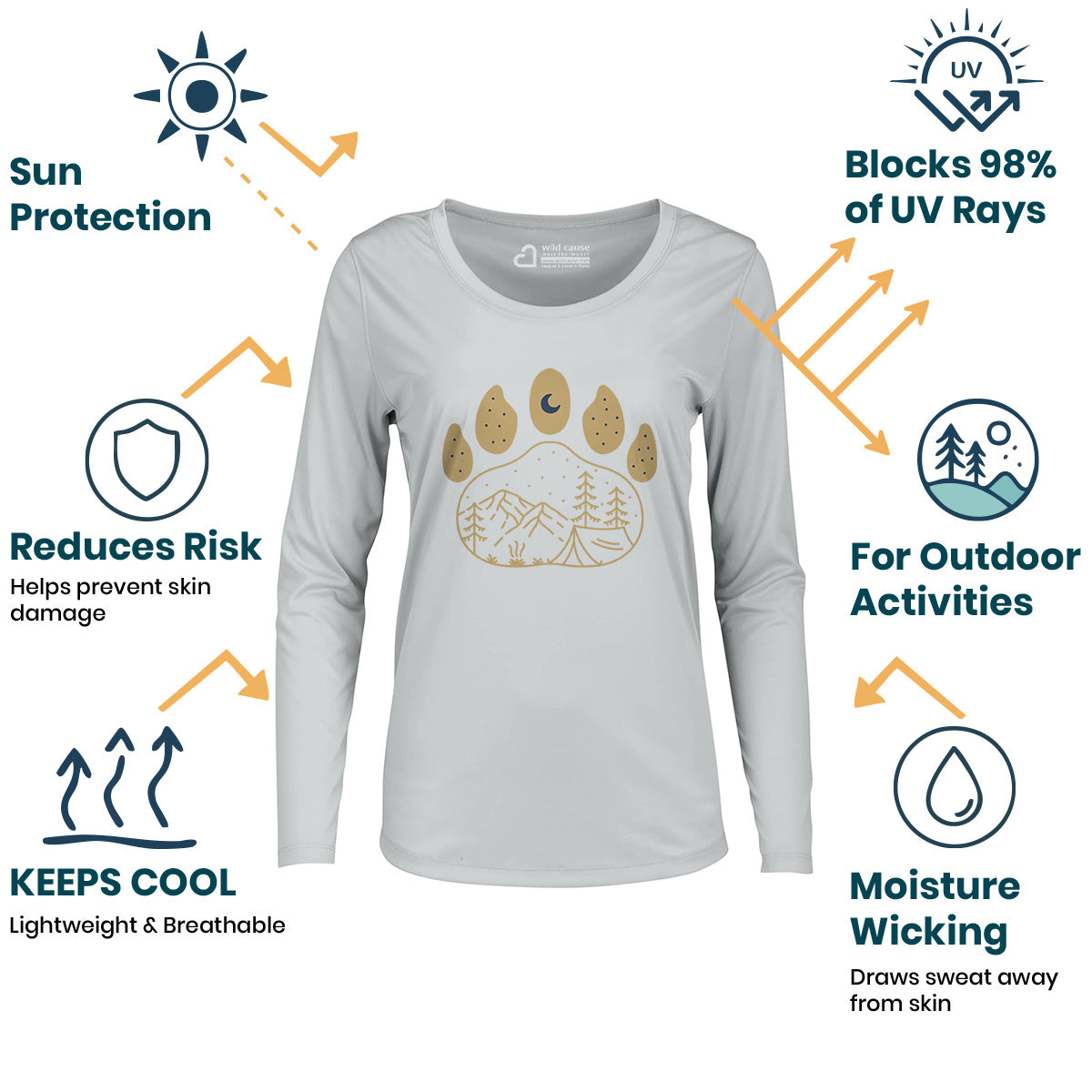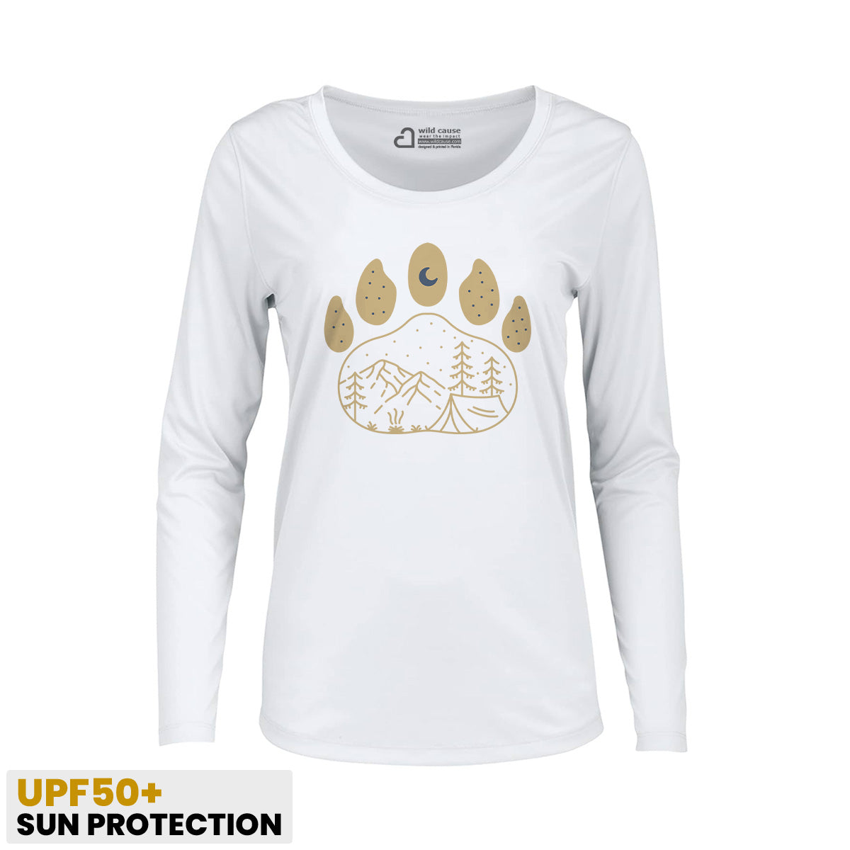 Camp wild bear footprints Women Sun Protection UV Performance Shirt UPF 50+ is ideal for forest exploration trips and camp and discover wild creatures. Perfect for forest night adventures and nature campfire adventures. Stay comfortable during adventures by the campfire.
