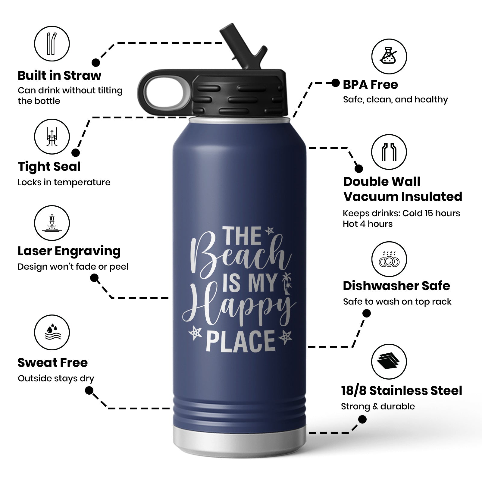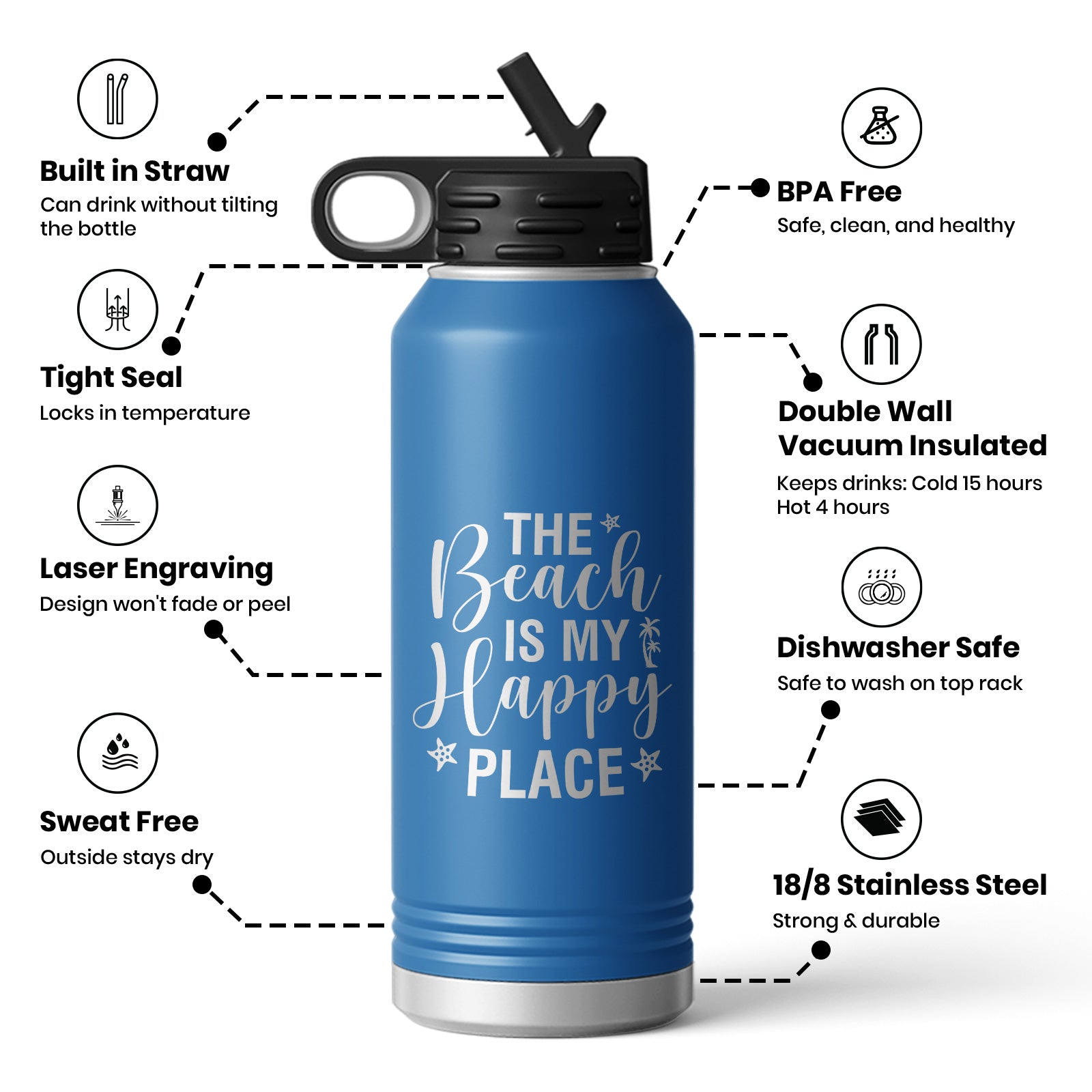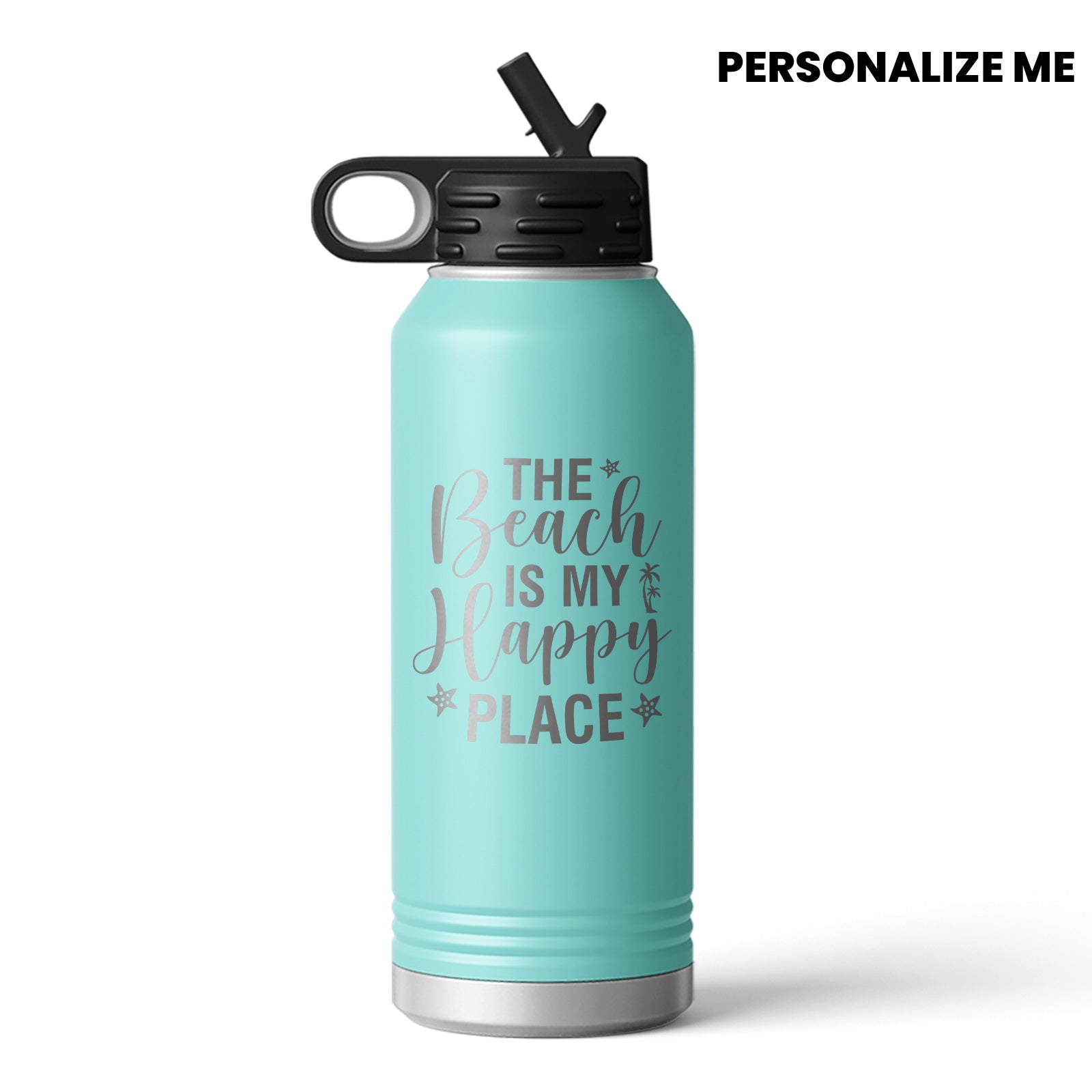Stay hydrated with the My happy place is the beach water bottle, perfect for beach vibes only. This durable bottle features a design that captures happy beach days and my beachside happy place. Take it with you for endless summer feel and beach happiness.