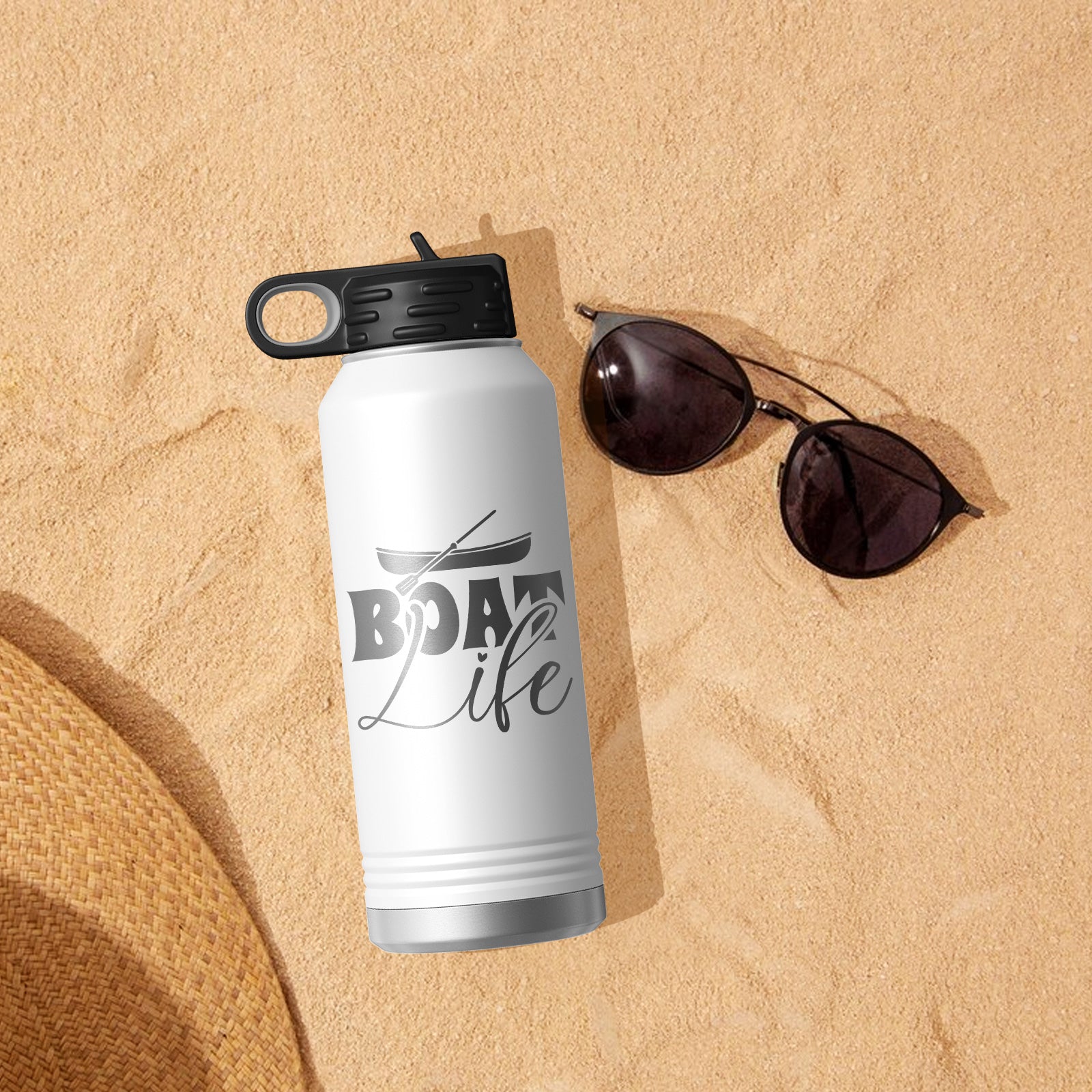 Feel the breeze on the lake! water bottle is perfect for sunny days on the water. This stress-free design evokes vacation boating adventures and relaxing nautical vibes. Stay hydrated in style with this unique water bottle.