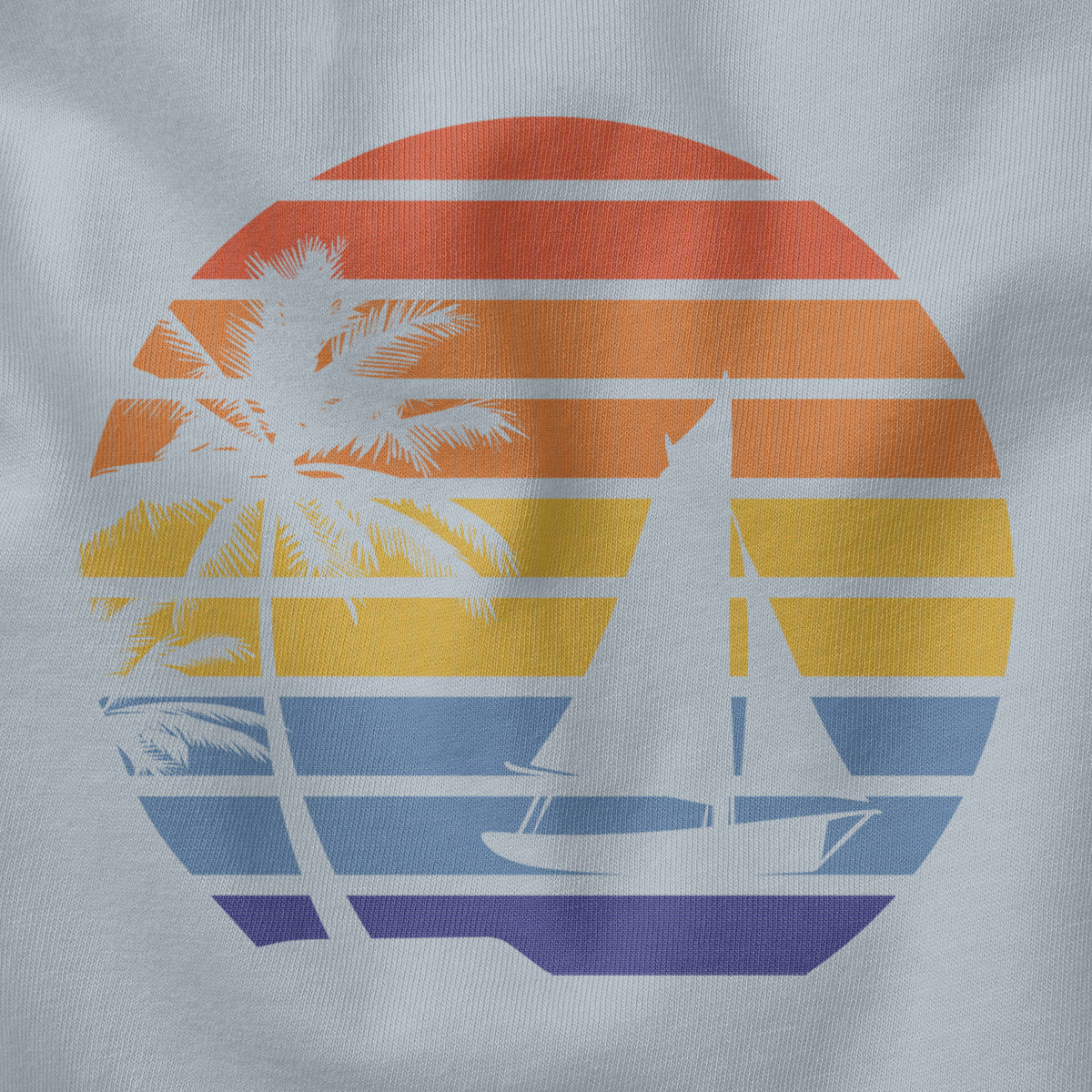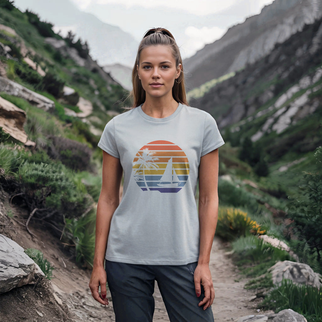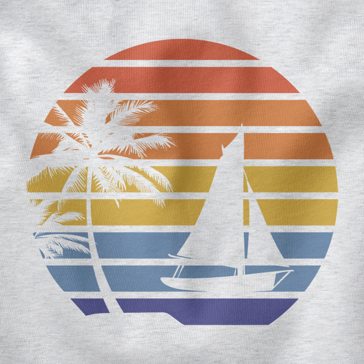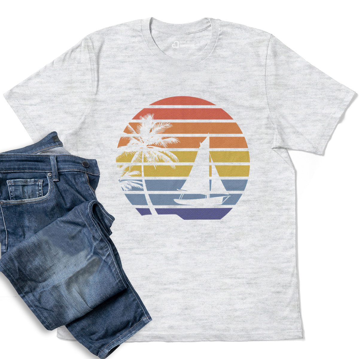 Sailboat ride with beach sunset Adult Cotton Tee T-Shirt embodies sunset sailing vibes with warm evening on water. Enjoy golden sunset view in style and comfort. Perfect for those seeking sunset boat journey.