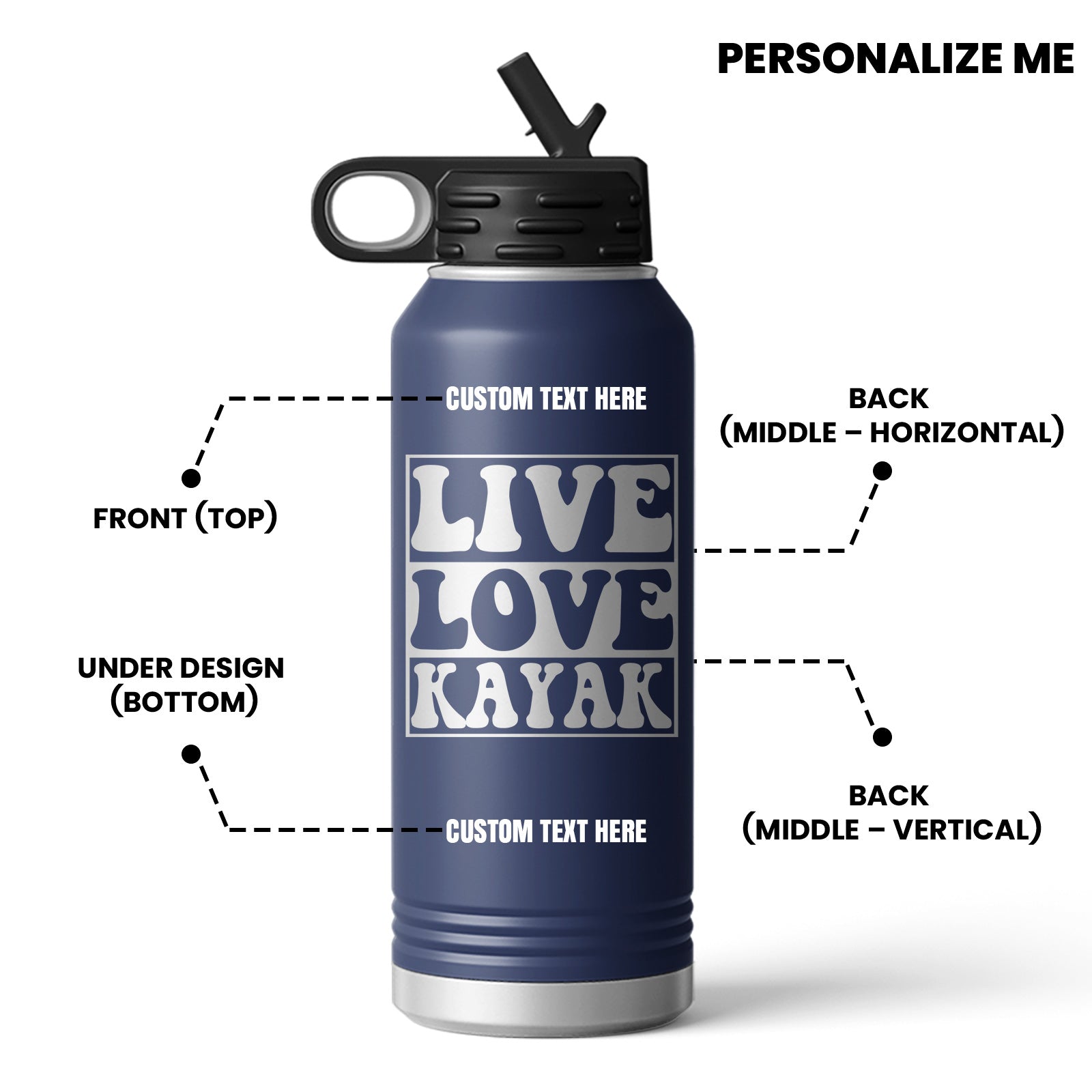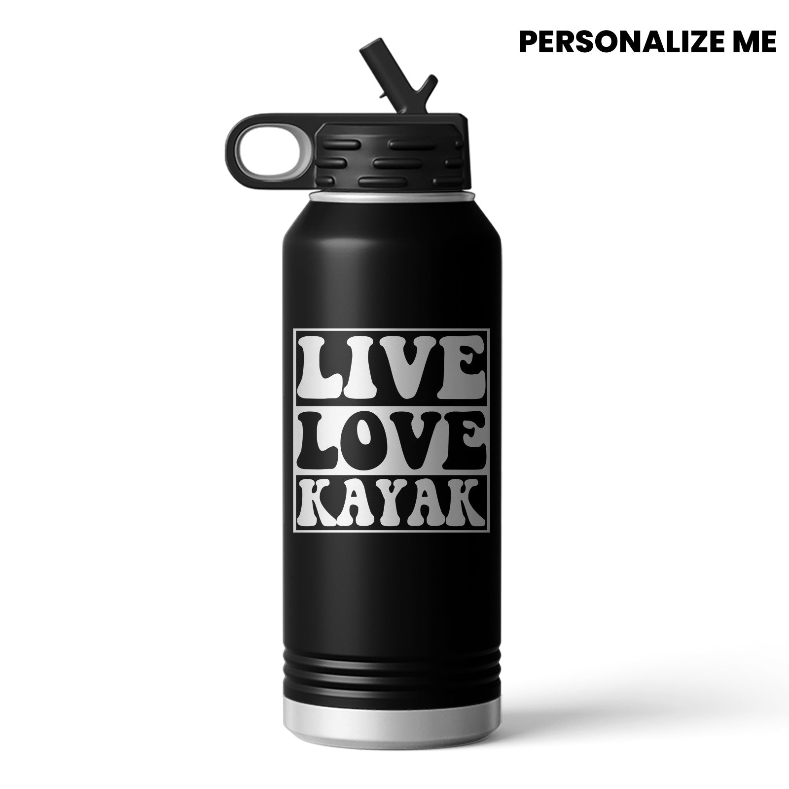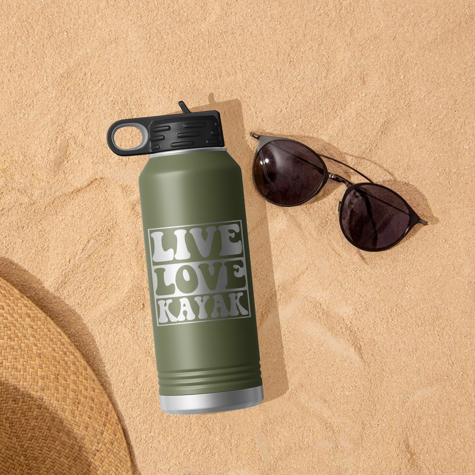 Stay hydrated in style with the Live, love, kayak outdoor fun awaits water bottle. Paddling for relaxation and kayaking adventure day are just a sip away. This water therapy time essential exudes kayaking therapy vibes and clears your mind on every adventure.