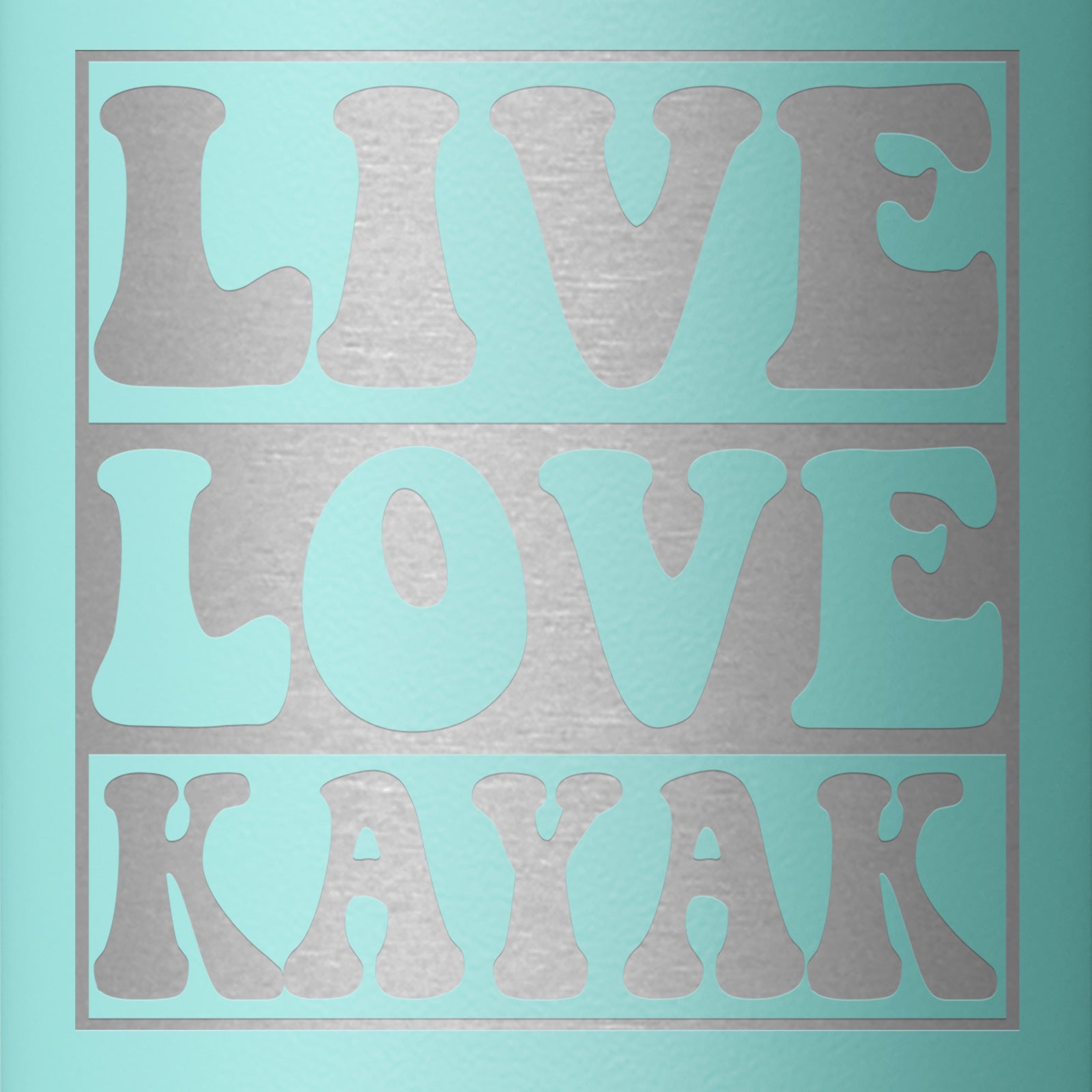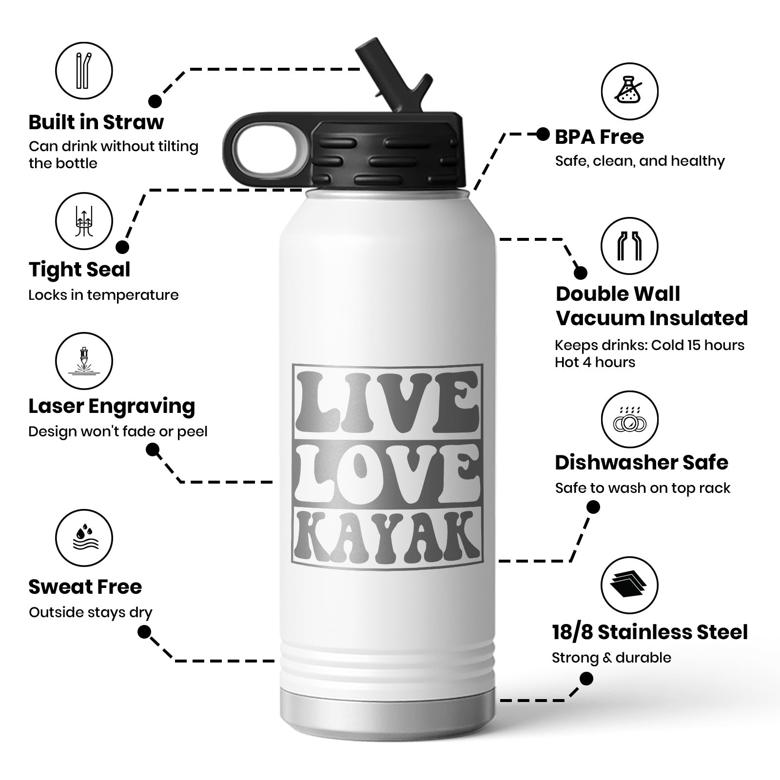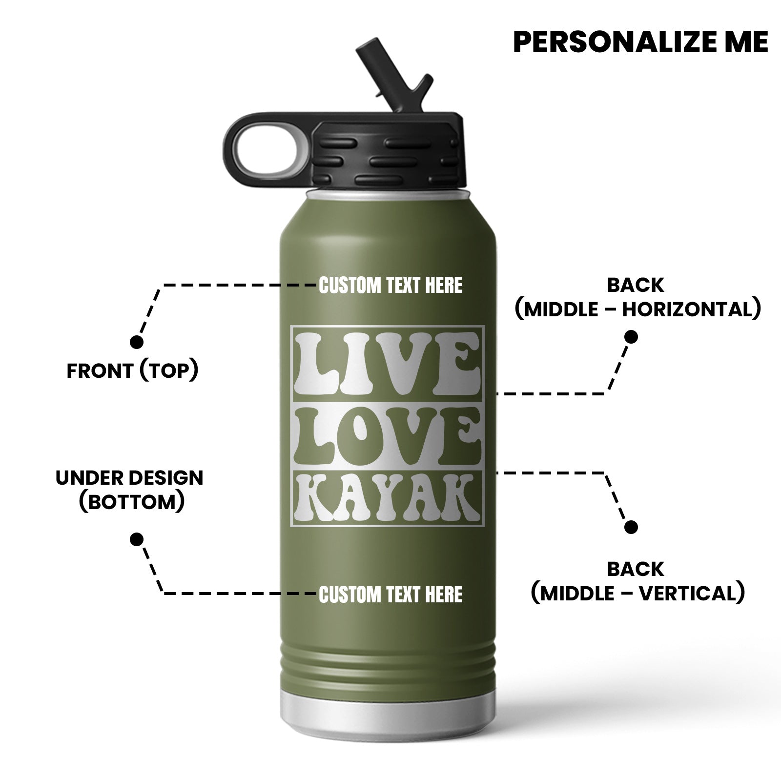 Stay hydrated in style with the Live, love, kayak outdoor fun awaits water bottle. Paddling for relaxation and kayaking adventure day are just a sip away. This water therapy time essential exudes kayaking therapy vibes and clears your mind on every adventure.