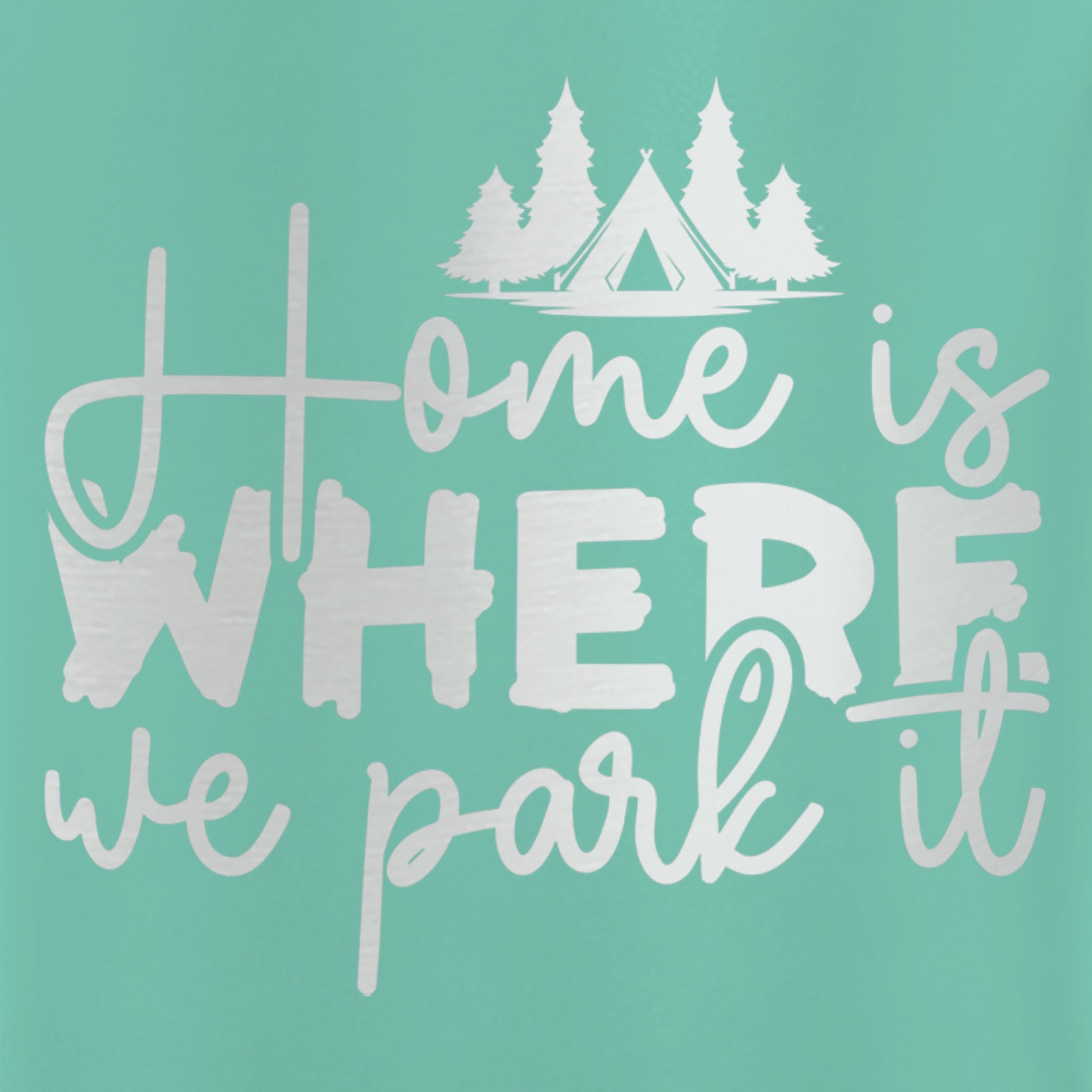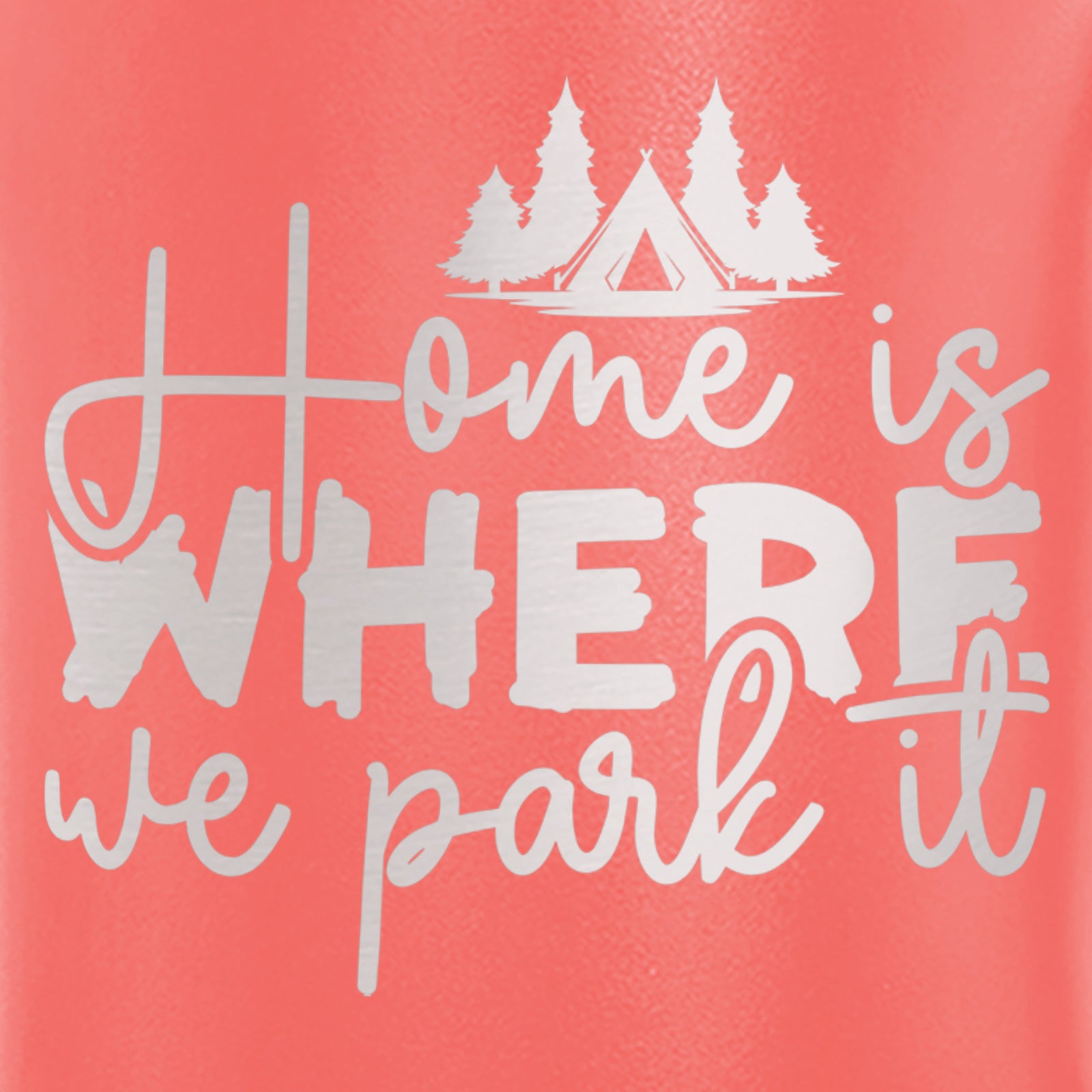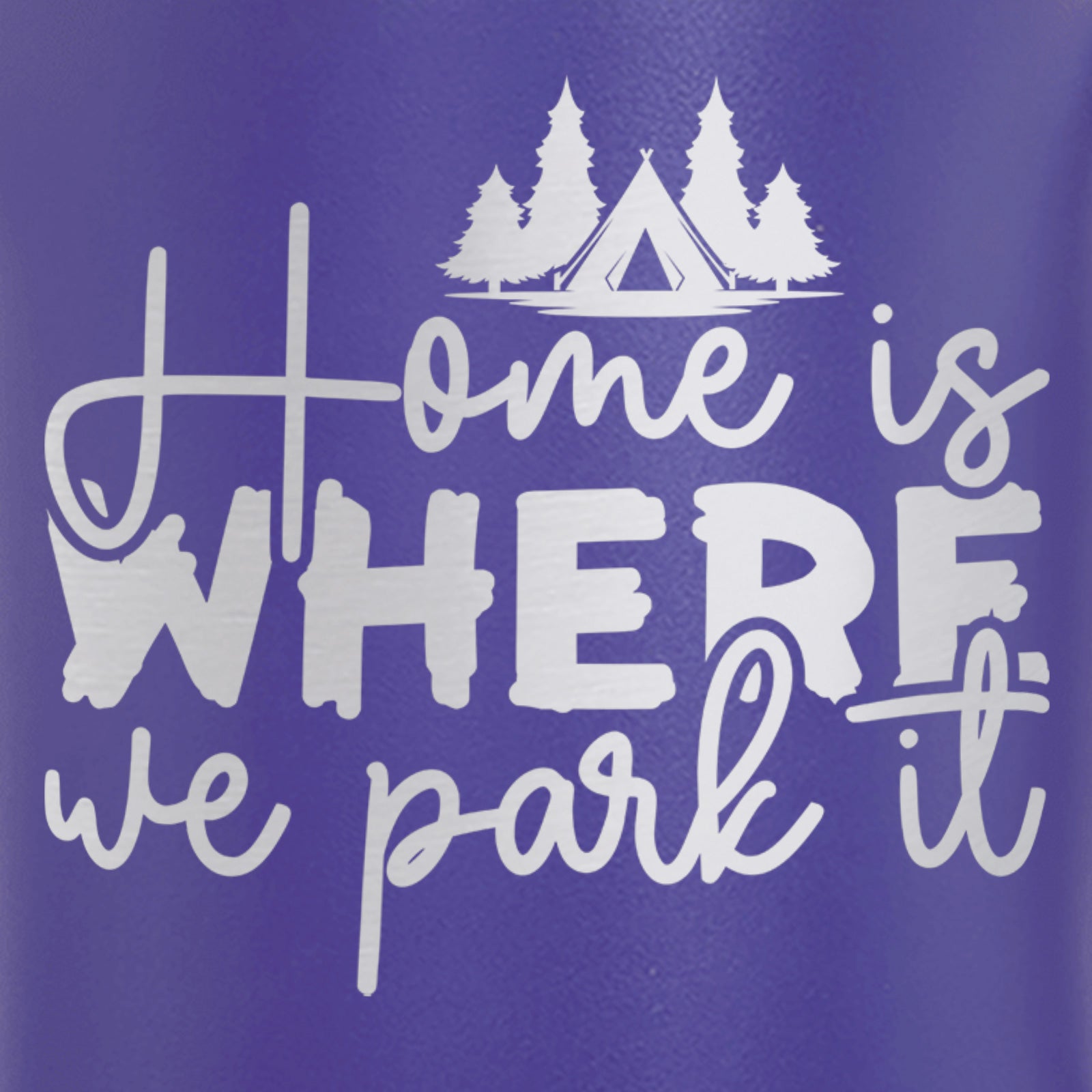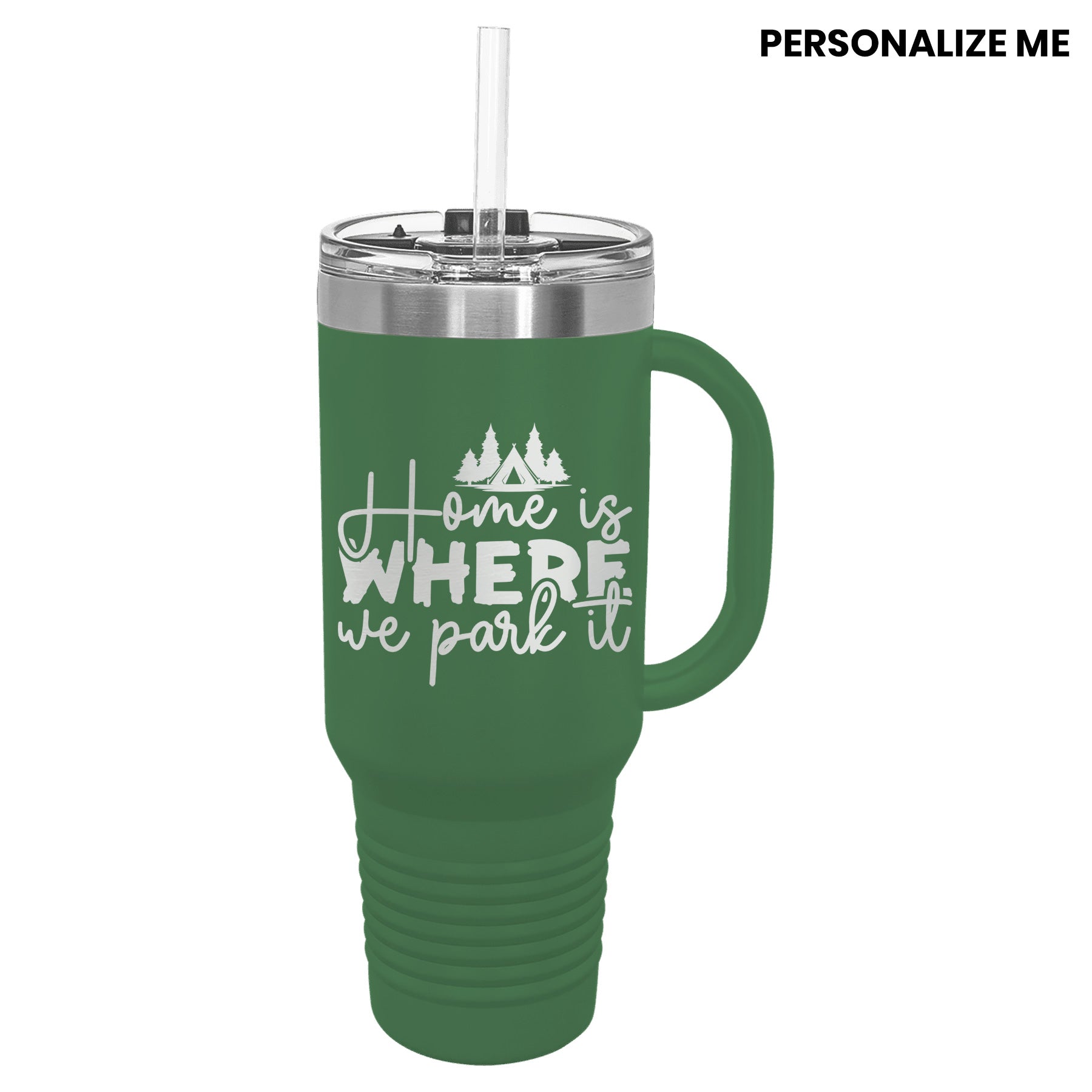 The Home is where we park the camper Tumbler with Handle is a must-have for those living the RV life. Featuring a durable handle and sleek design, it's perfect for your mobile home journey. Enjoy your adventures in our home on wheels.