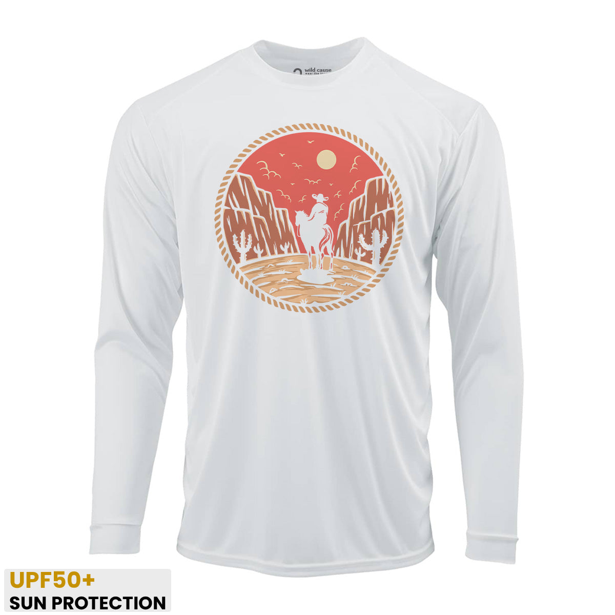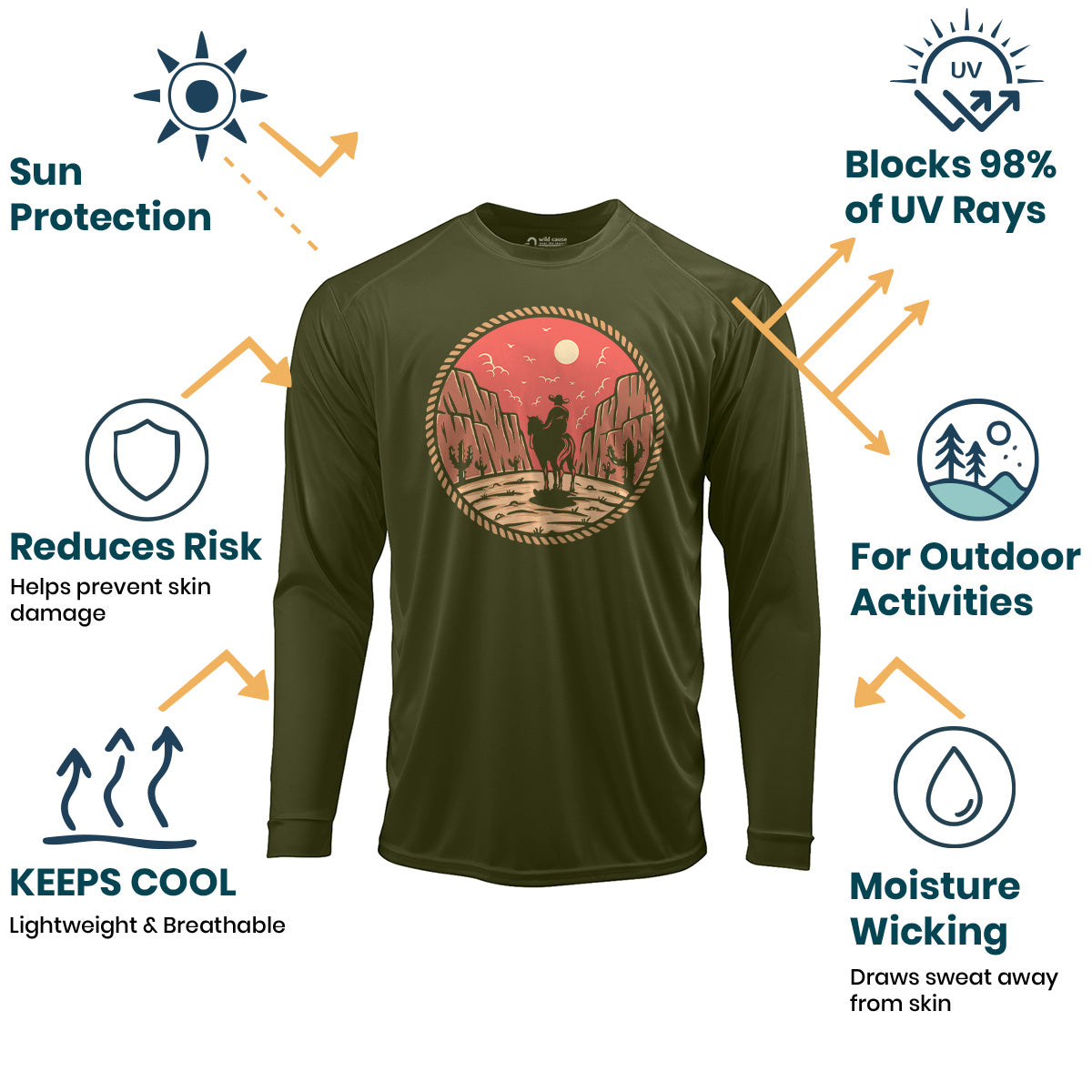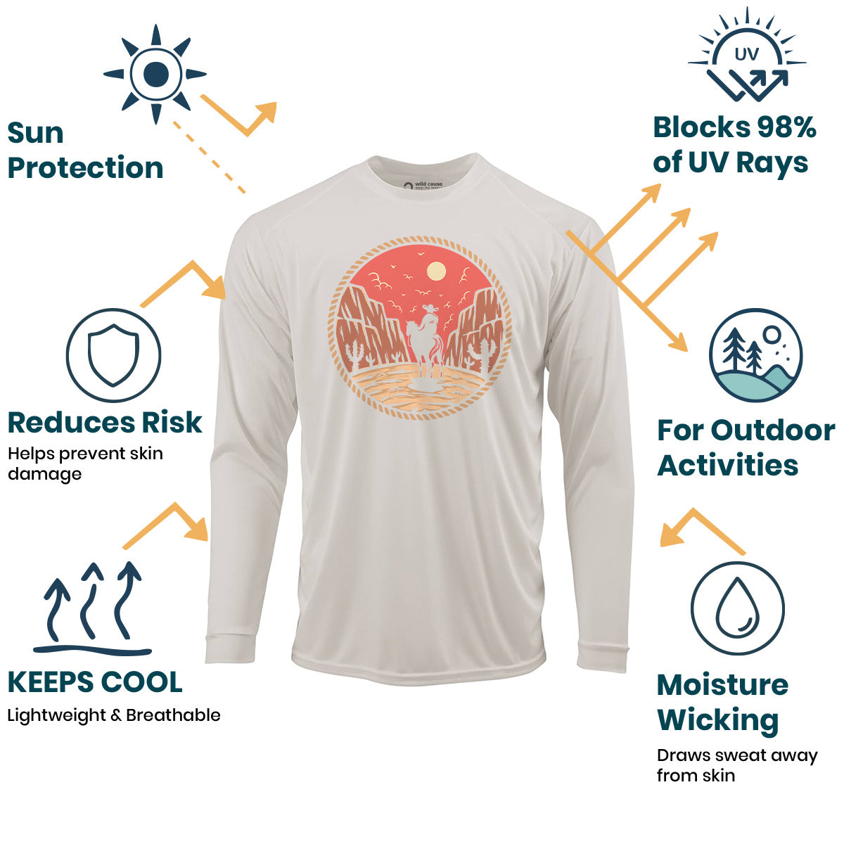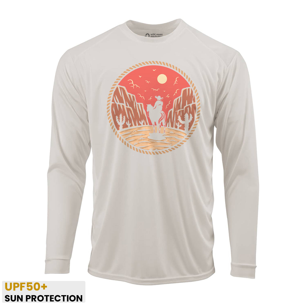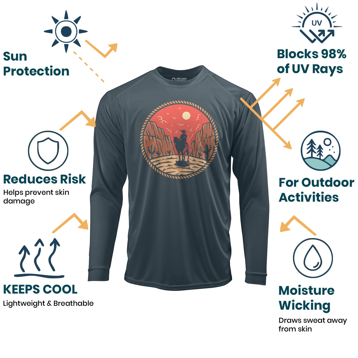 Ride through the dusty trails in style with our Desert Cowboy Sun Protection UV Performance Shirt UPF 50+. Perfect for Western Ride enthusiasts and those who love Riding Through Desert. Stay protected and comfortable all day with this Cowboy Life essential for the Desert Nomad.