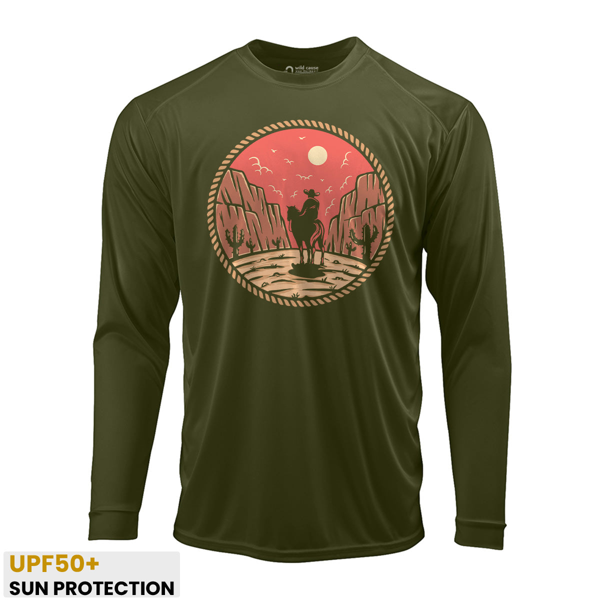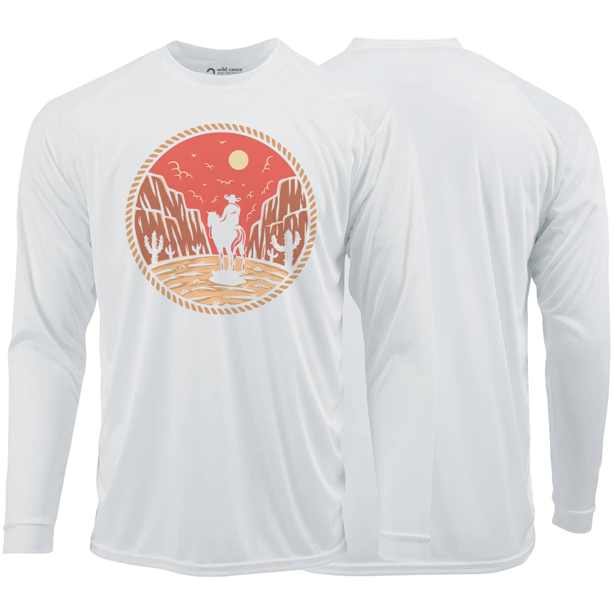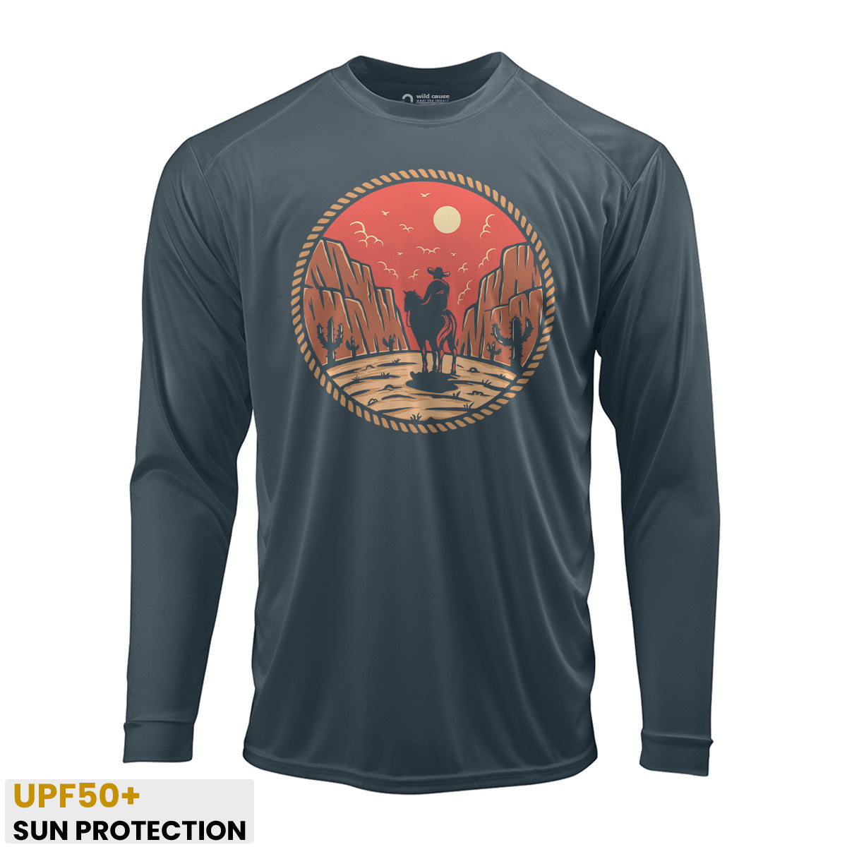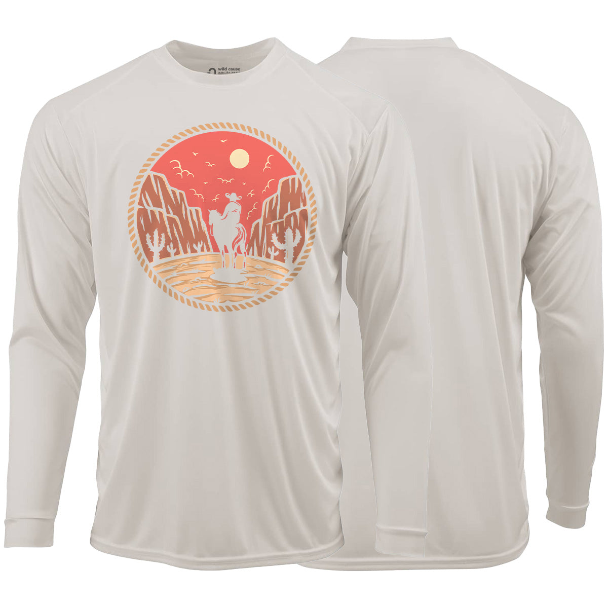 Ride through the dusty trails in style with our Desert Cowboy Sun Protection UV Performance Shirt UPF 50+. Perfect for Western Ride enthusiasts and those who love Riding Through Desert. Stay protected and comfortable all day with this Cowboy Life essential for the Desert Nomad.
