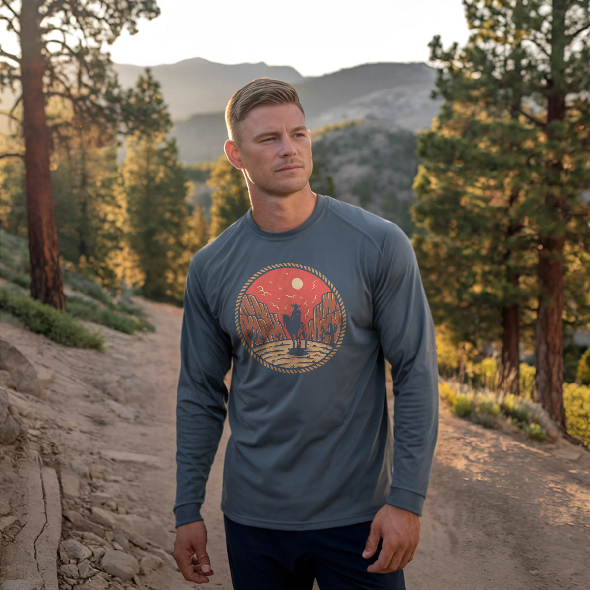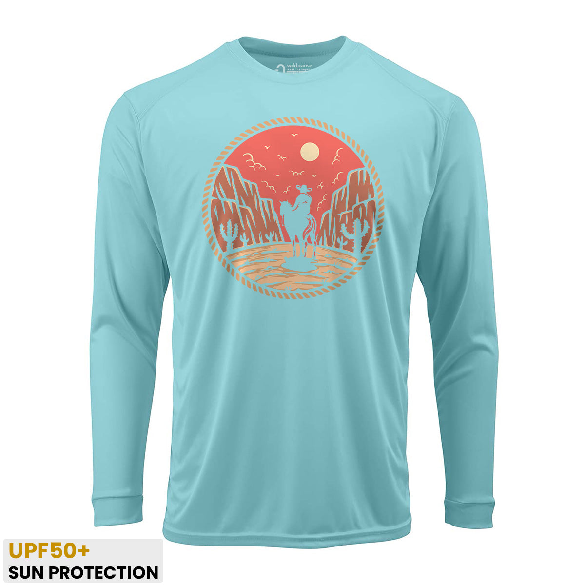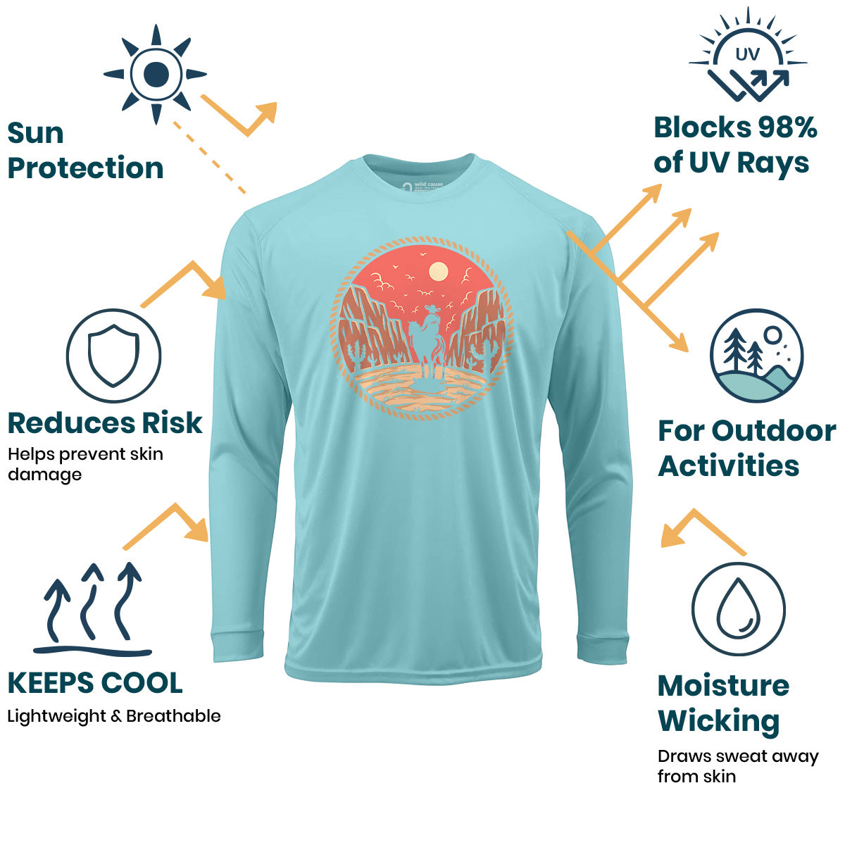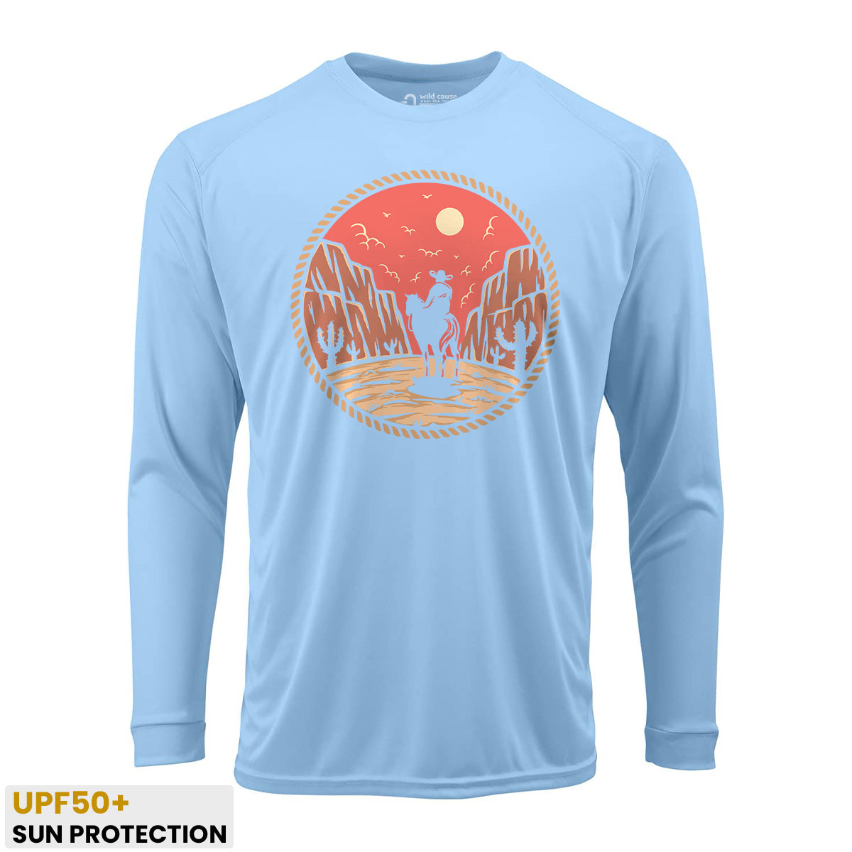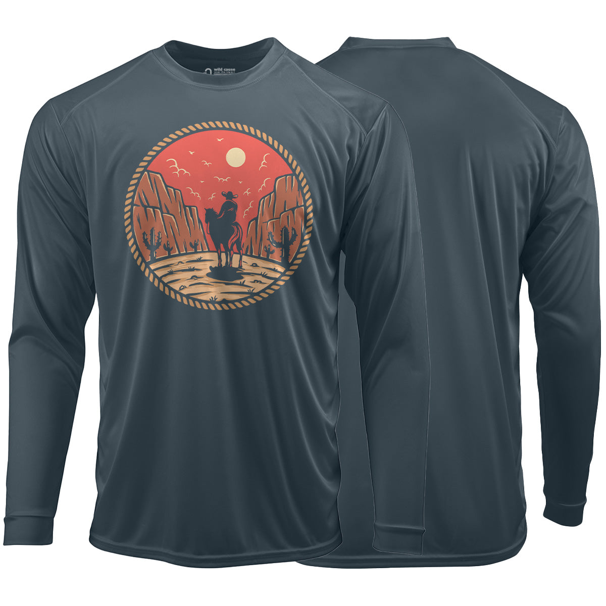 Ride through the dusty trails in style with our Desert Cowboy Sun Protection UV Performance Shirt UPF 50+. Perfect for Western Ride enthusiasts and those who love Riding Through Desert. Stay protected and comfortable all day with this Cowboy Life essential for the Desert Nomad.