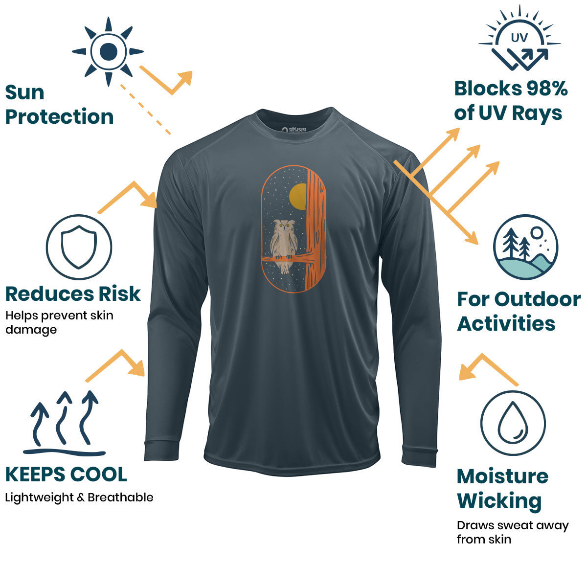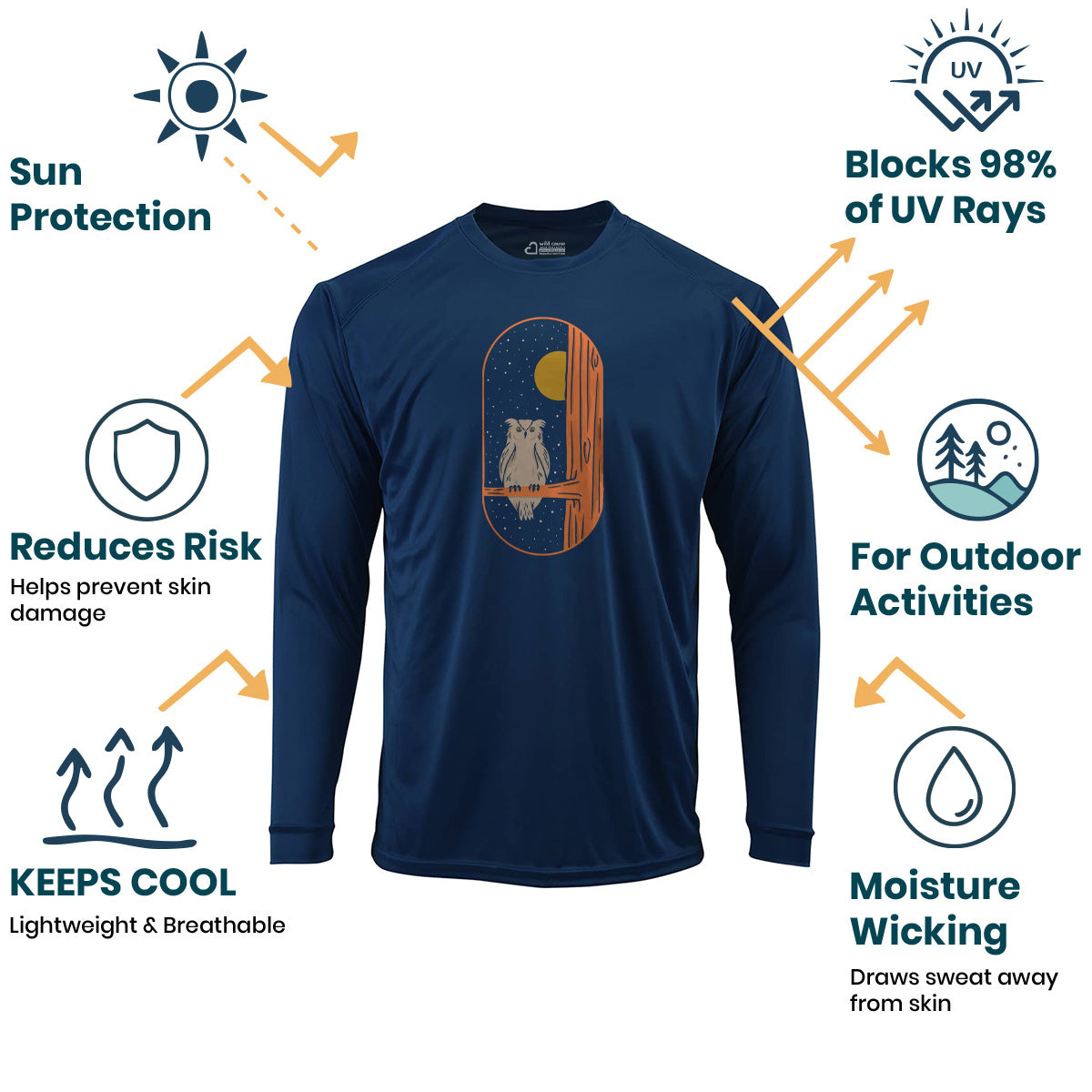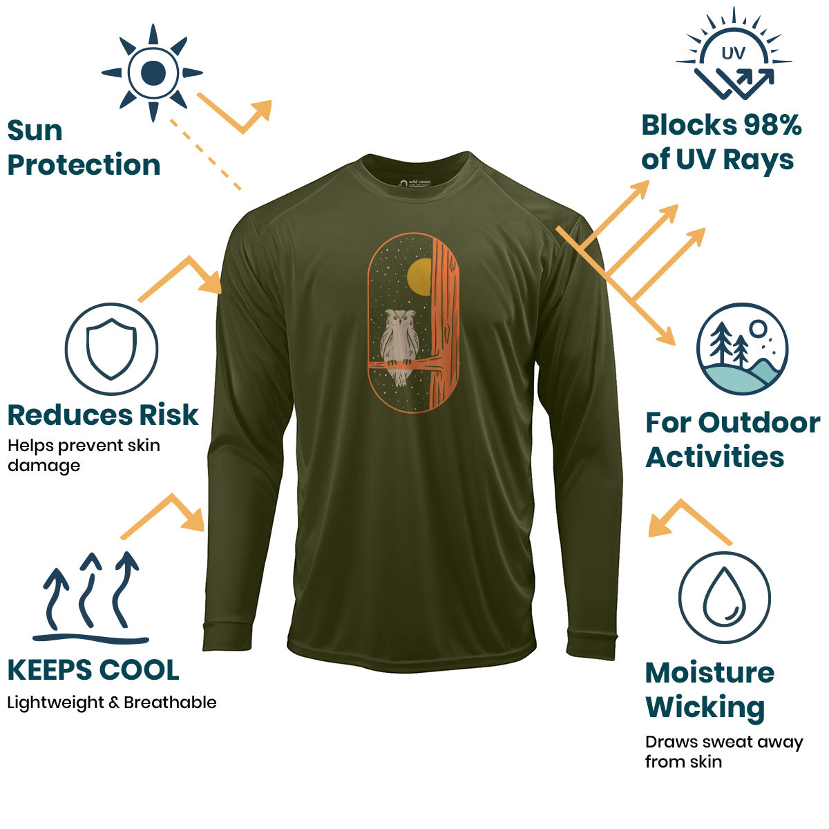 The Owl hollow Sun Protection UV Performance Shirt UPF 50+ features a stunning design of an Owl on The Full Moon, highlighting Owl Conservation Awareness. This Moonlit Owl Perch shirt is perfect for those who admire the Silent Guardian of the Forest and love the connection between Owl and Full Moon.