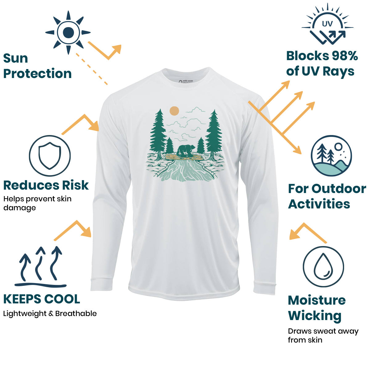 Nature’s beauty in motion! Sun Protection UV Performance Shirt UPF 50+ featuring a majestic Wild Bear roaming through the Forest Wildlife of Bear Creek. Embrace the Wild Habitat with this Forest Beast design, perfect for outdoor enthusiasts.