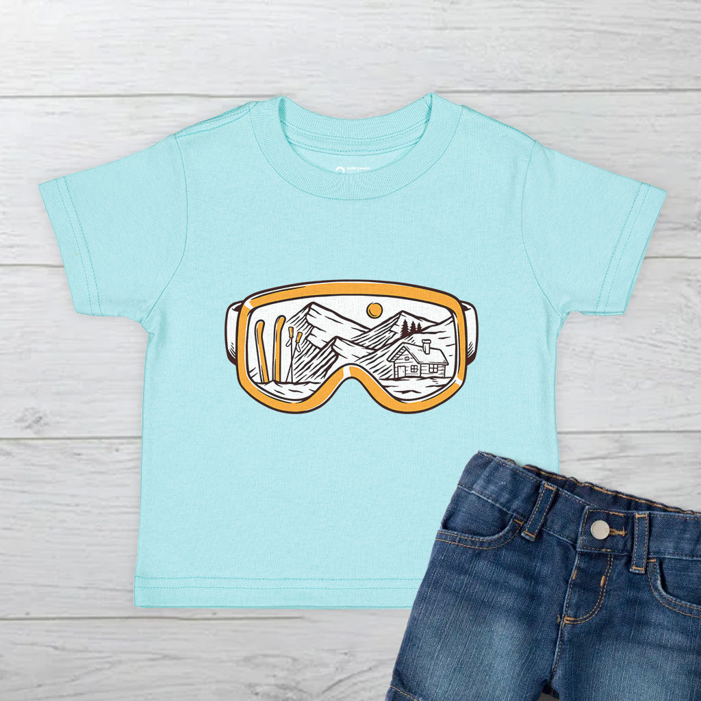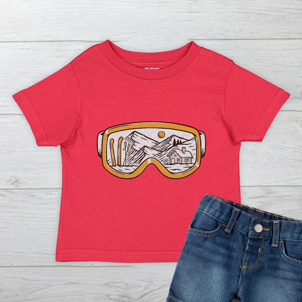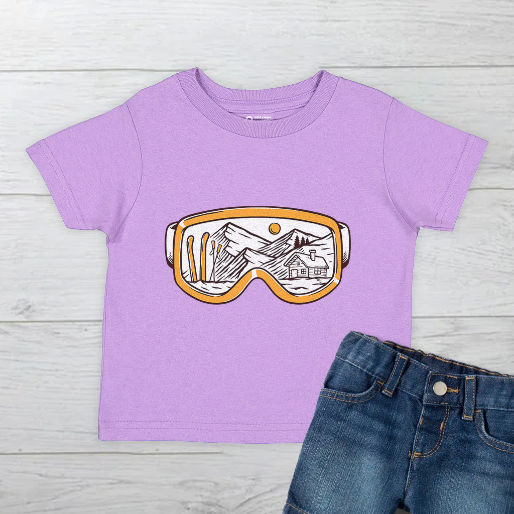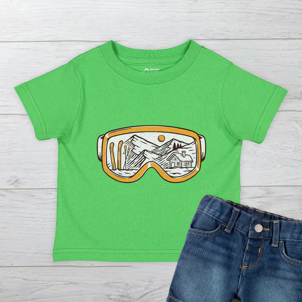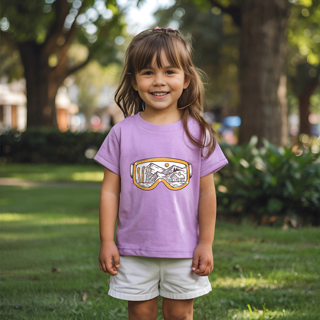 The Snowy Escape Kids Toddler Tee T-Shirt features a cool design of Snow Vision Goggles, perfect for winter adventures. Made from high-quality fabric, it ensures comfort while skiing. This tee is a must-have for kids who love snow goggles and skiing goggles.
