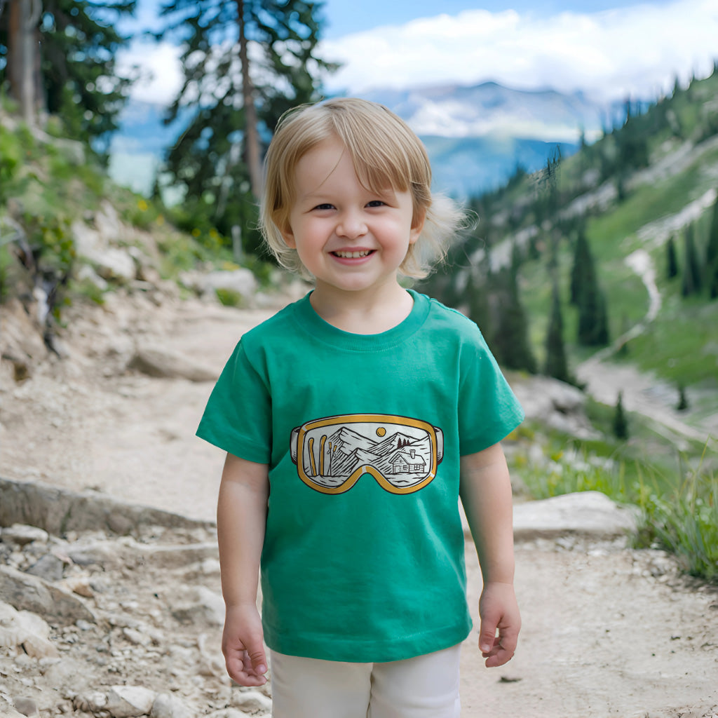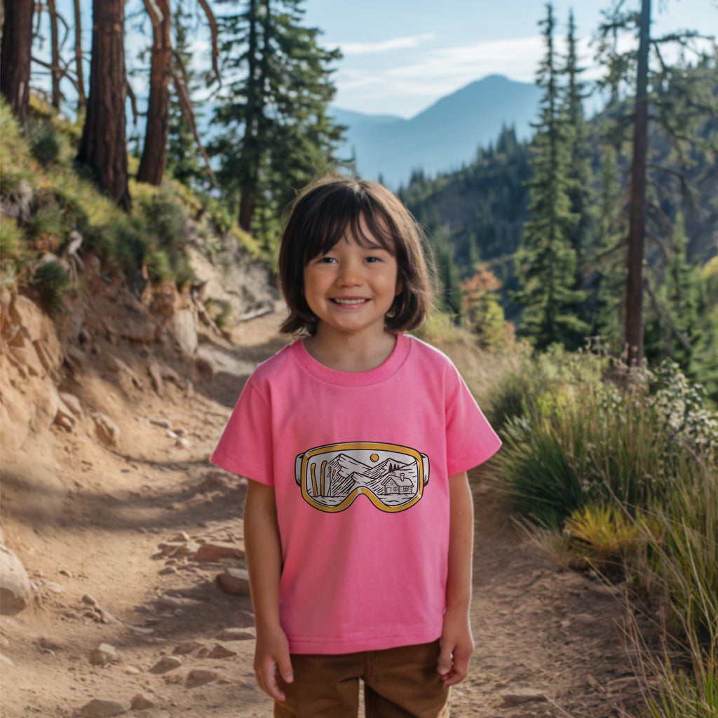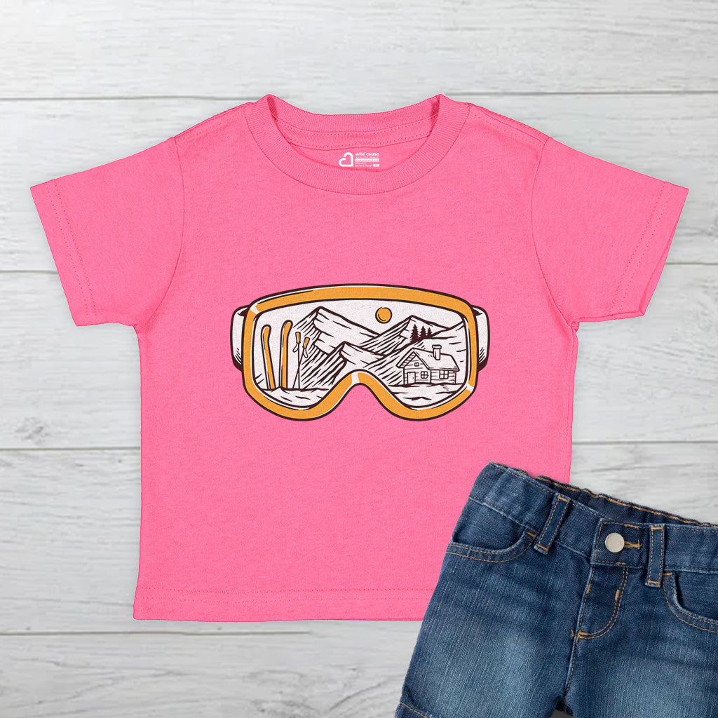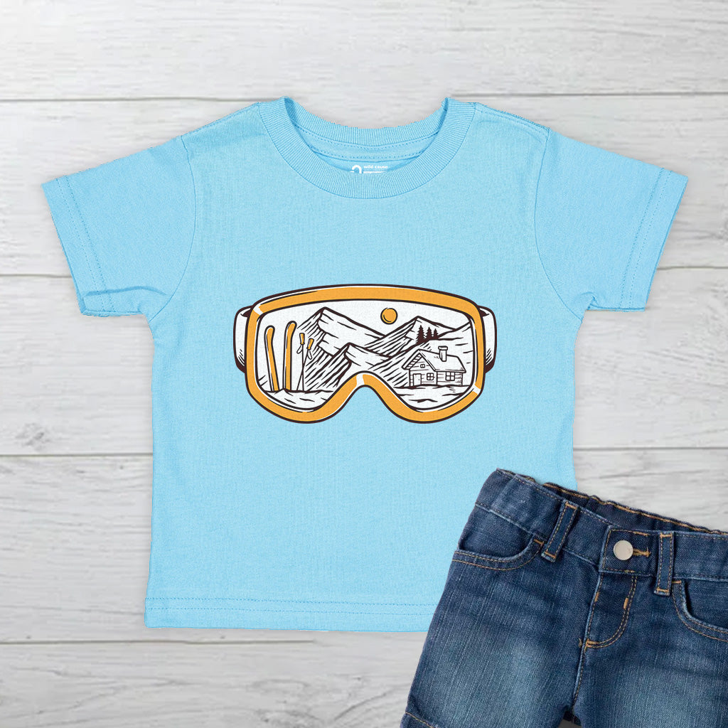 The Snowy Escape Kids Toddler Tee T-Shirt features a cool design of Snow Vision Goggles, perfect for winter adventures. Made from high-quality fabric, it ensures comfort while skiing. This tee is a must-have for kids who love snow goggles and skiing goggles.