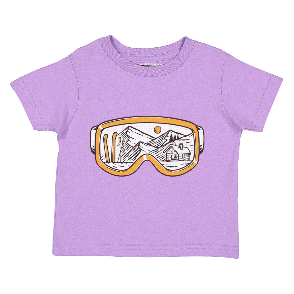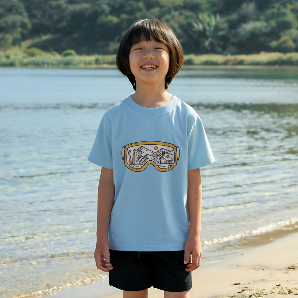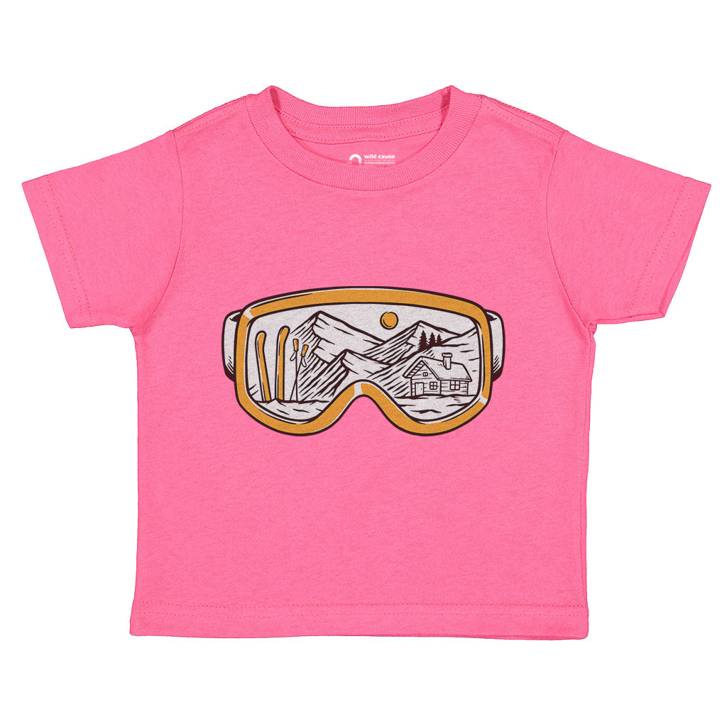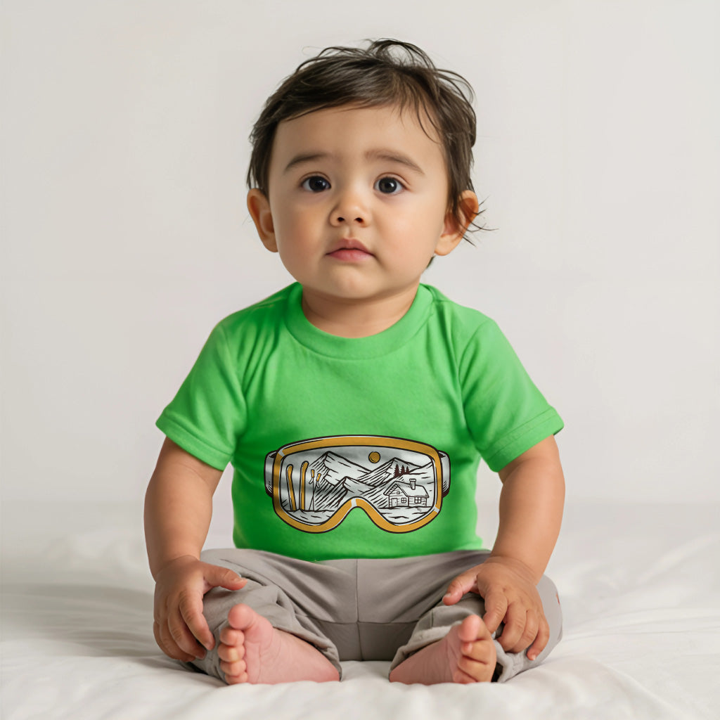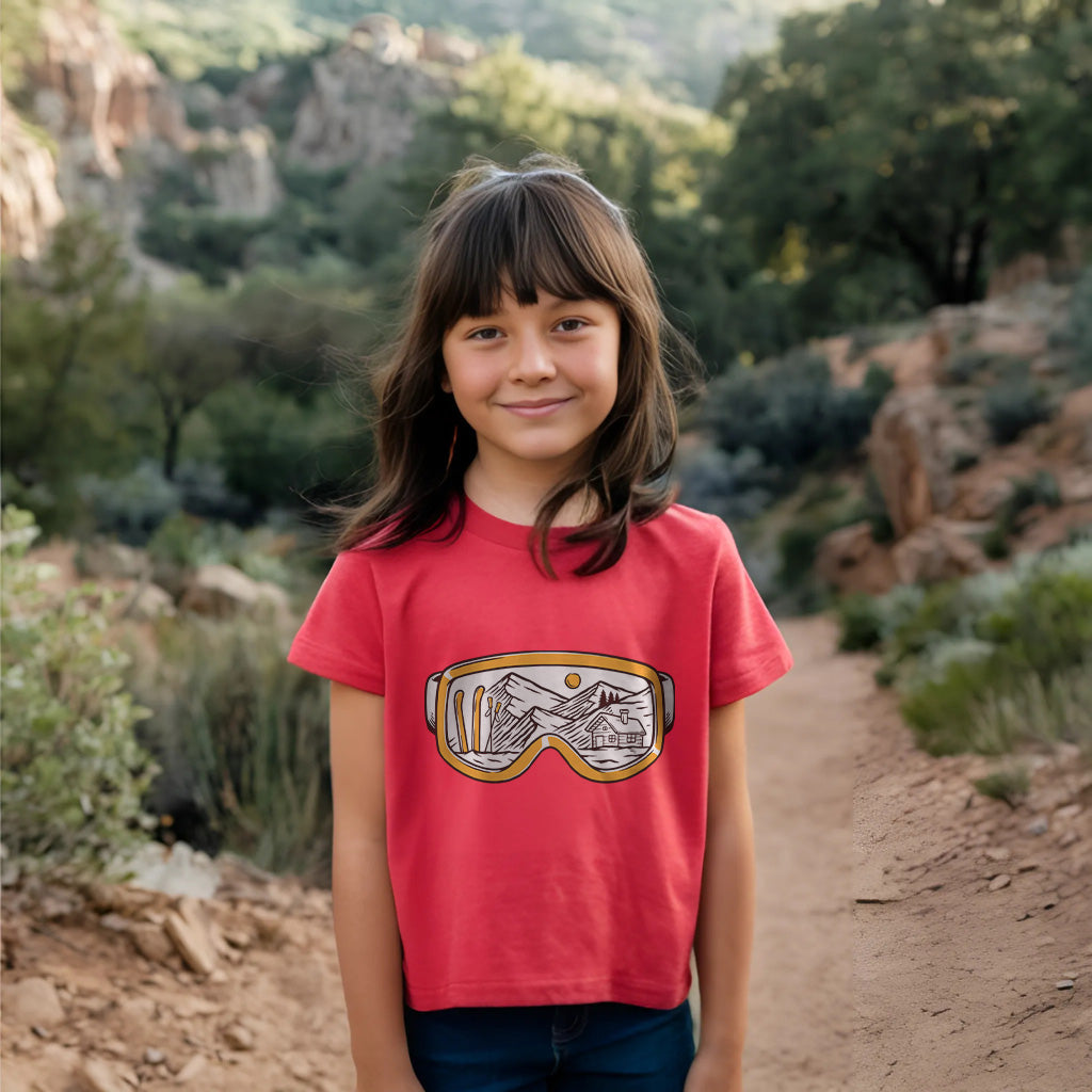 The Snowy Escape Kids Toddler Tee T-Shirt features a cool design of Snow Vision Goggles, perfect for winter adventures. Made from high-quality fabric, it ensures comfort while skiing. This tee is a must-have for kids who love snow goggles and skiing goggles.