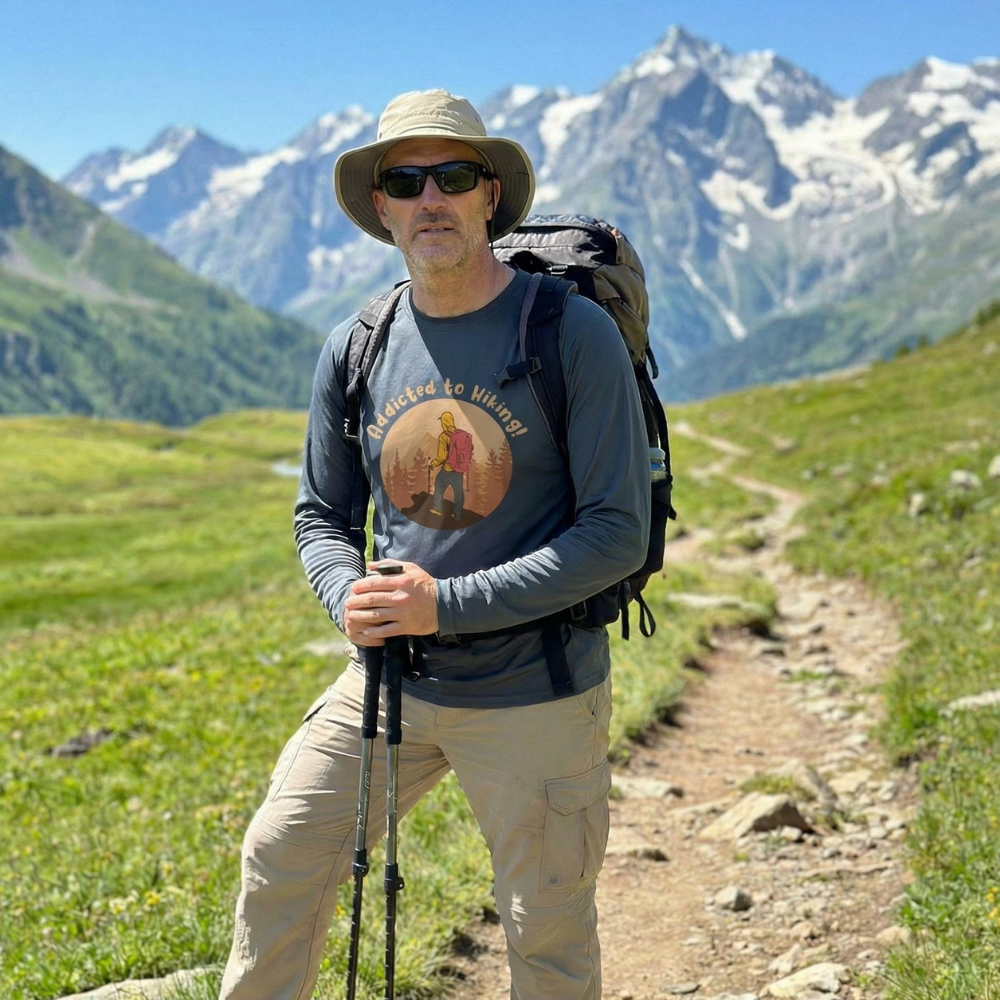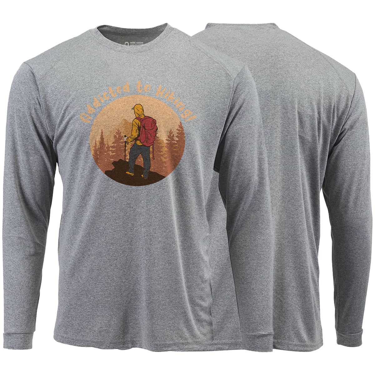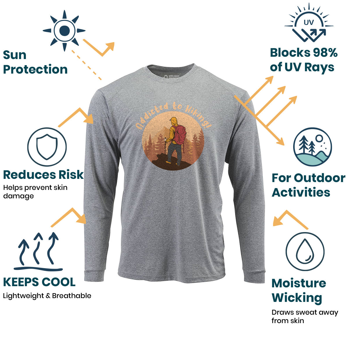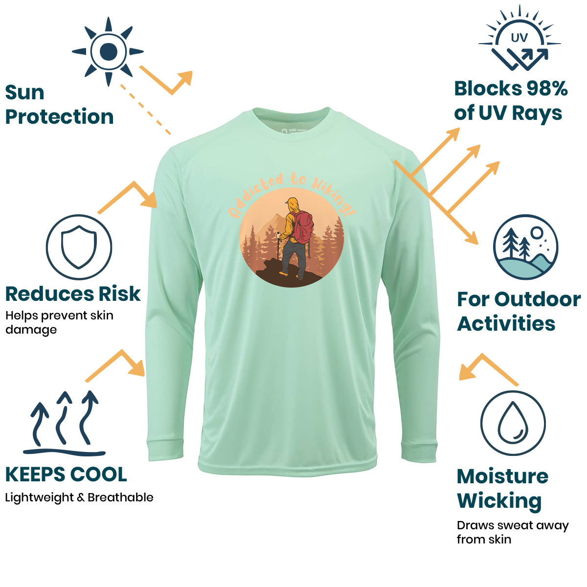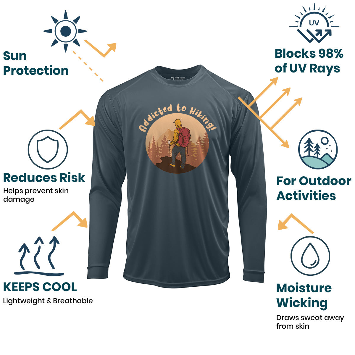 Stay protected on your hiking adventures with the Hooked on Hiking Adventures Sun Protection UV Performance Shirt UPF 50+. Show your funny mountain hiking spirit with this shirt that hikes with a sense of humor. Mountains demand respect, but jokes on mountain hiking are always welcome.