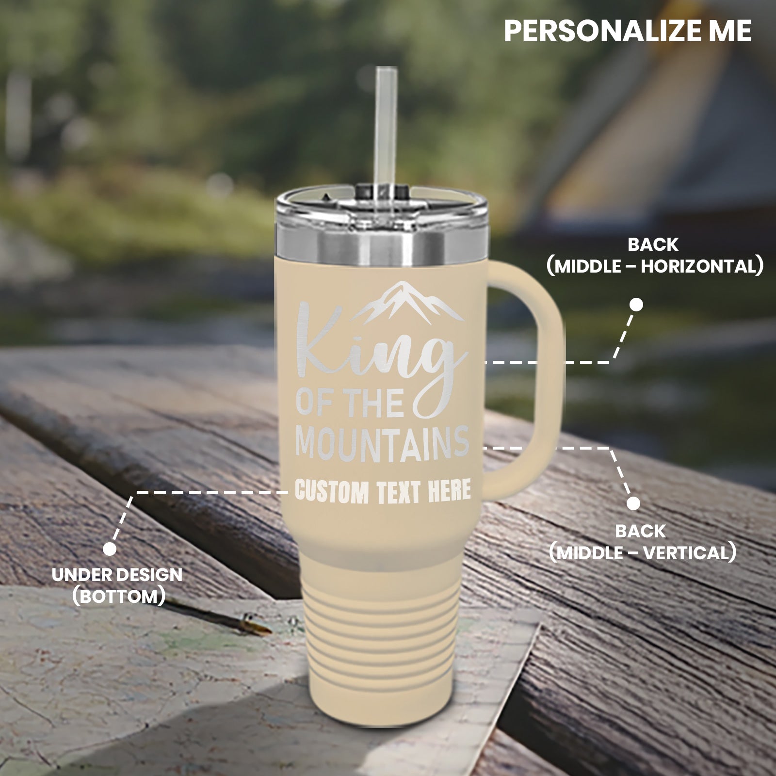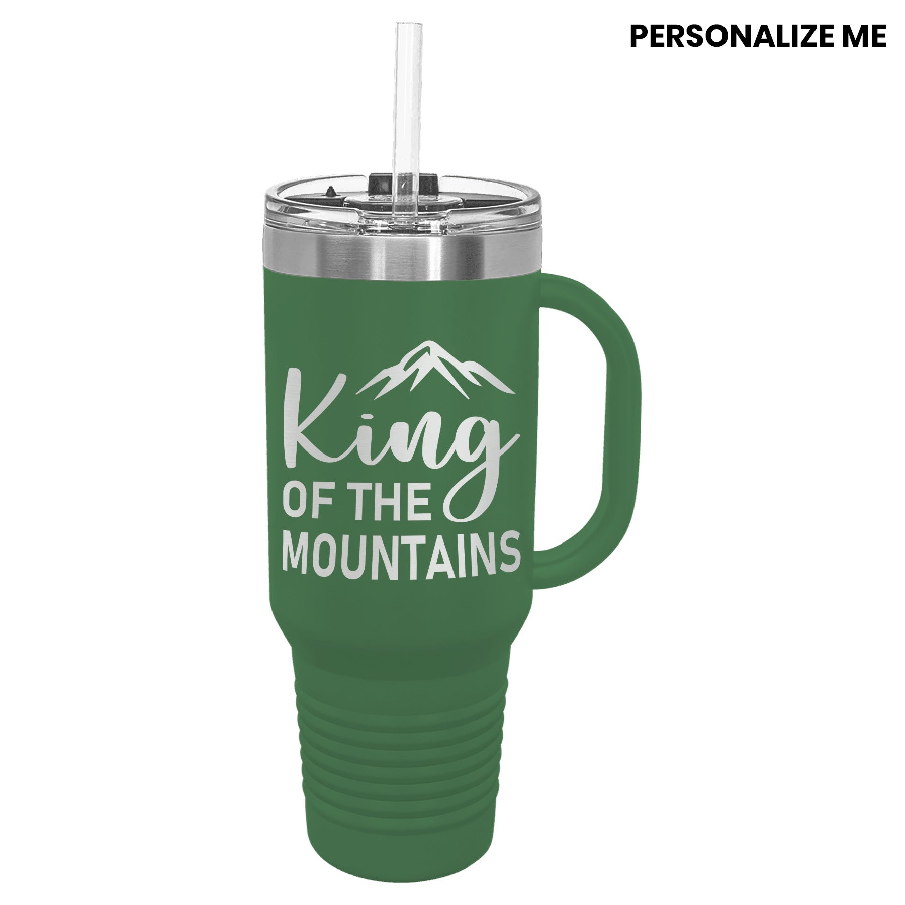 Conquer the Mountains Tumbler with Handle is a must-have for Trail Kings and Mountain Explorers. This tumbler features a Fearless King of Peaks design, perfect for hiking mountains and outdoor adventurers.
