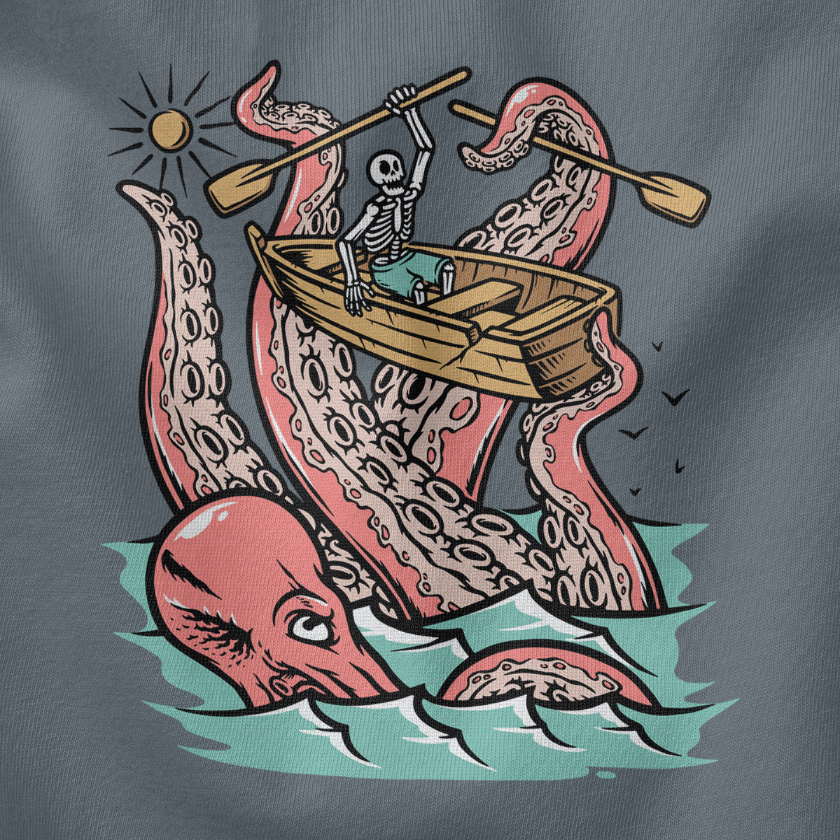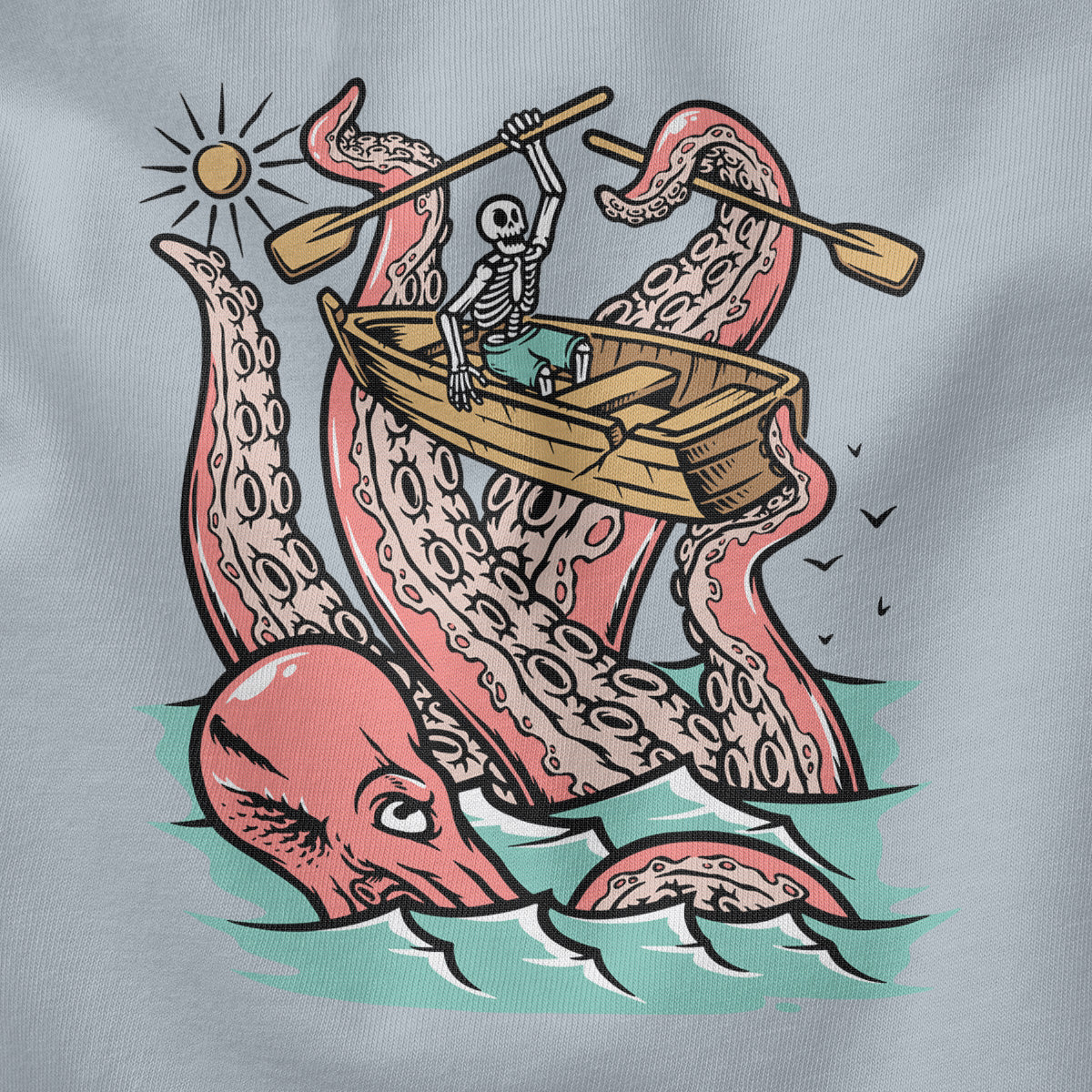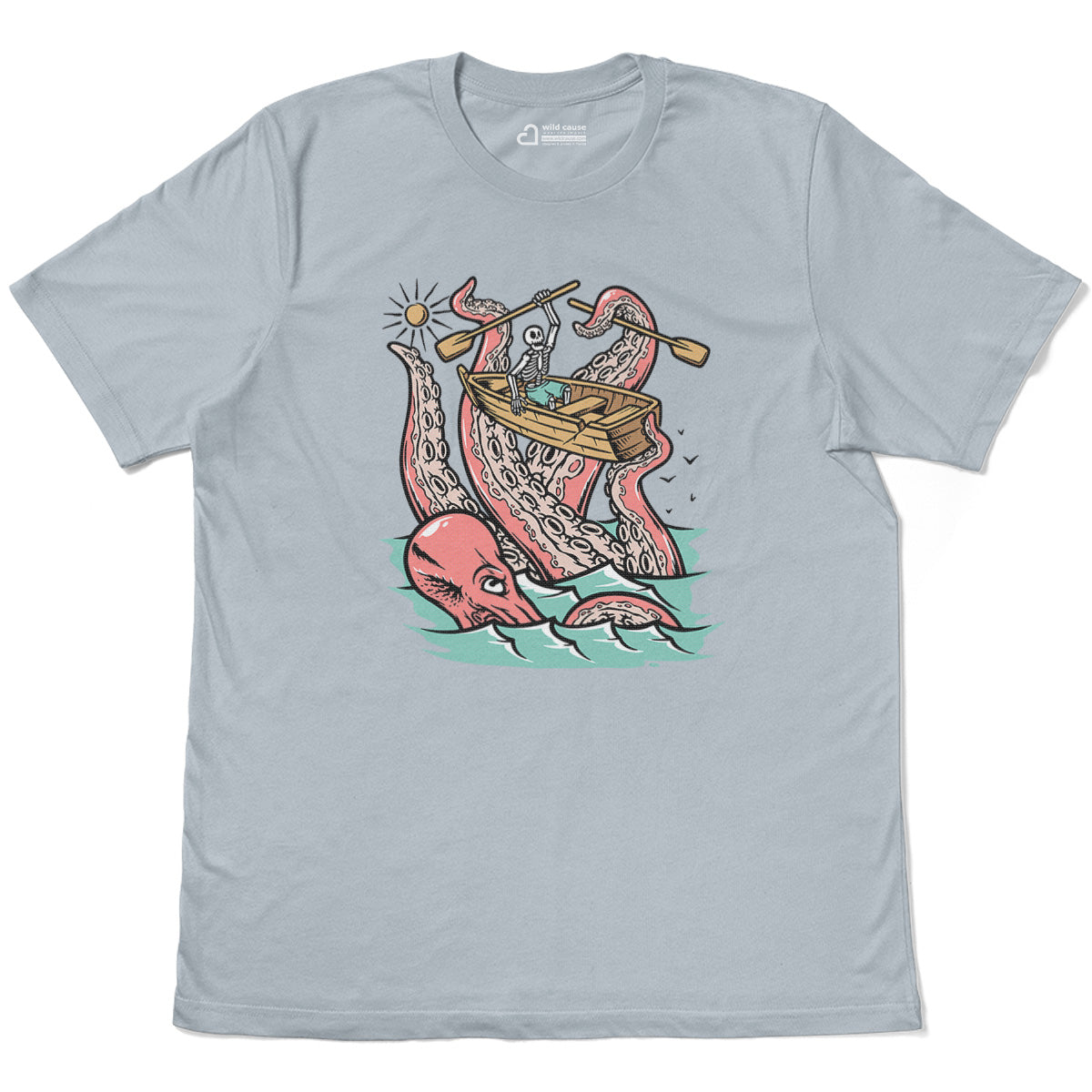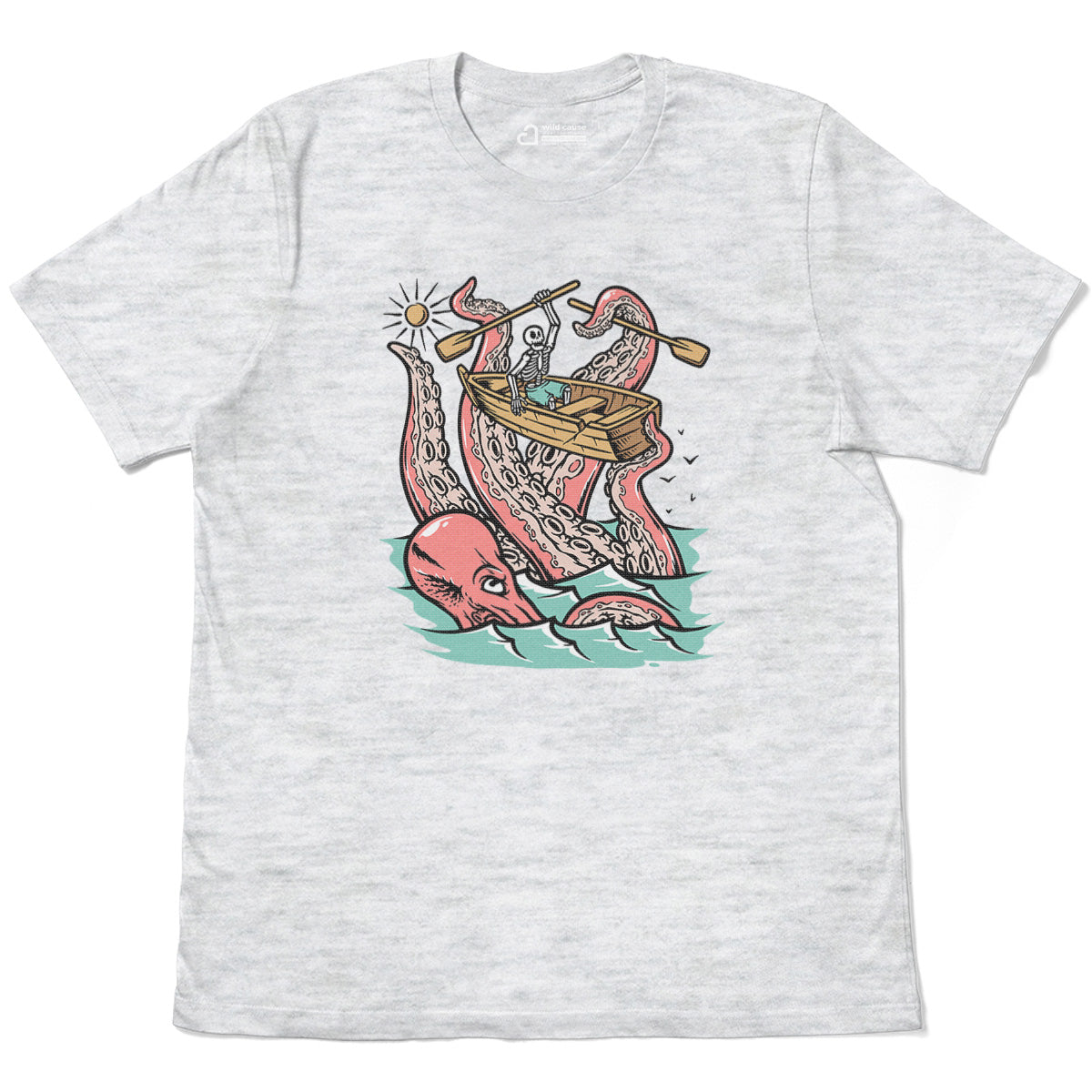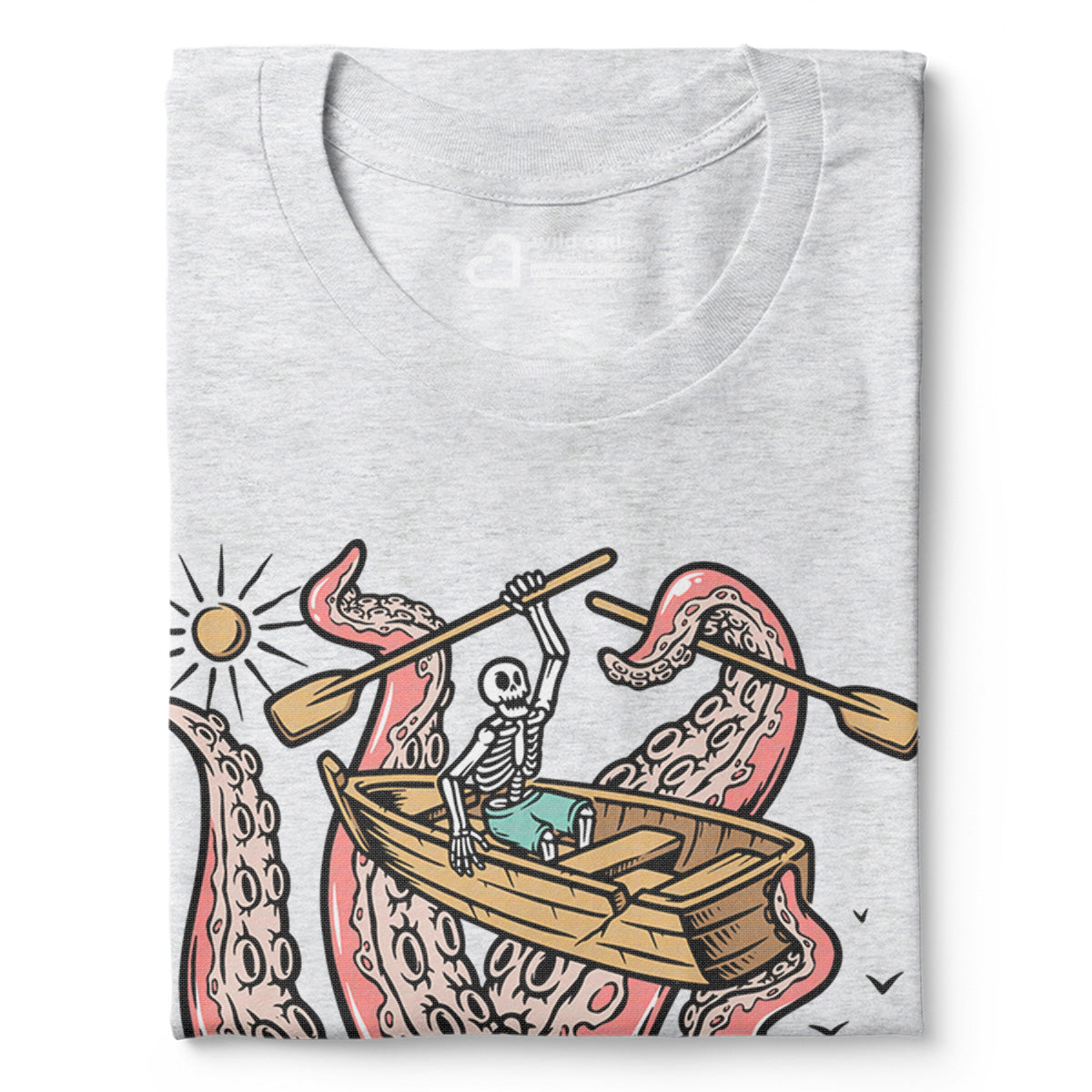 Embark on a sea adventure with giant octopus fun Adult Cotton Tee T-Shirt. This design exudes skeleton exploring fun and adventure vibes, perfect for those seeking spooky skeleton exploration time.