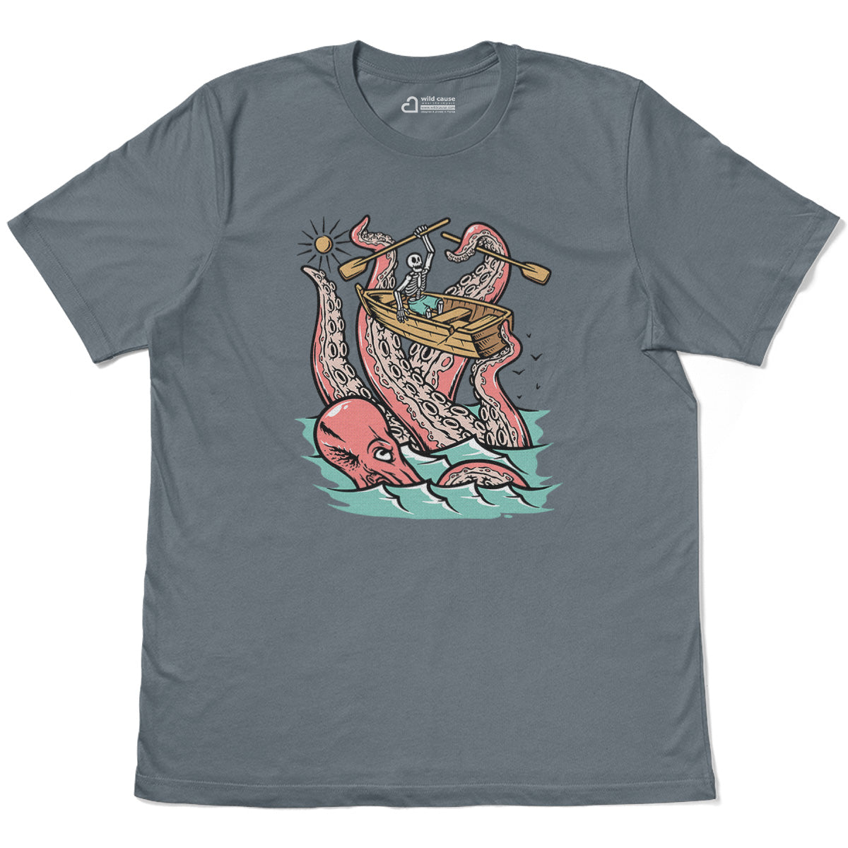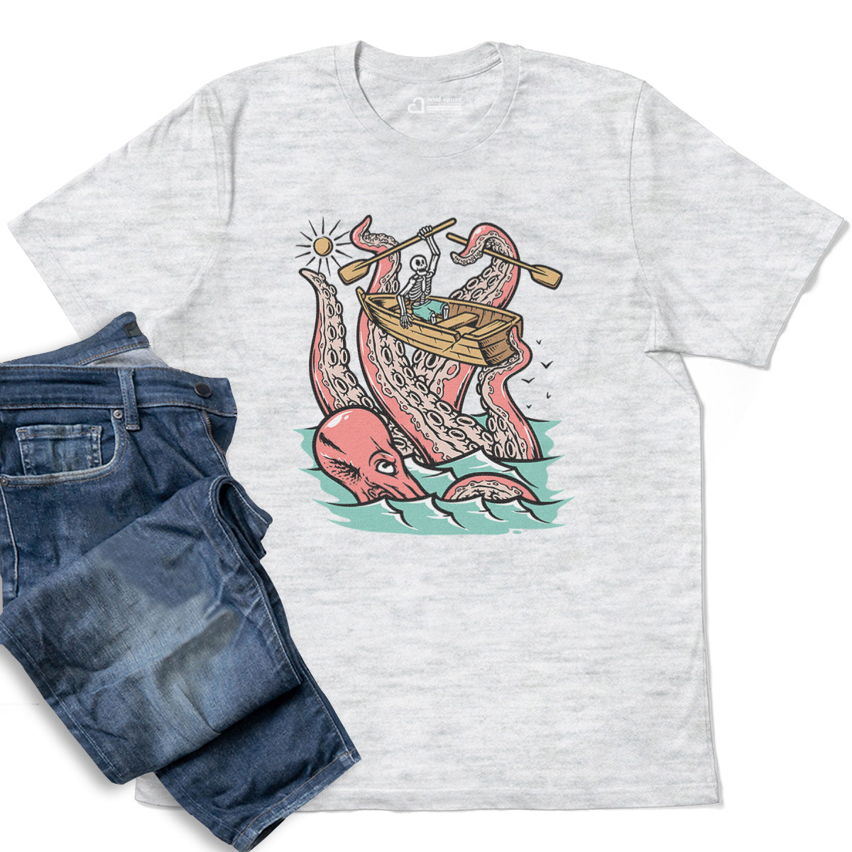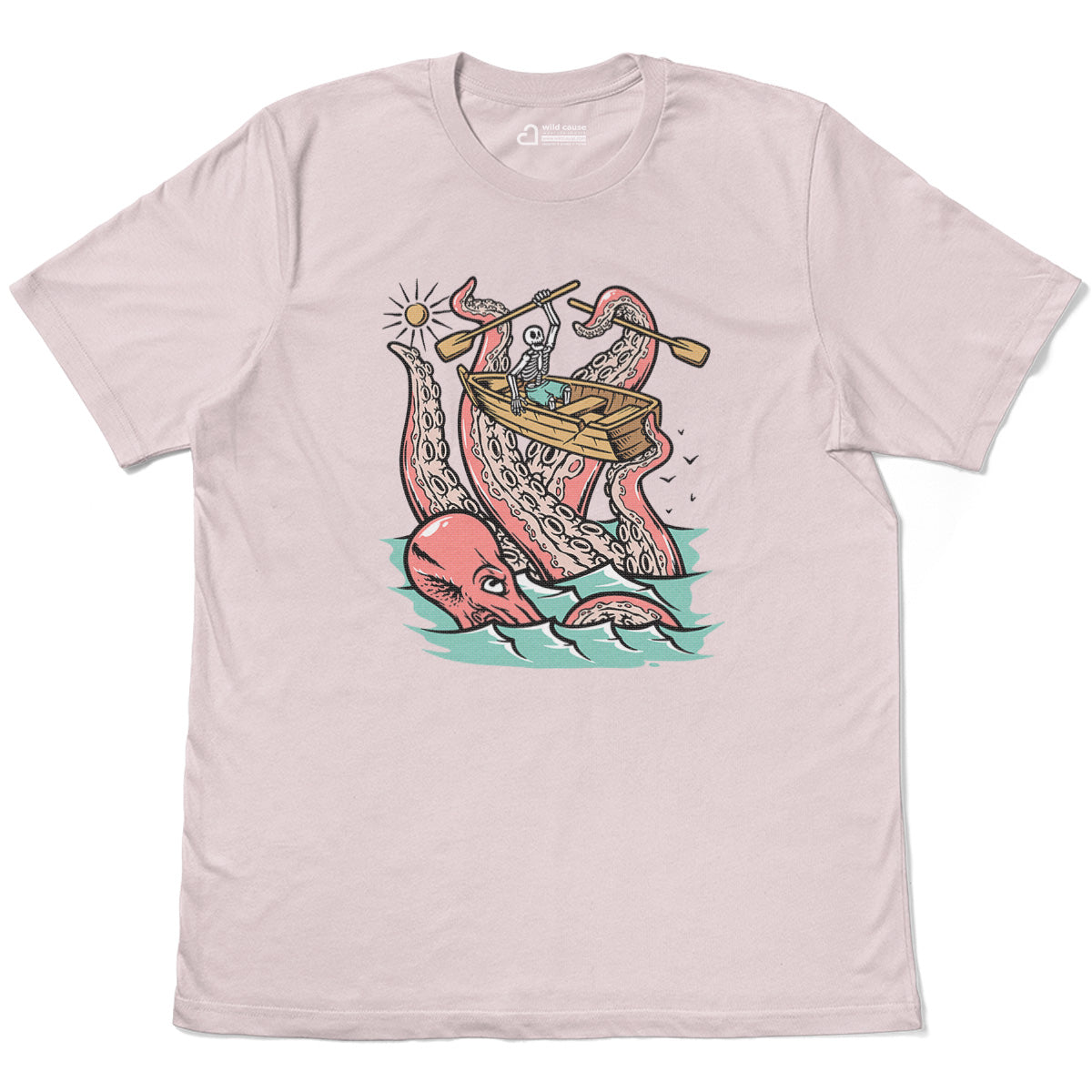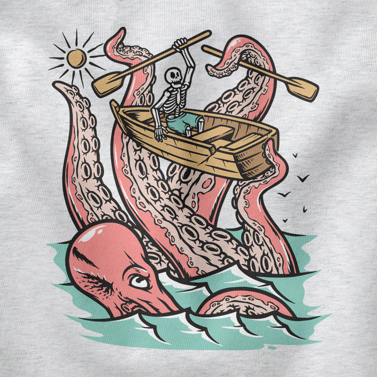 Embark on a sea adventure with giant octopus fun Adult Cotton Tee T-Shirt. This design exudes skeleton exploring fun and adventure vibes, perfect for those seeking spooky skeleton exploration time.