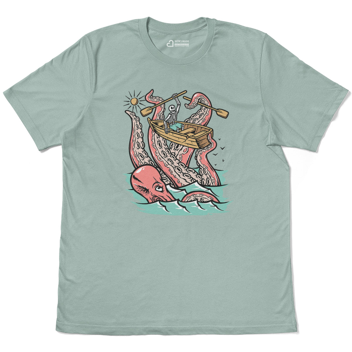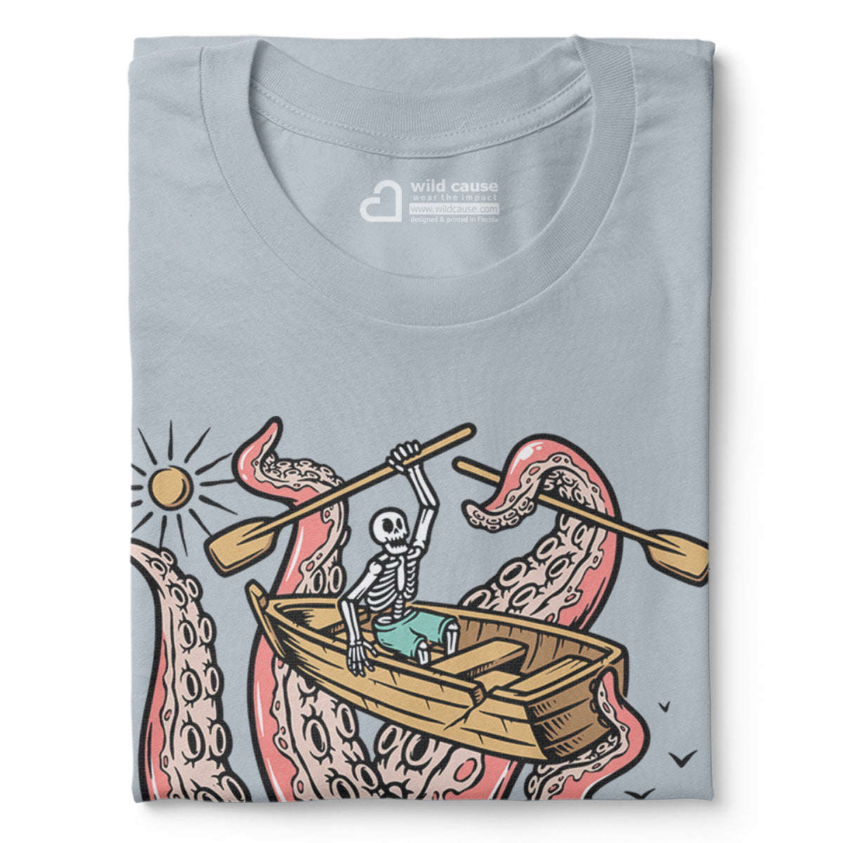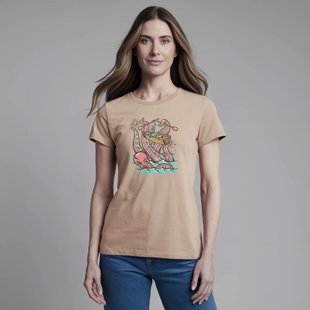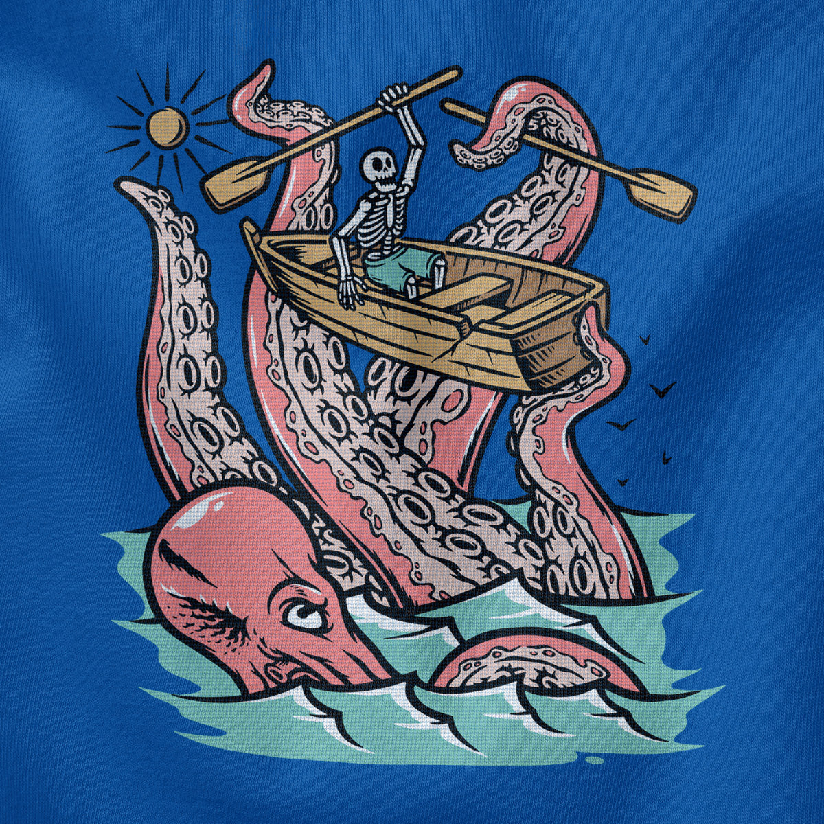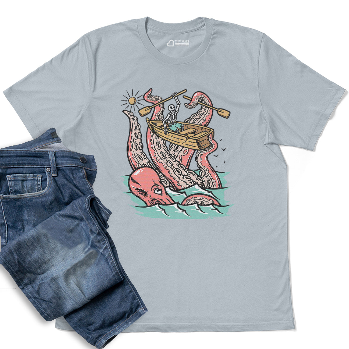 Embark on a sea adventure with giant octopus fun Adult Cotton Tee T-Shirt. This design exudes skeleton exploring fun and adventure vibes, perfect for those seeking spooky skeleton exploration time.