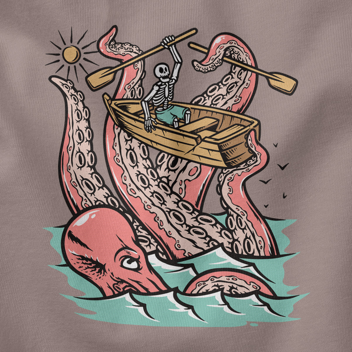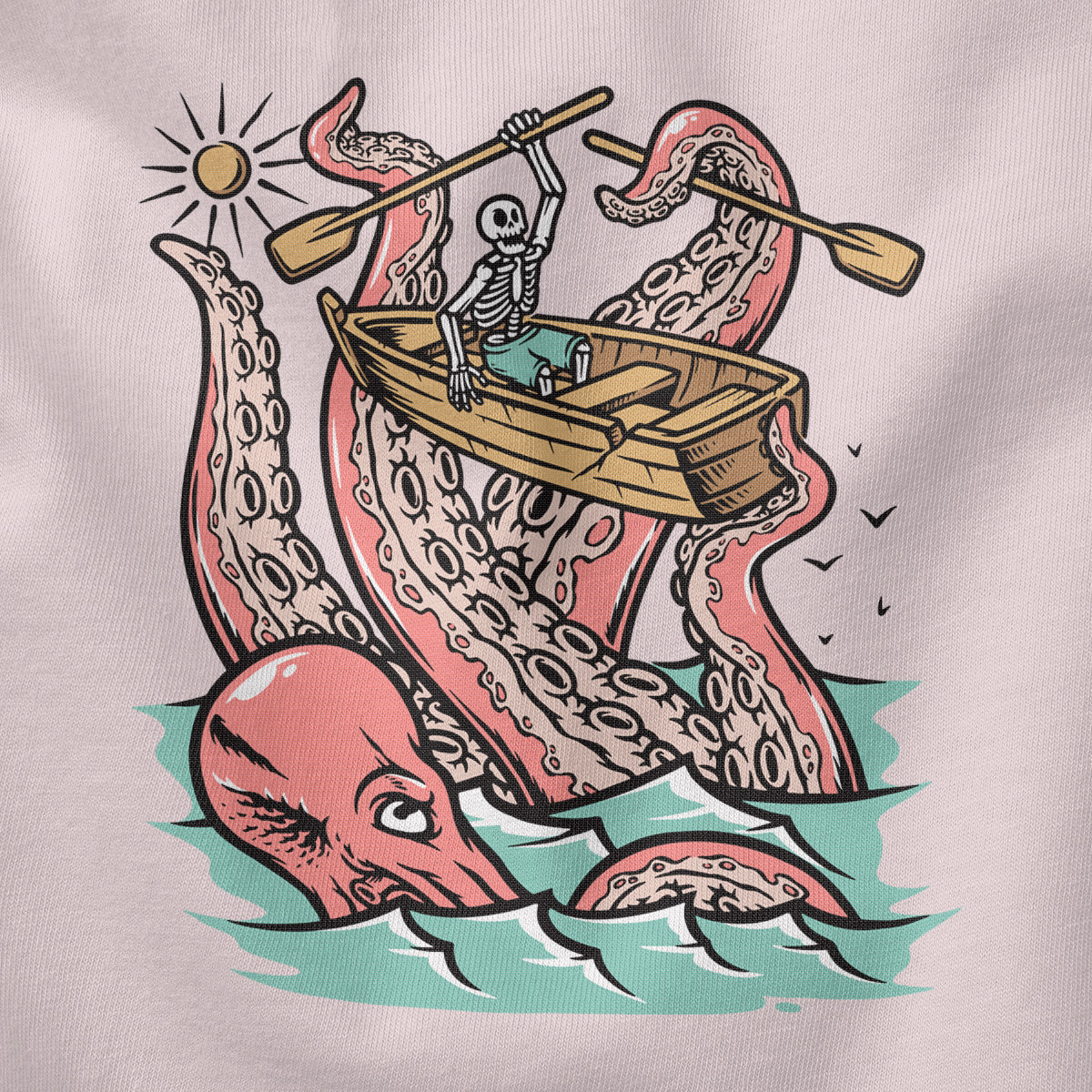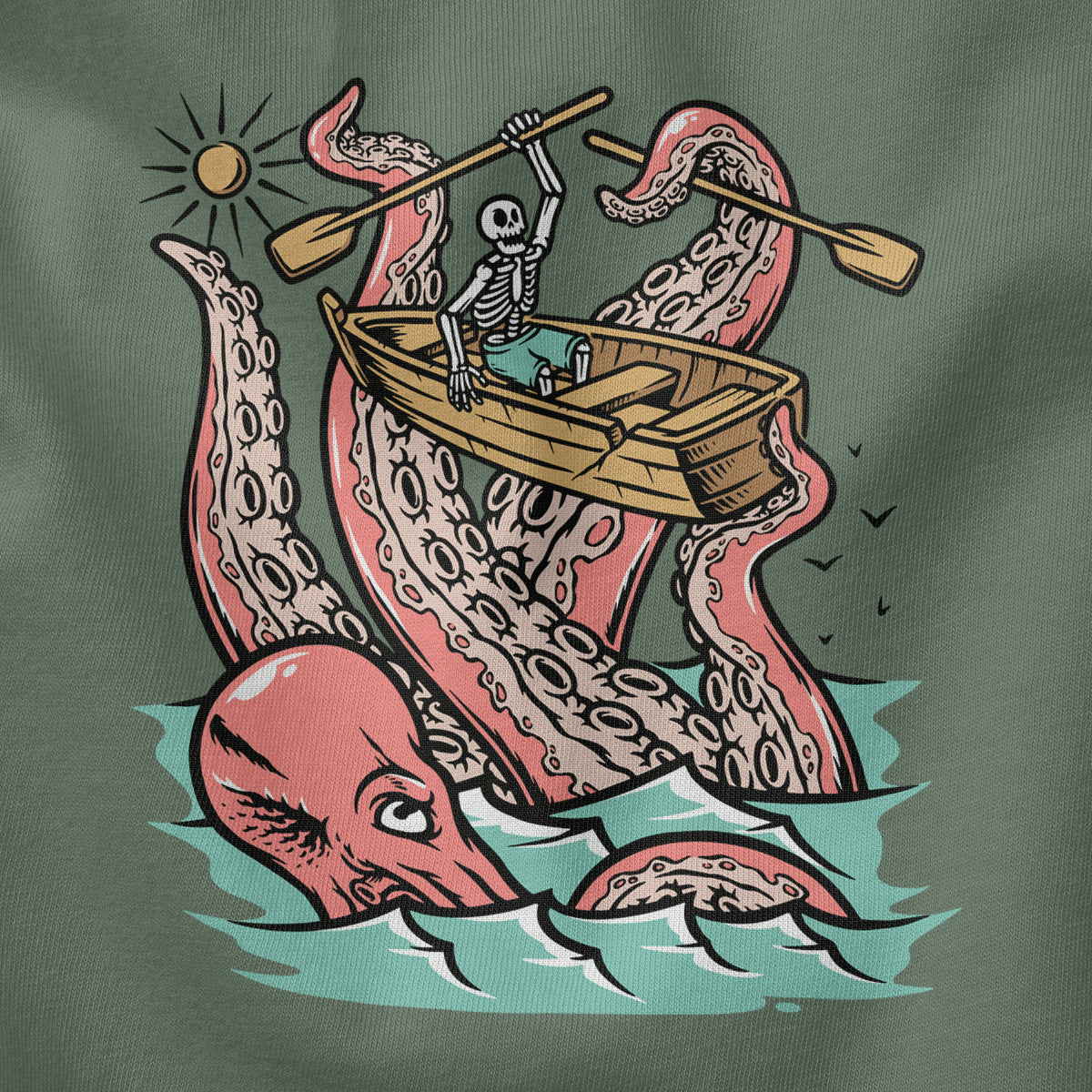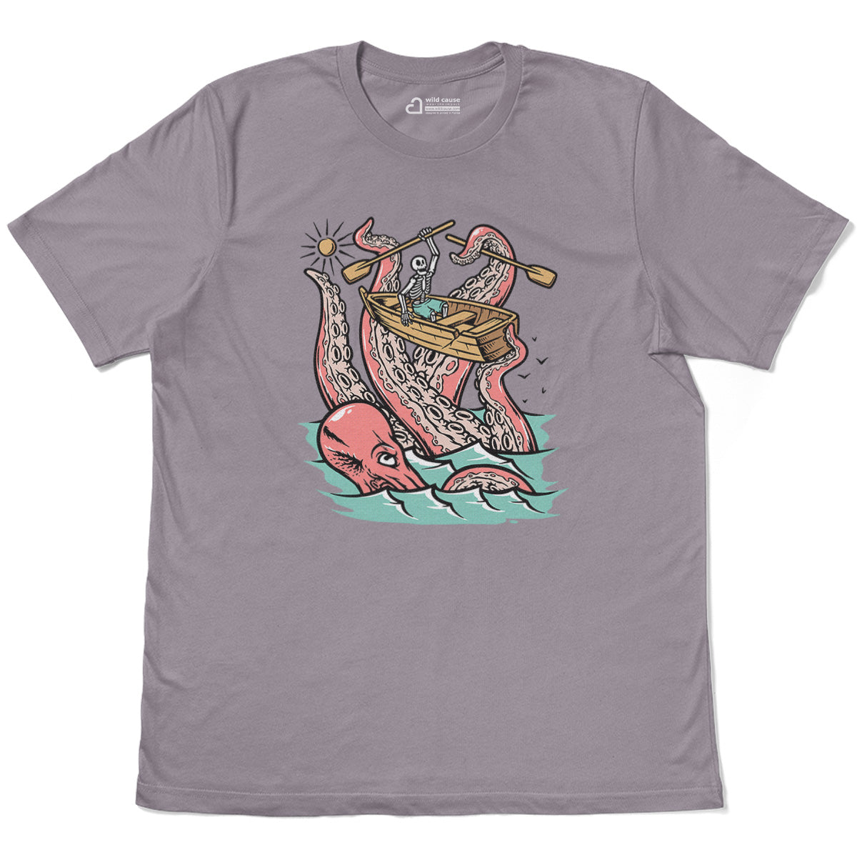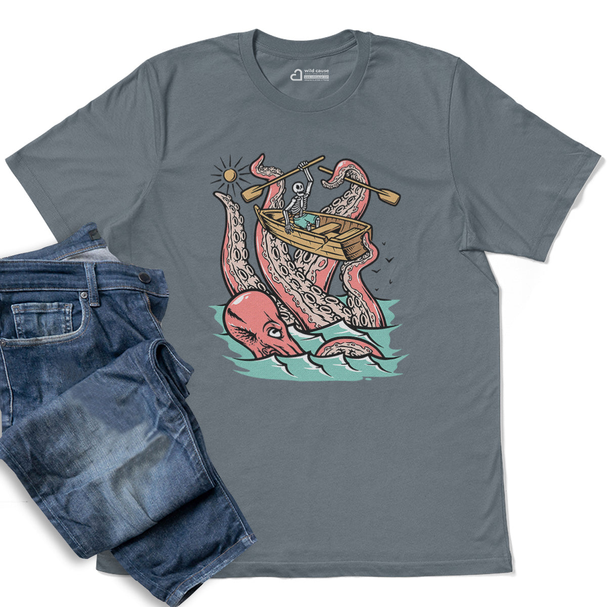 Embark on a sea adventure with giant octopus fun Adult Cotton Tee T-Shirt. This design exudes skeleton exploring fun and adventure vibes, perfect for those seeking spooky skeleton exploration time.
