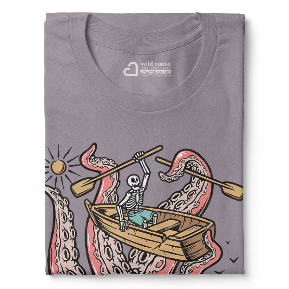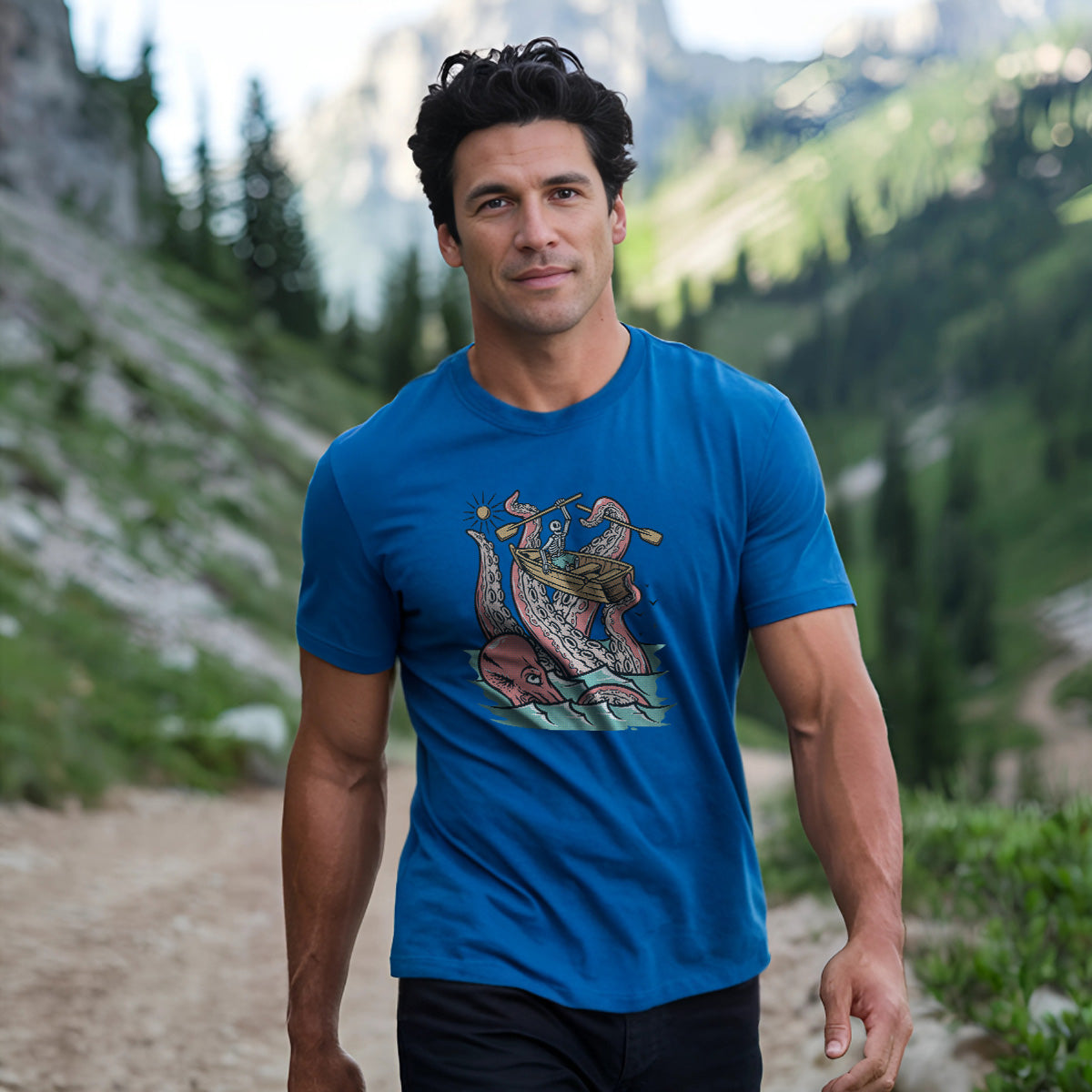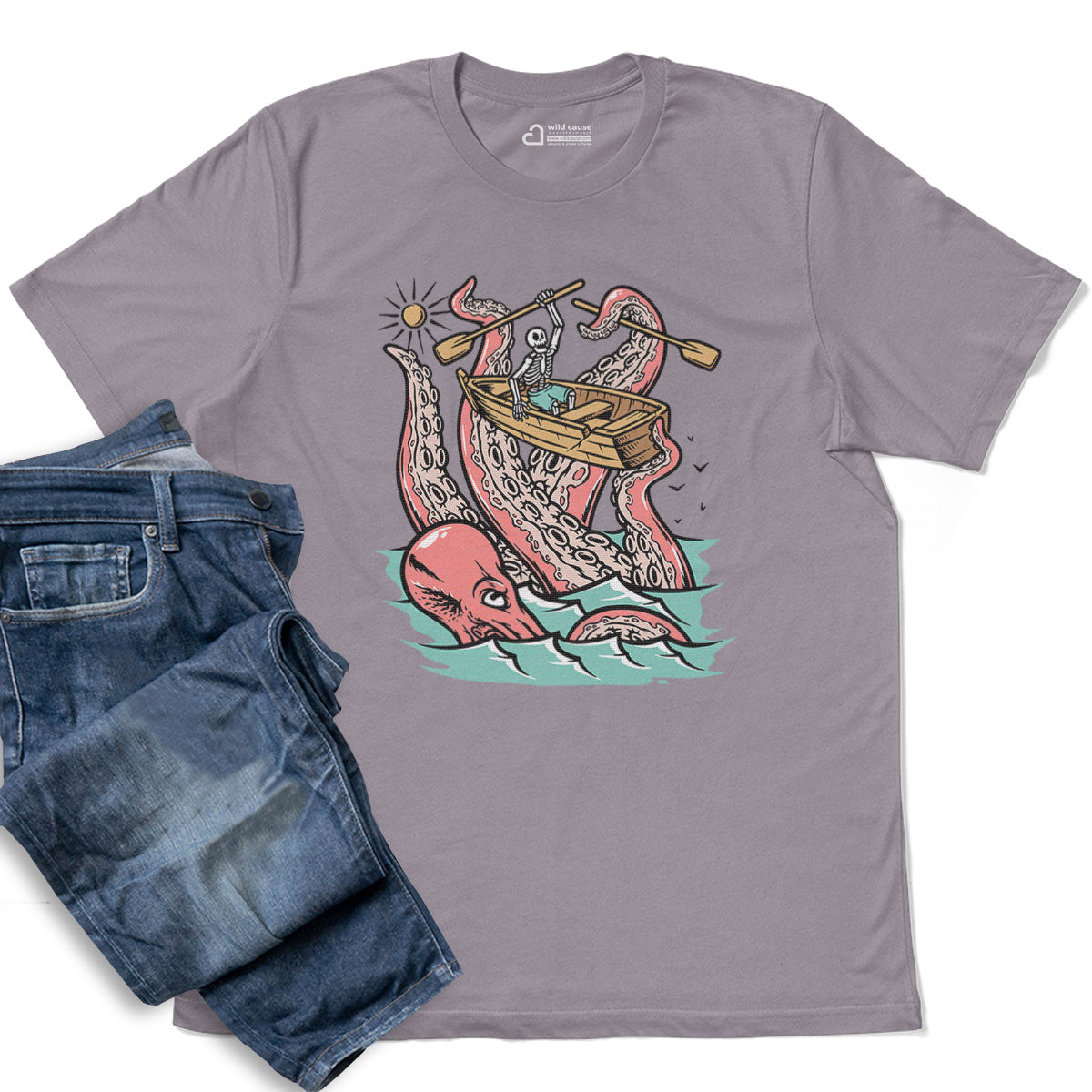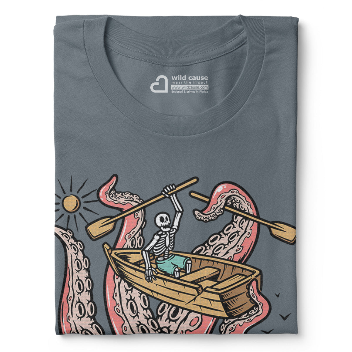 Embark on a sea adventure with giant octopus fun Adult Cotton Tee T-Shirt. This design exudes skeleton exploring fun and adventure vibes, perfect for those seeking spooky skeleton exploration time.