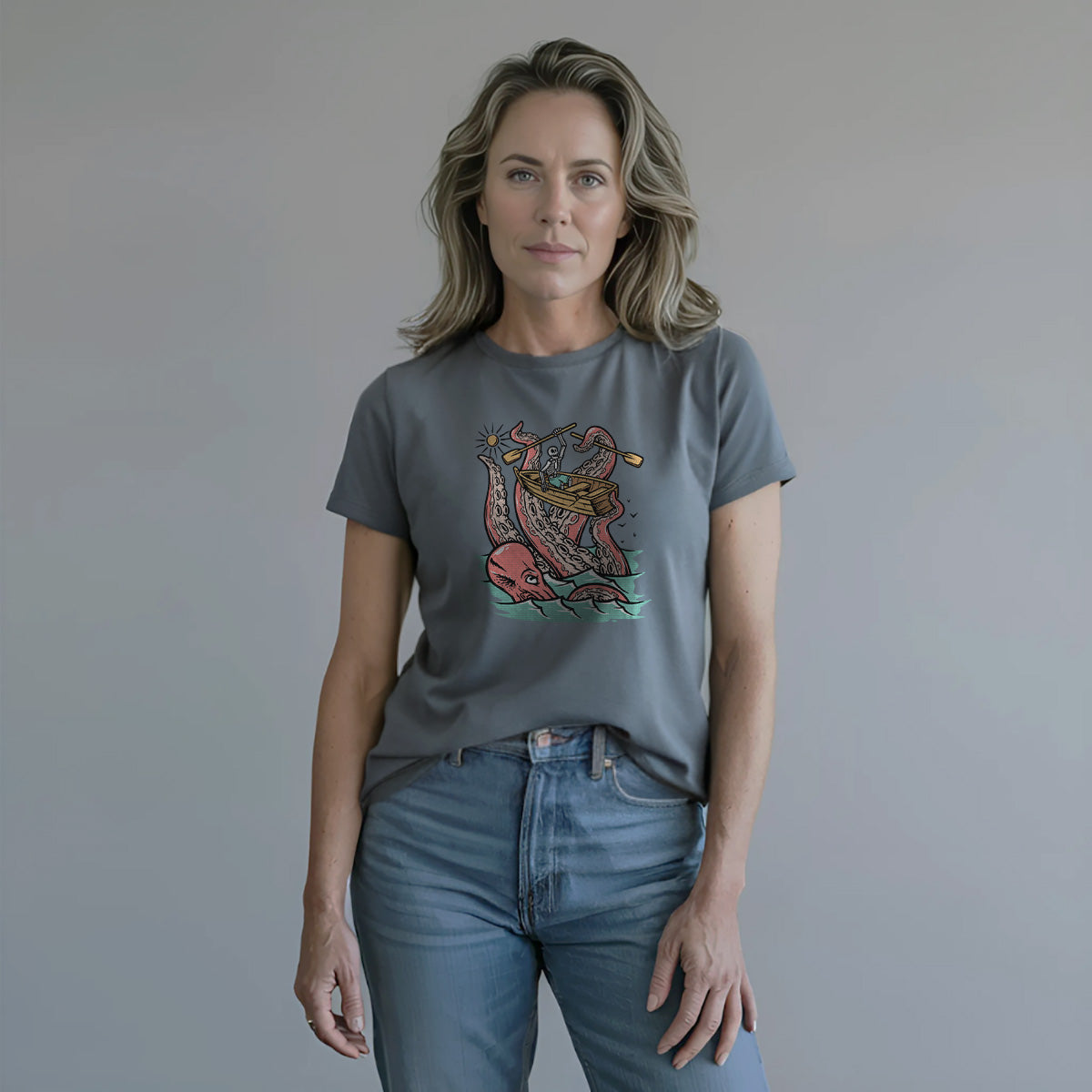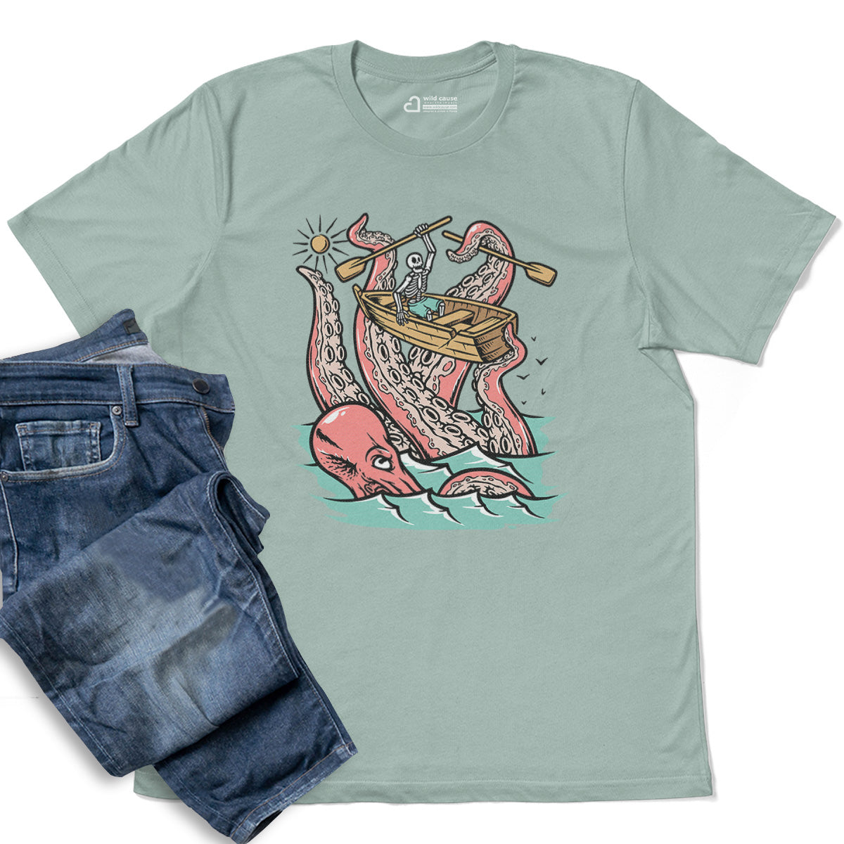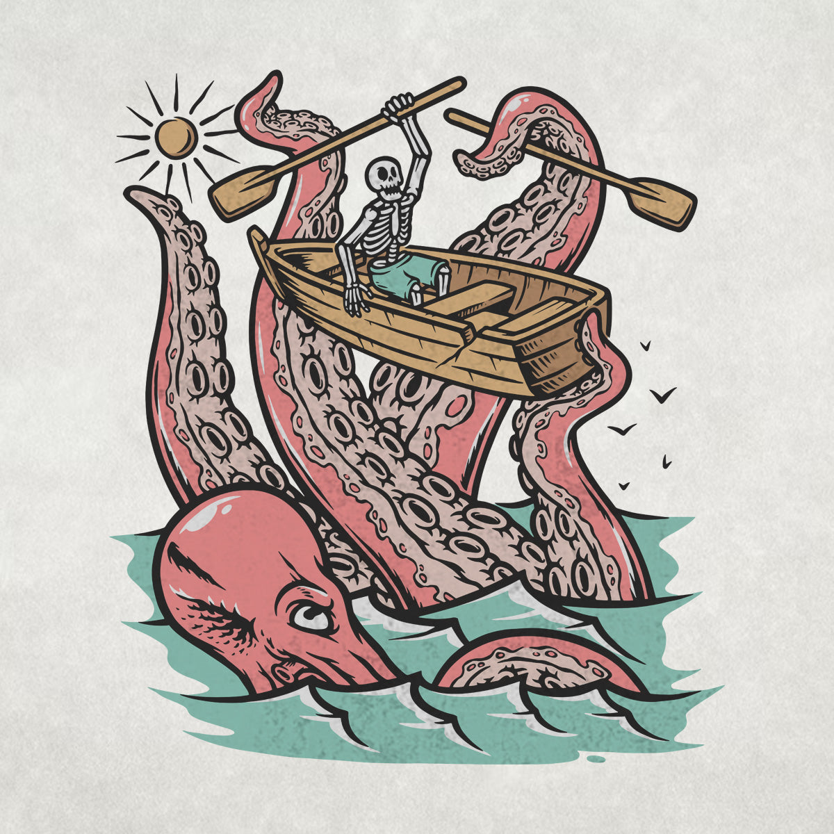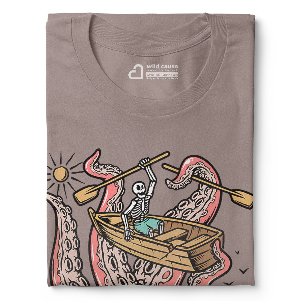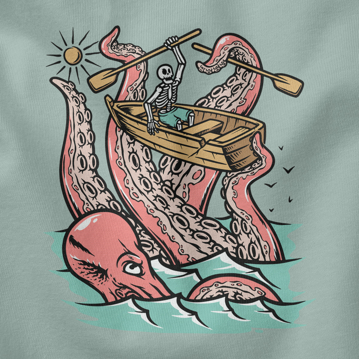 Embark on a sea adventure with giant octopus fun Adult Cotton Tee T-Shirt. This design exudes skeleton exploring fun and adventure vibes, perfect for those seeking spooky skeleton exploration time.