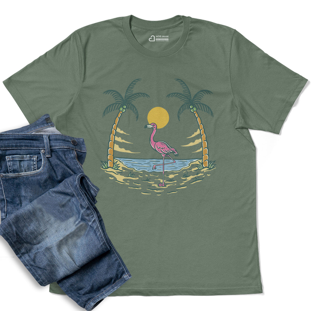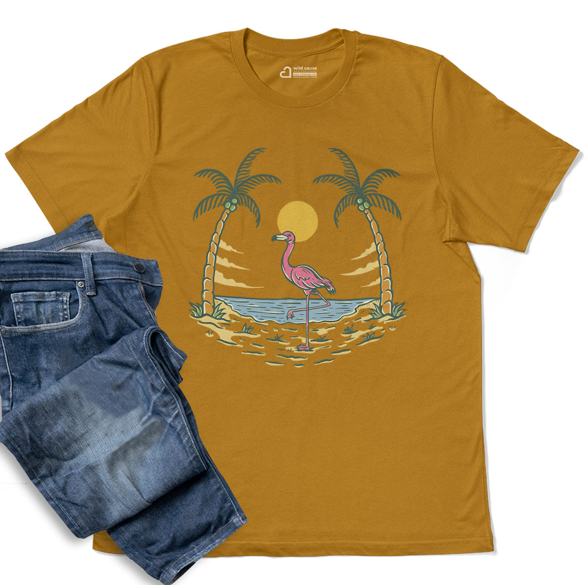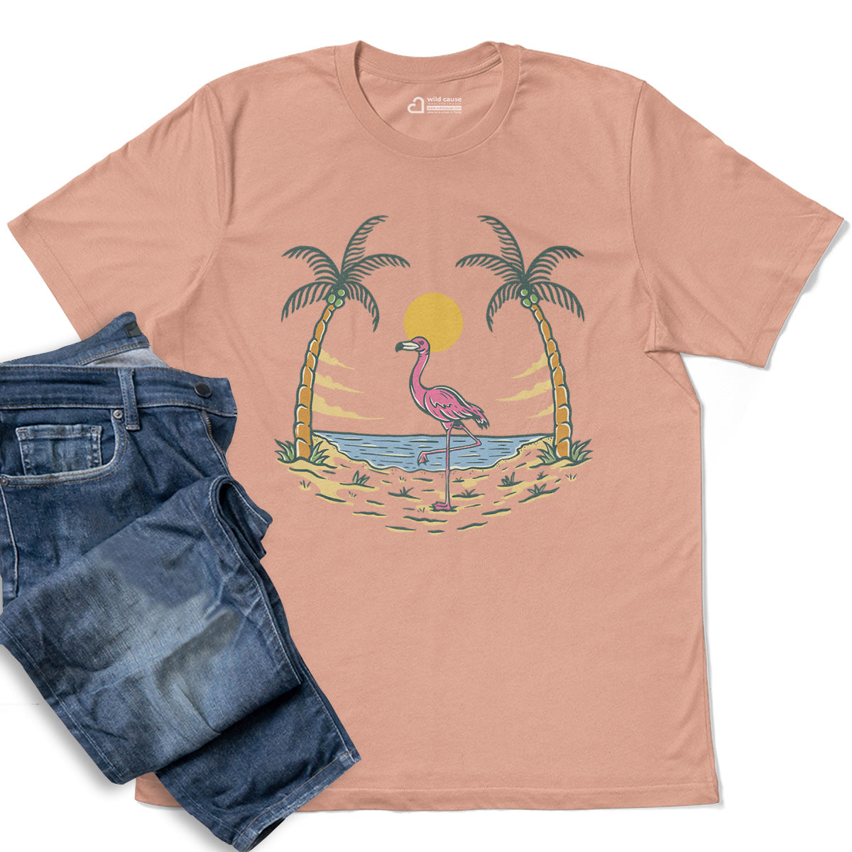 Summer vibes and beach fun await Adult Cotton Tee T-Shirt featuring the Flamingo By The Beach design. Embrace Sunset Beach Gathering with Flamingo Beach Vibes and warm Sunset Beach Days. This Pink Bird Loves Sunset tee is perfect for beach lovers.
