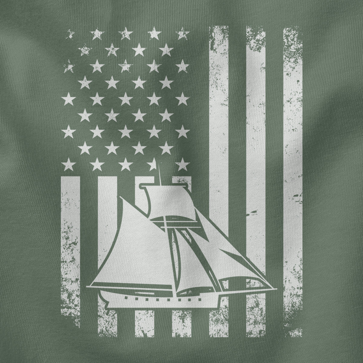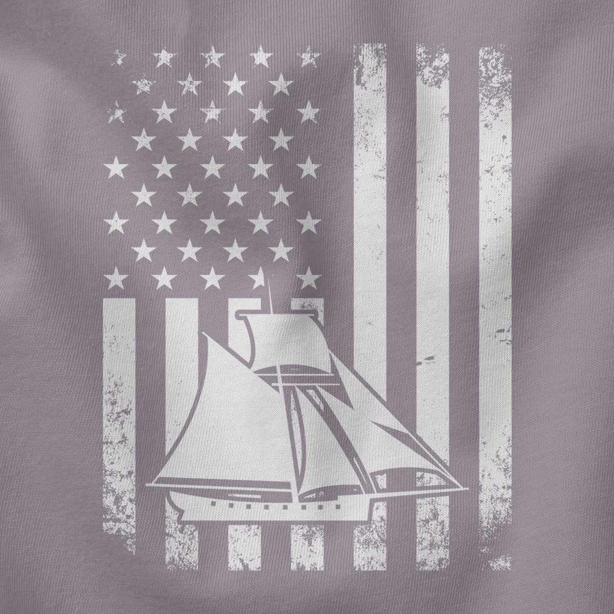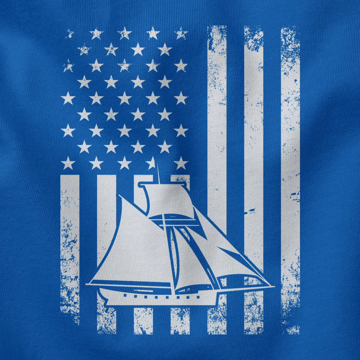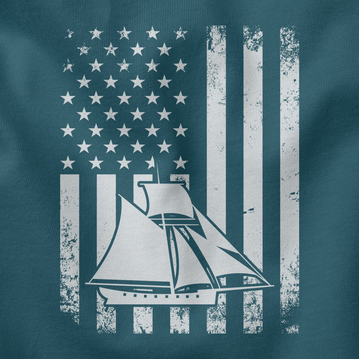 Embark on a pontoon adventure with the USA flag Adult Cotton Tee T-Shirt. Show off your patriotic American pride with this stylish design featuring the American flag and ship. Perfect for ocean sailing adventures and historic sailing enthusiasts.