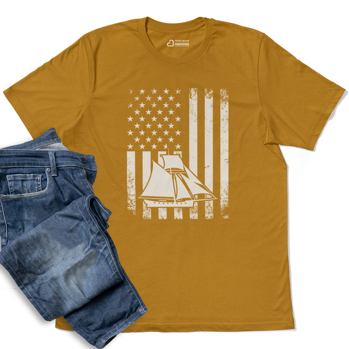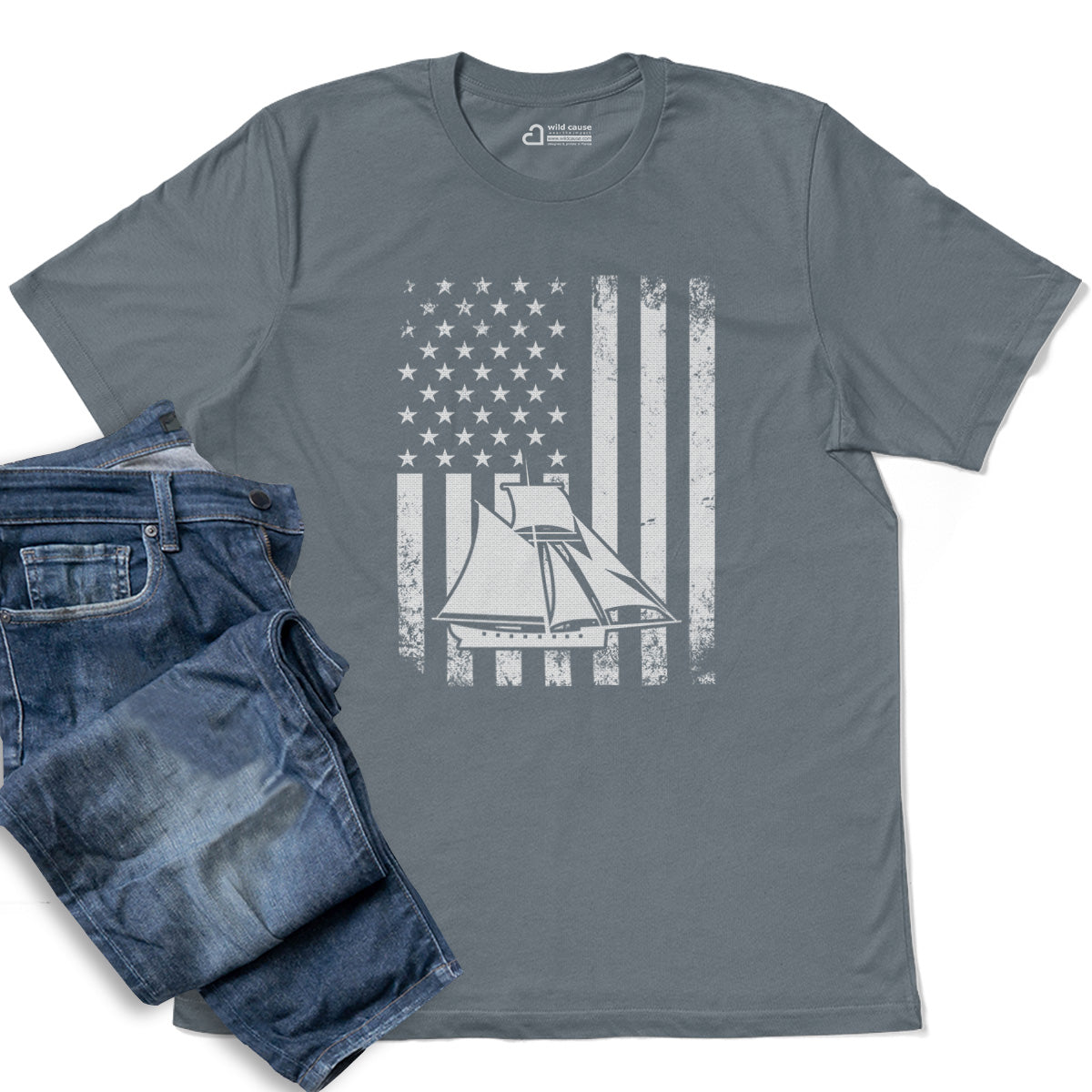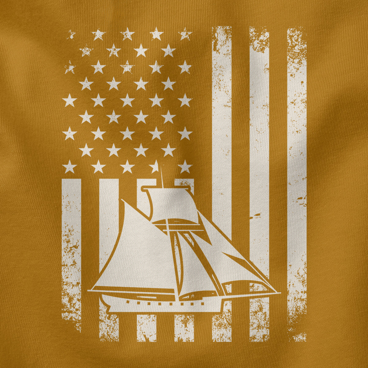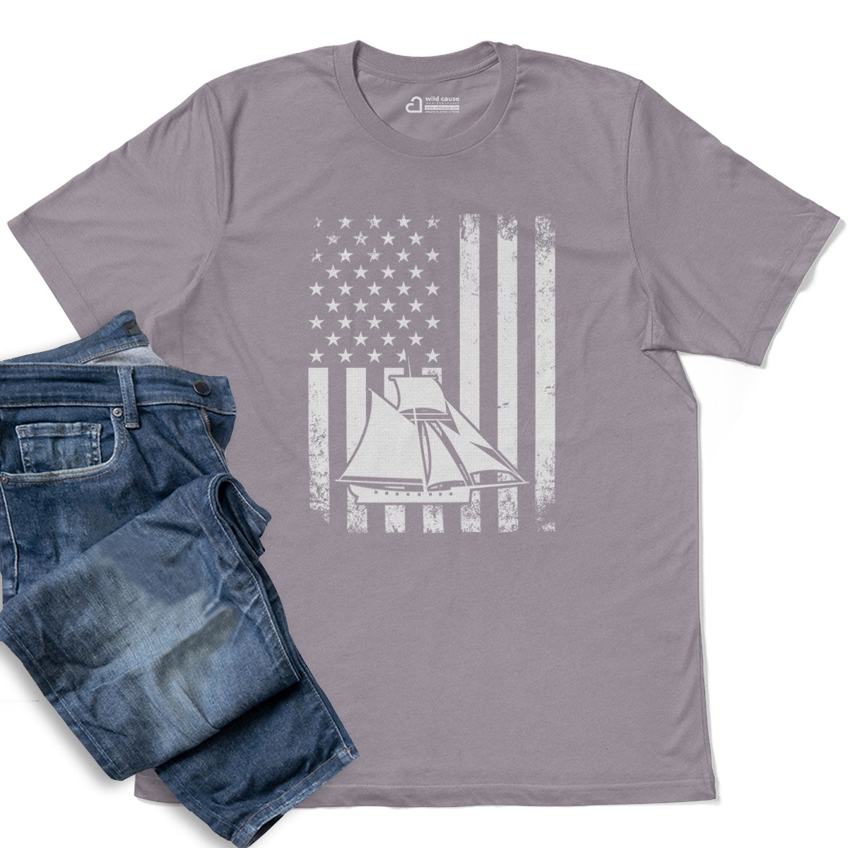 Embark on a pontoon adventure with the USA flag Adult Cotton Tee T-Shirt. Show off your patriotic American pride with this stylish design featuring the American flag and ship. Perfect for ocean sailing adventures and historic sailing enthusiasts.