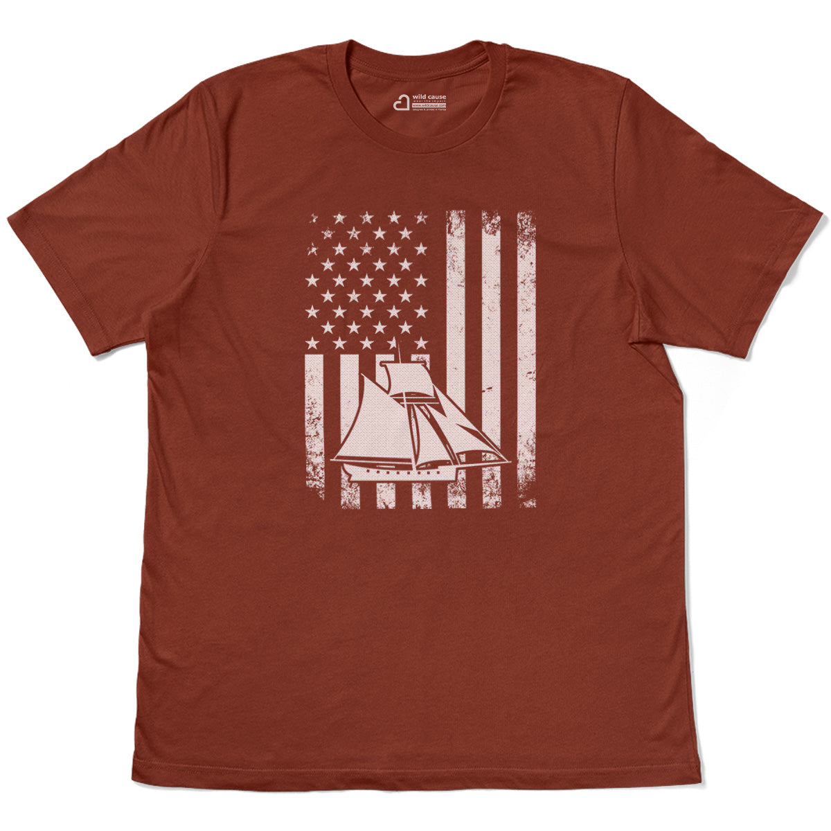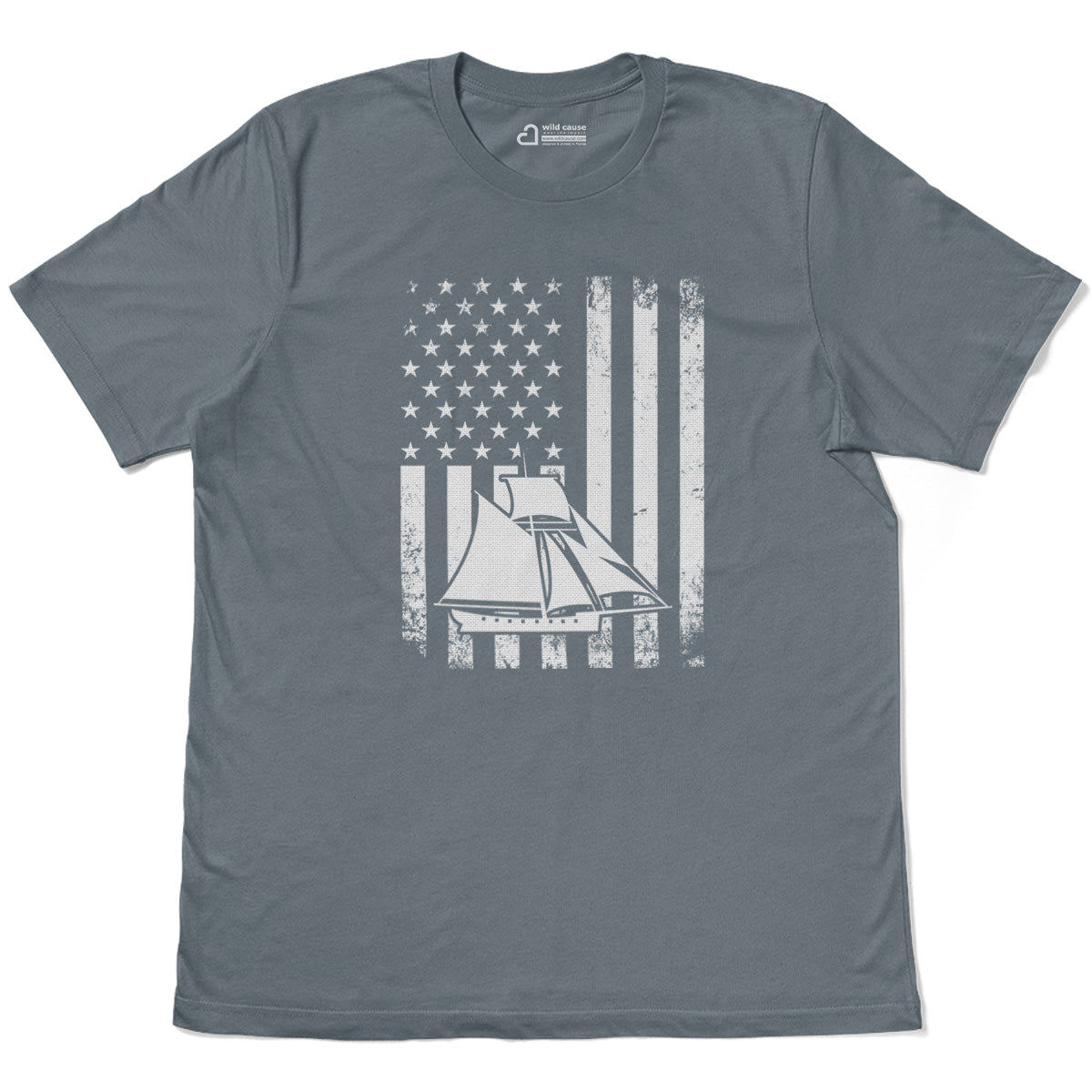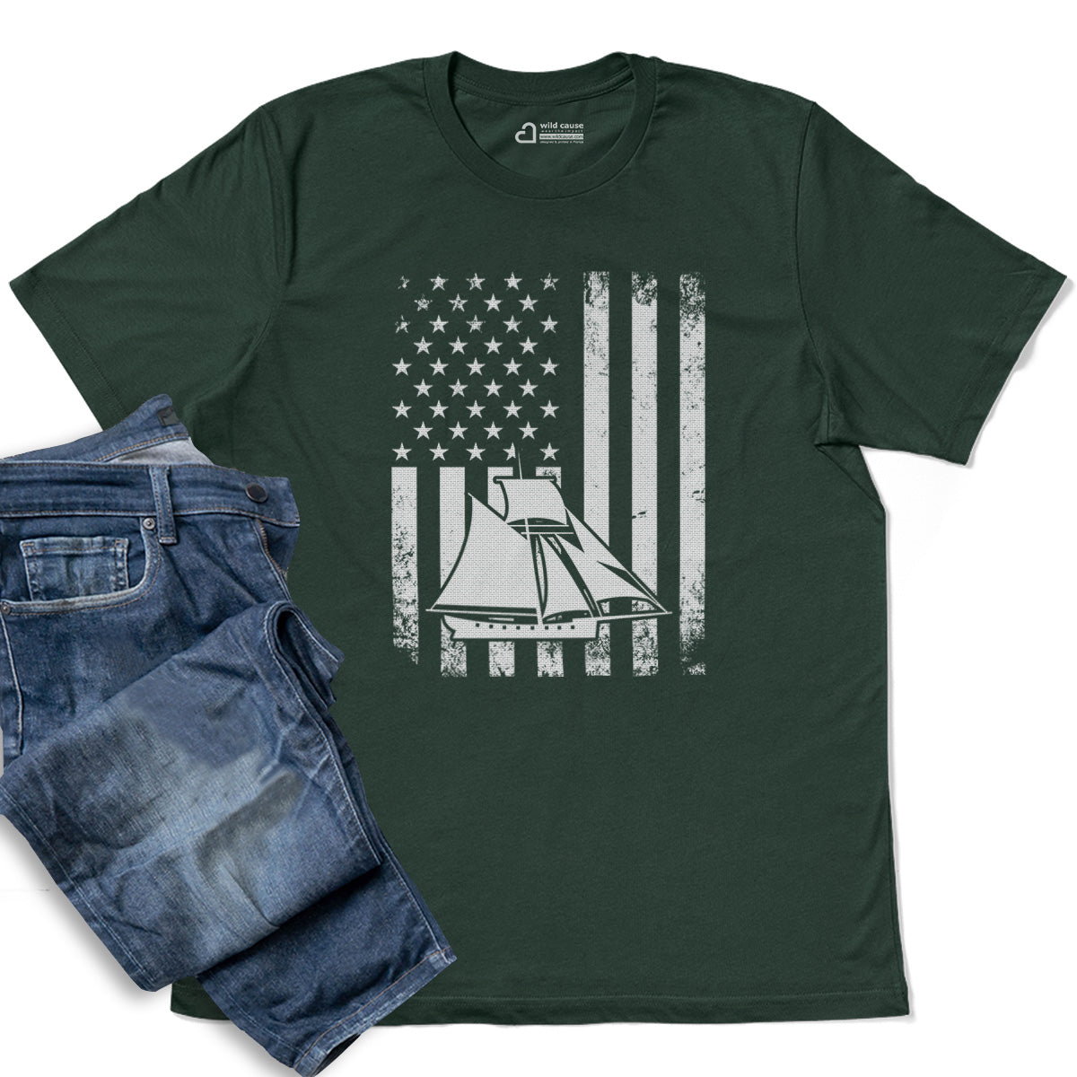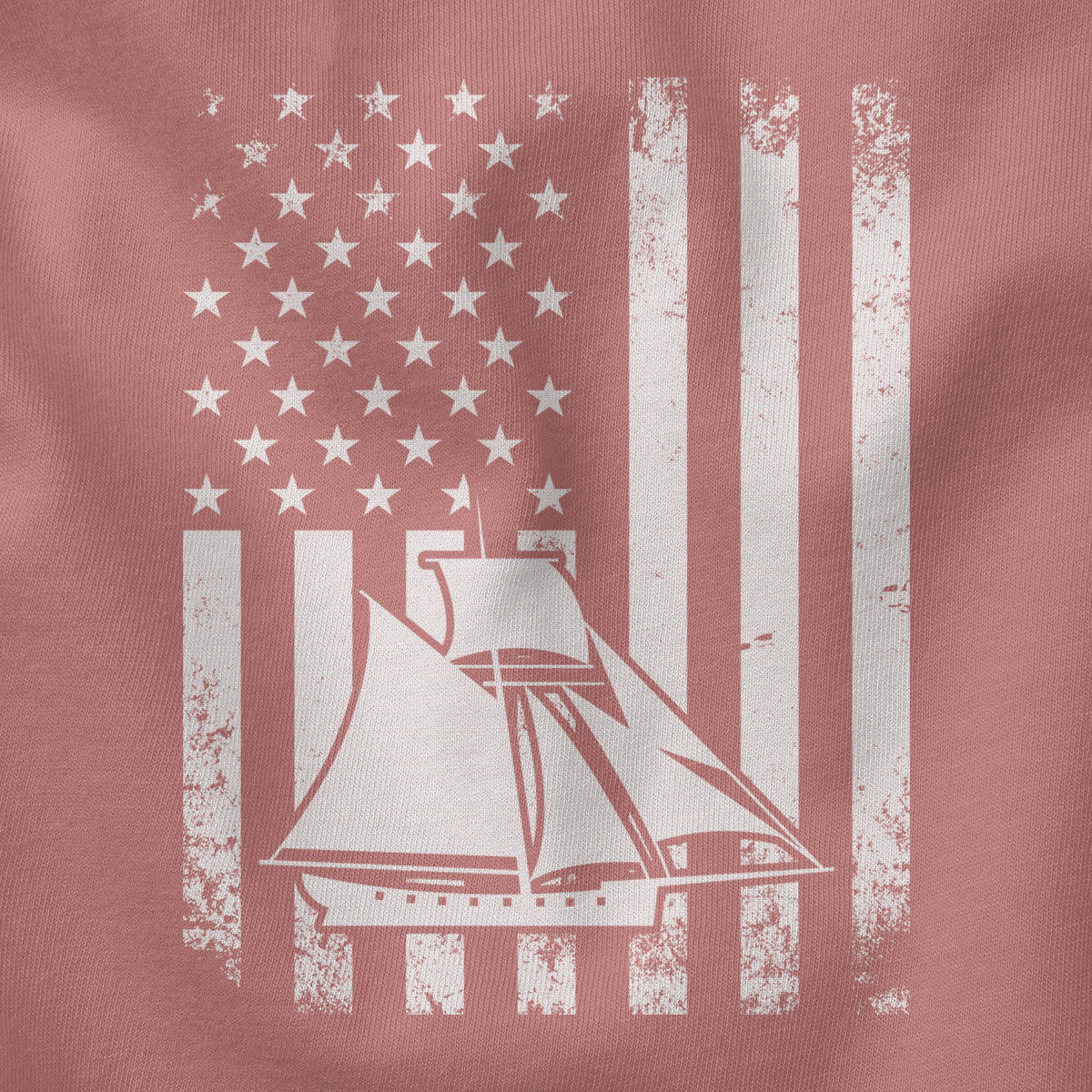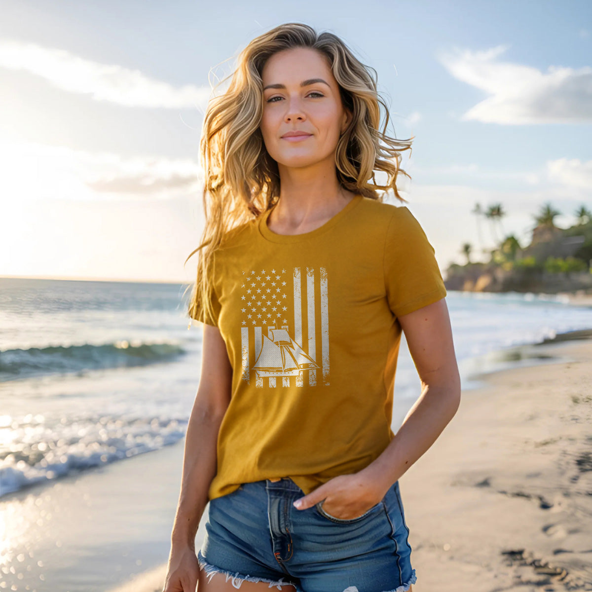 Embark on a pontoon adventure with the USA flag Adult Cotton Tee T-Shirt. Show off your patriotic American pride with this stylish design featuring the American flag and ship. Perfect for ocean sailing adventures and historic sailing enthusiasts.