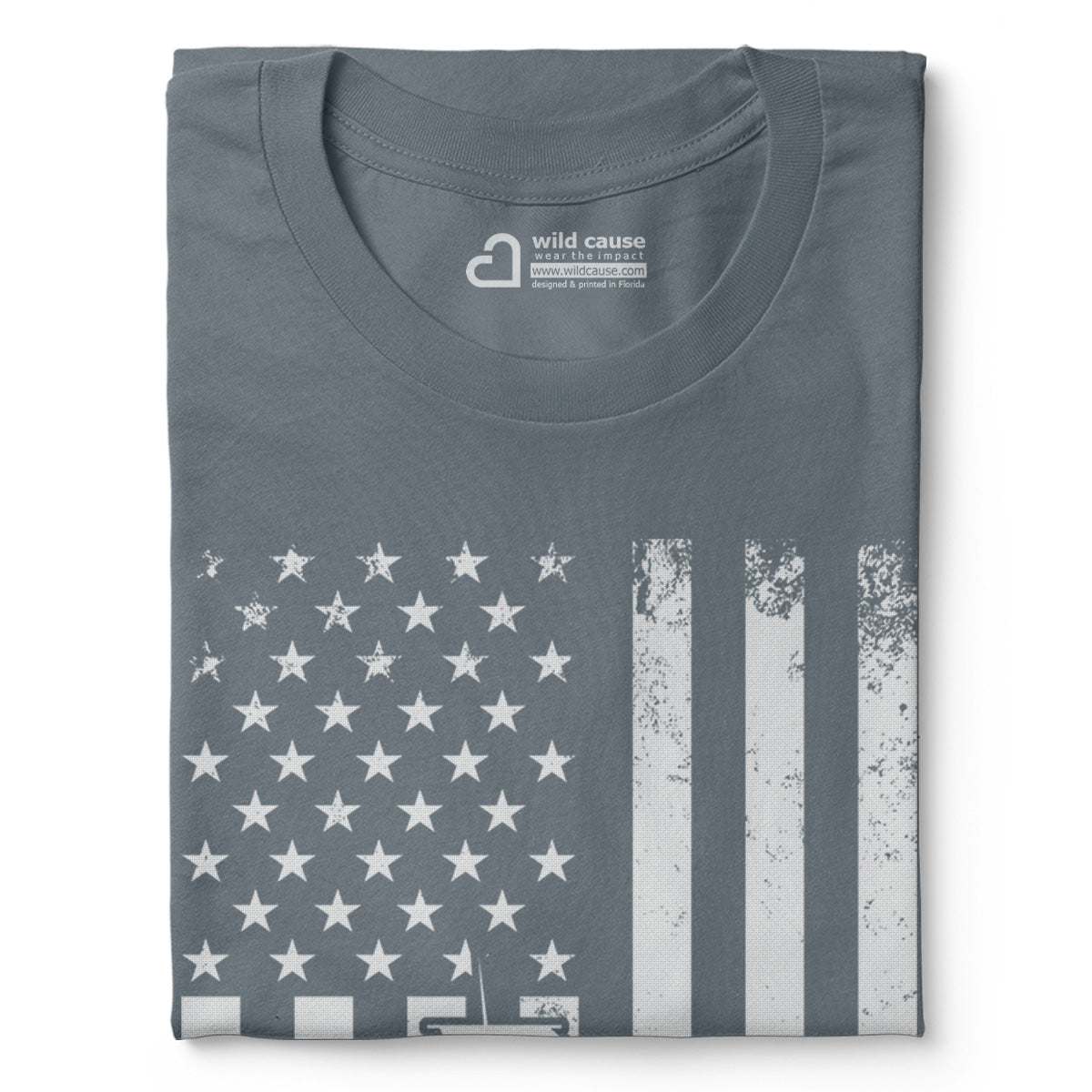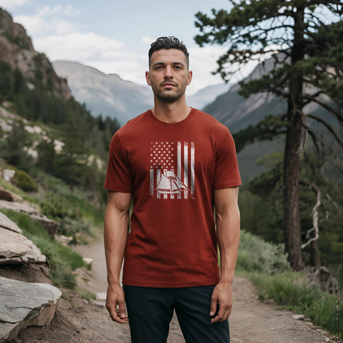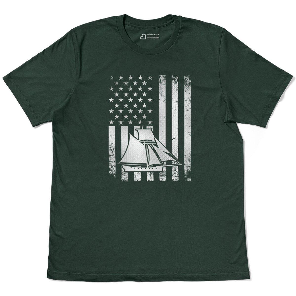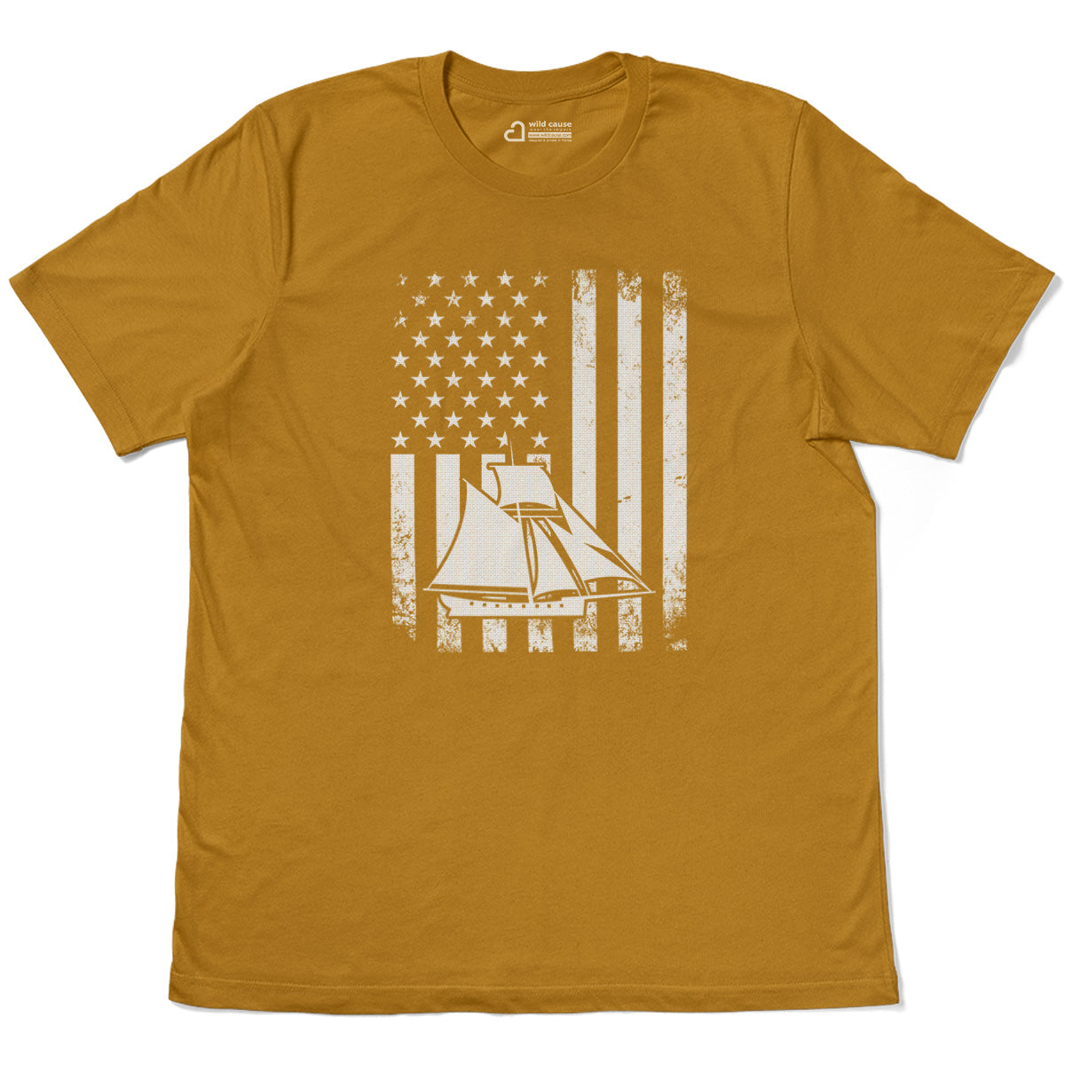 Embark on a pontoon adventure with the USA flag Adult Cotton Tee T-Shirt. Show off your patriotic American pride with this stylish design featuring the American flag and ship. Perfect for ocean sailing adventures and historic sailing enthusiasts.