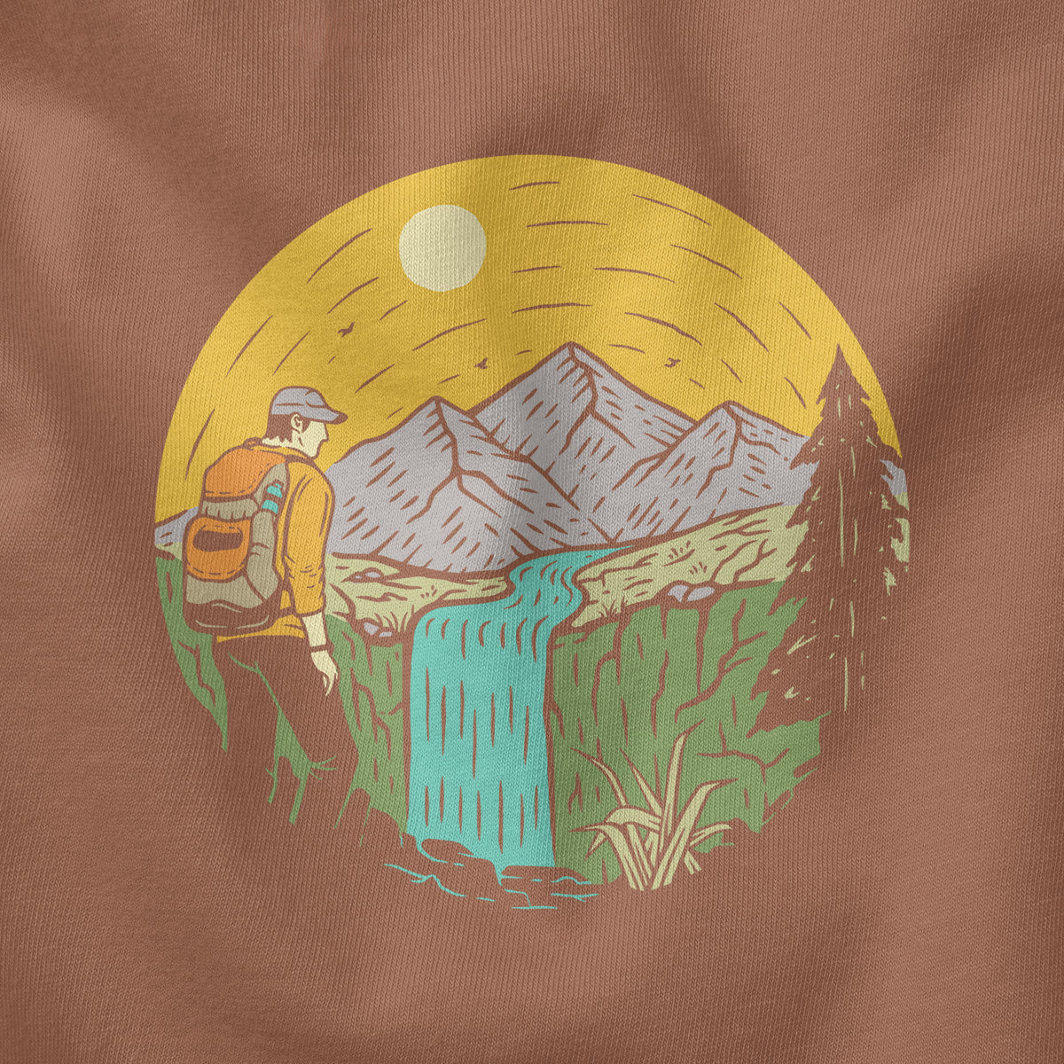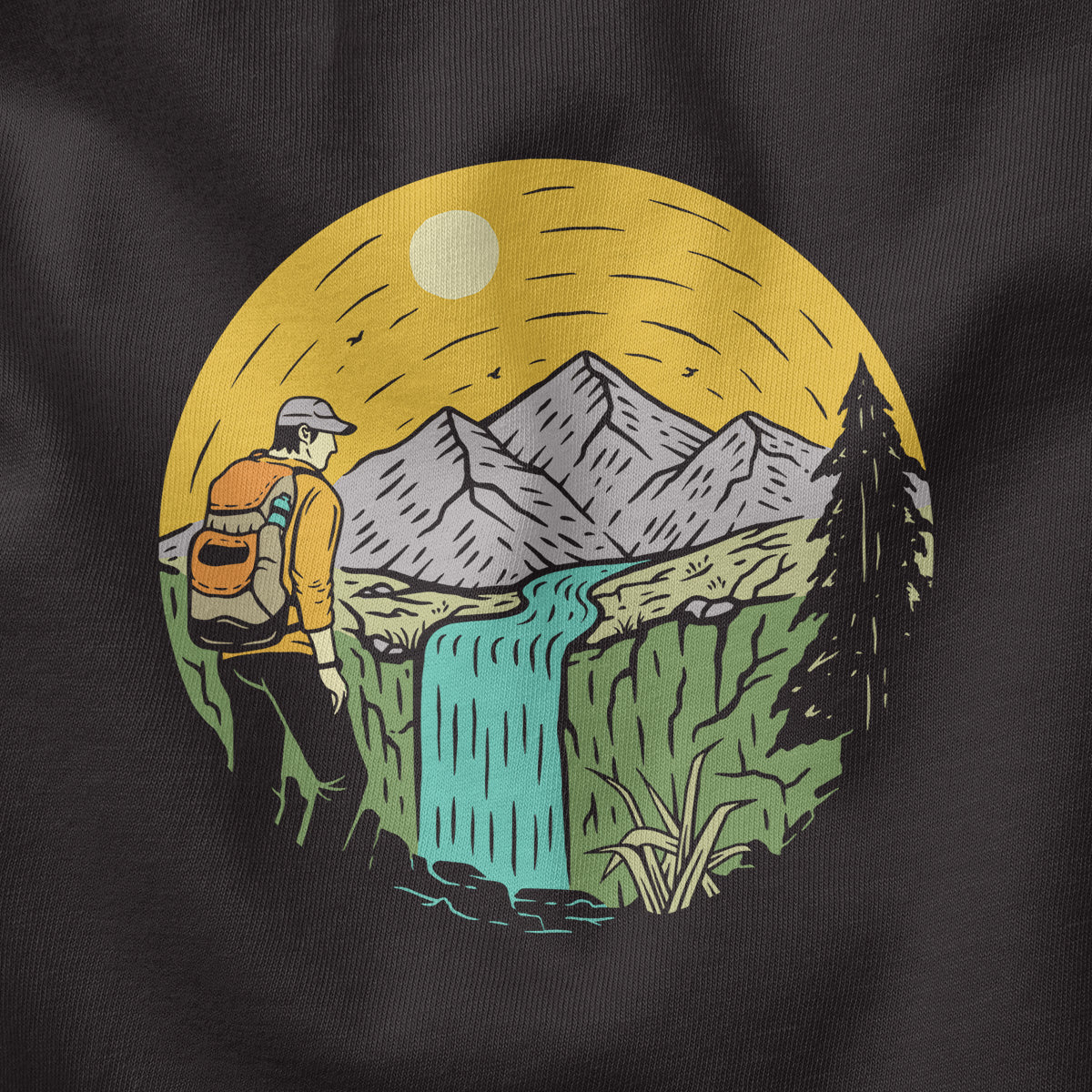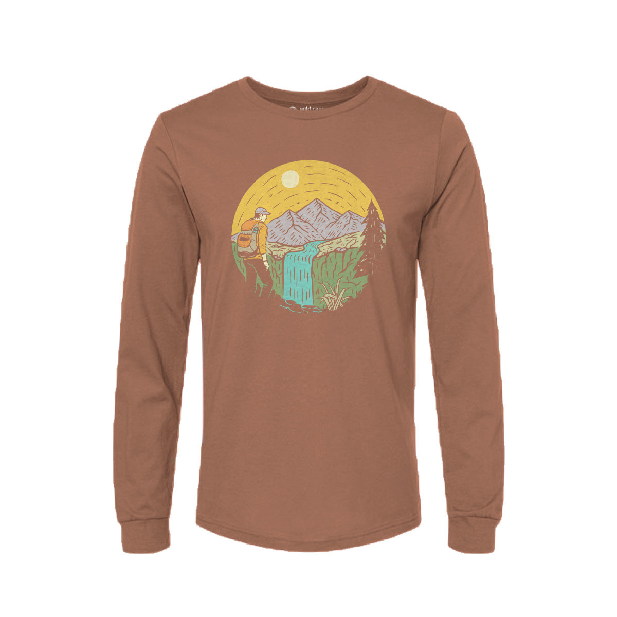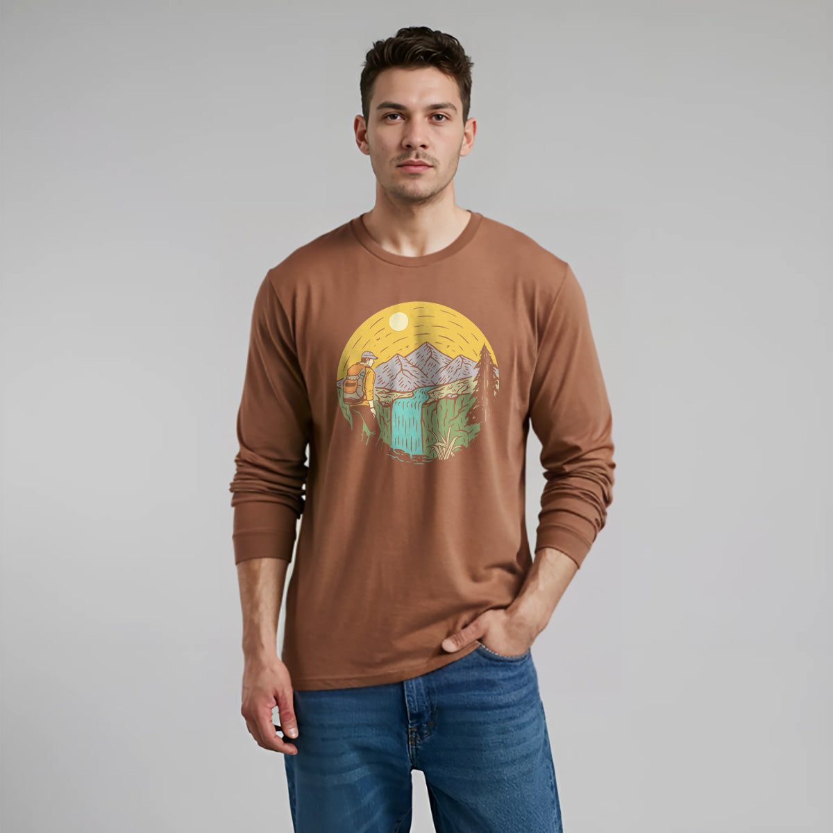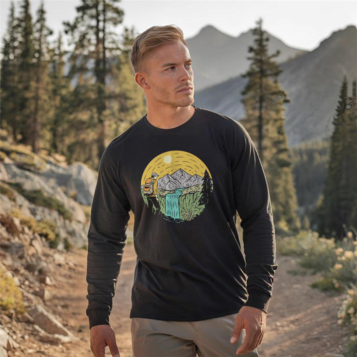 The Hiker landscape Adult Long Sleeve Tee T-Shirt is ideal for trail backpacking enthusiasts. With a design inspired by outdoor backpack adventure, it's perfect for mountain trek hiking. Stay comfortable on your hiking backpack journey with this stylish tee.