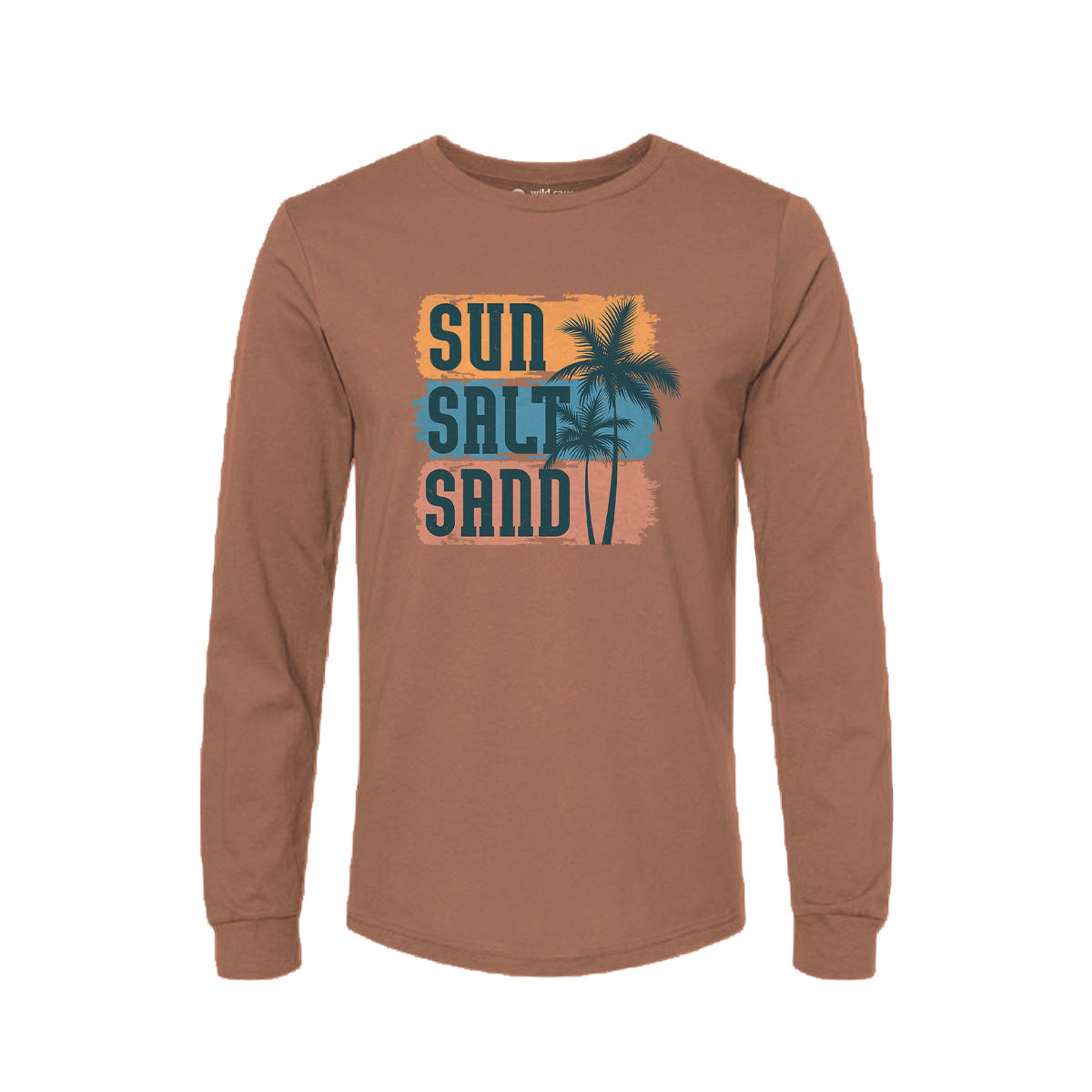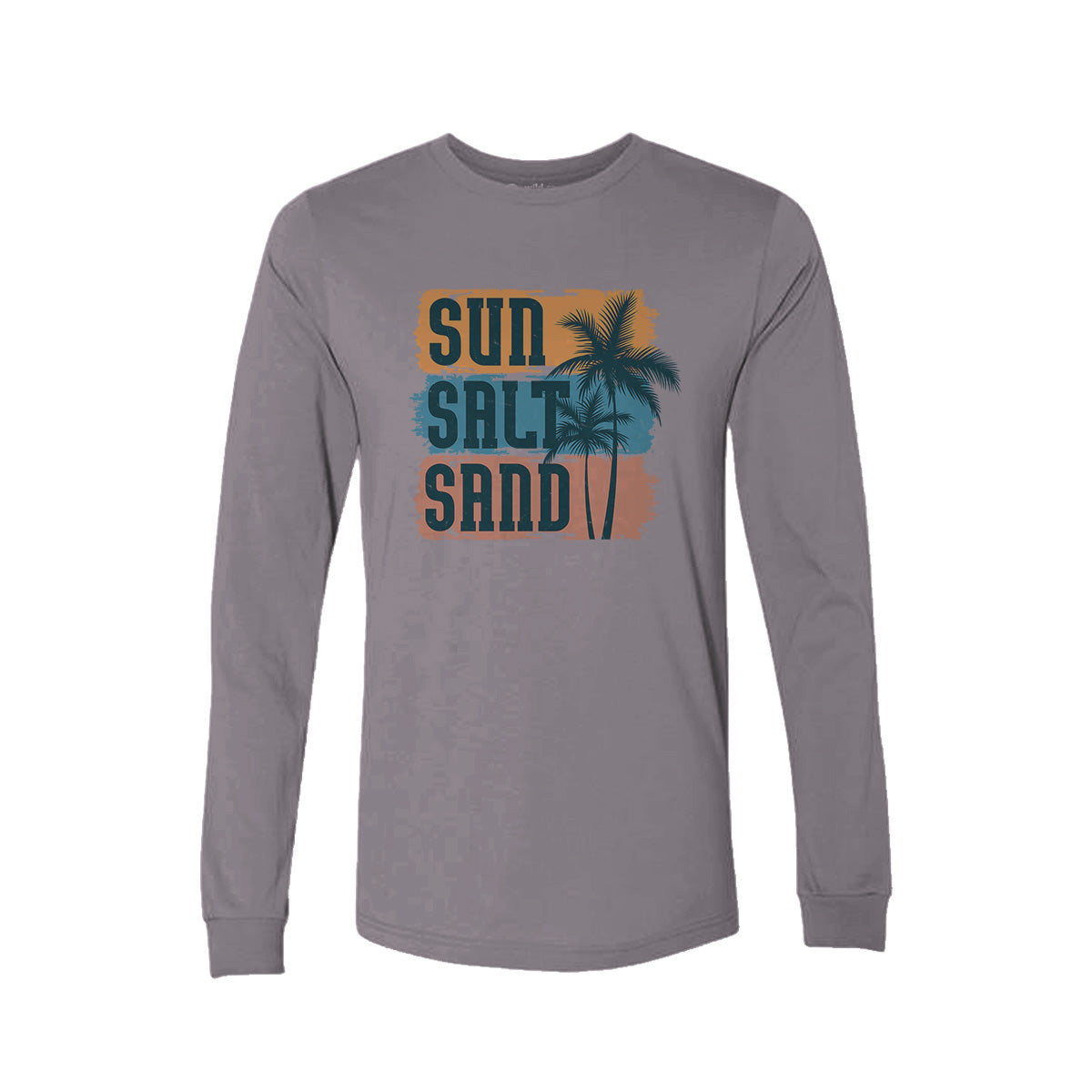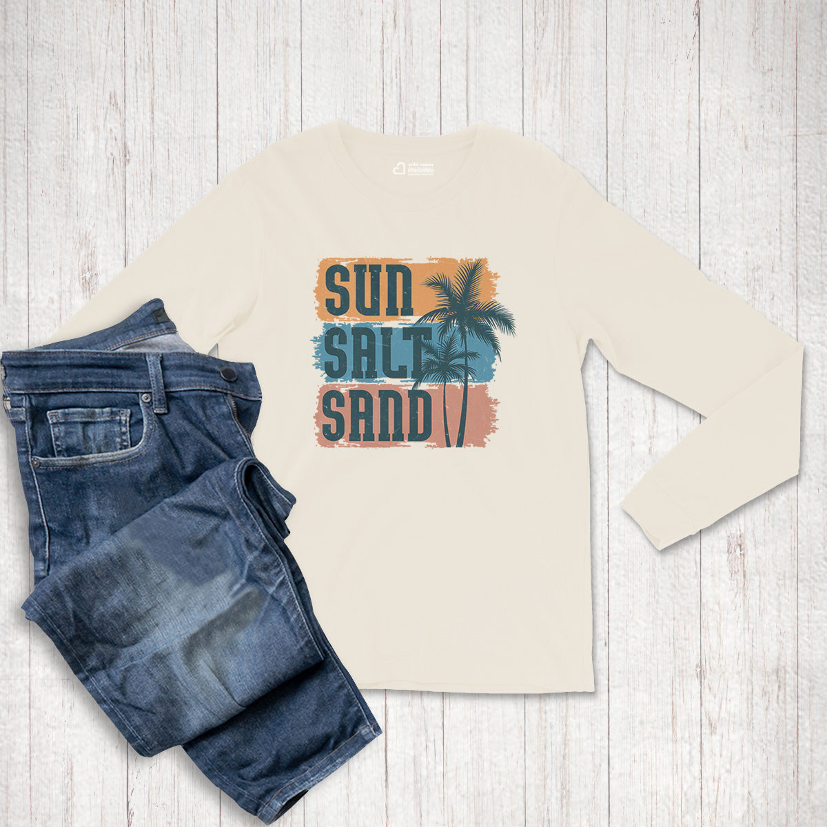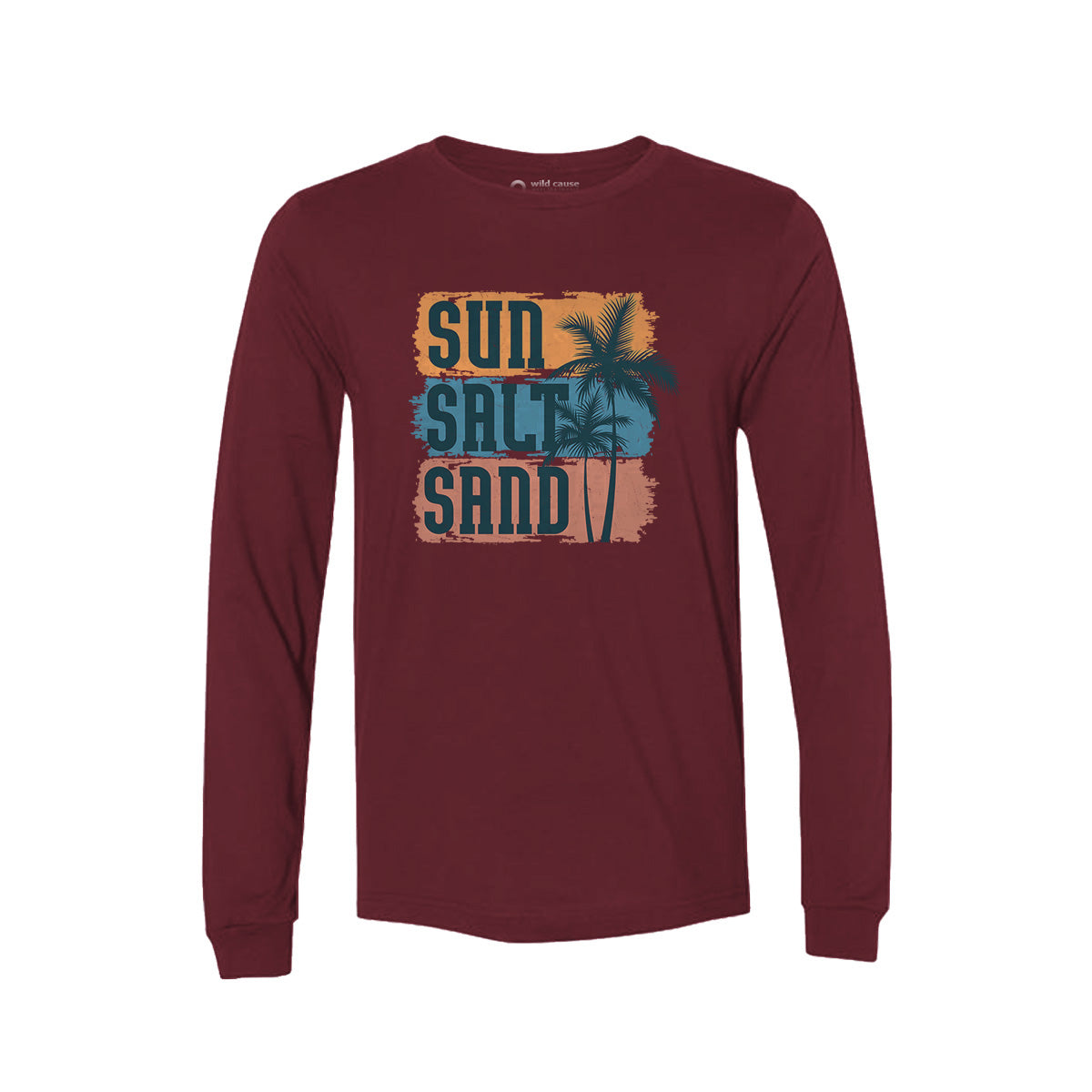 The Sun, salt, sand, beach summer fun Adult Long Sleeve Tee T-Shirt is ideal for sun bathing and relaxing by the shore. Embrace the salt breeze and waves with this design that captures sun days at the beach. Feel the sand stuck everywhere with this comfortable and stylish tee.