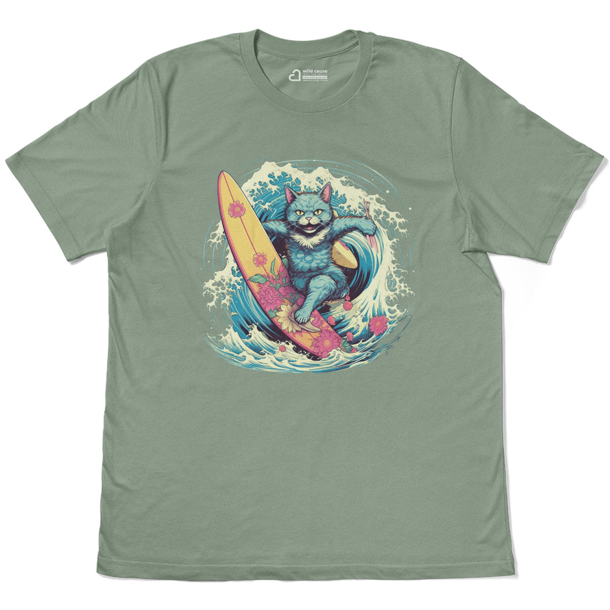 Surfing cat rides the beach waves. Adult Cotton Tee T-Shirt is perfect weather for surfing fun with a cat. This surfing cat adventure captures the coolest cat on the waves, riding ocean waves effortlessly.