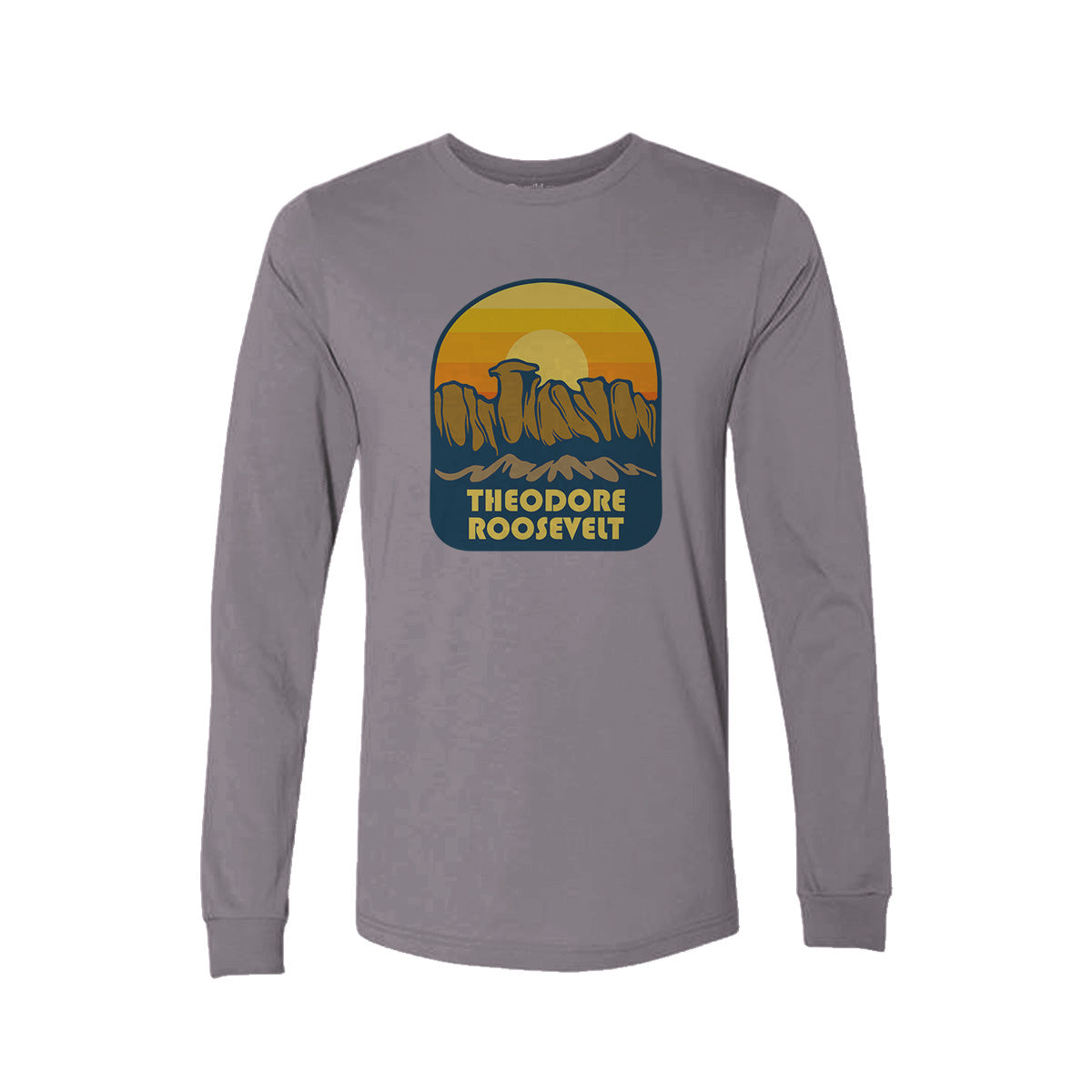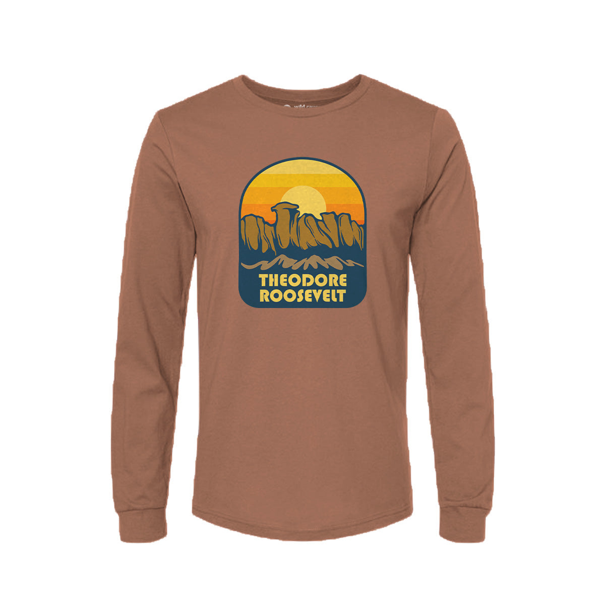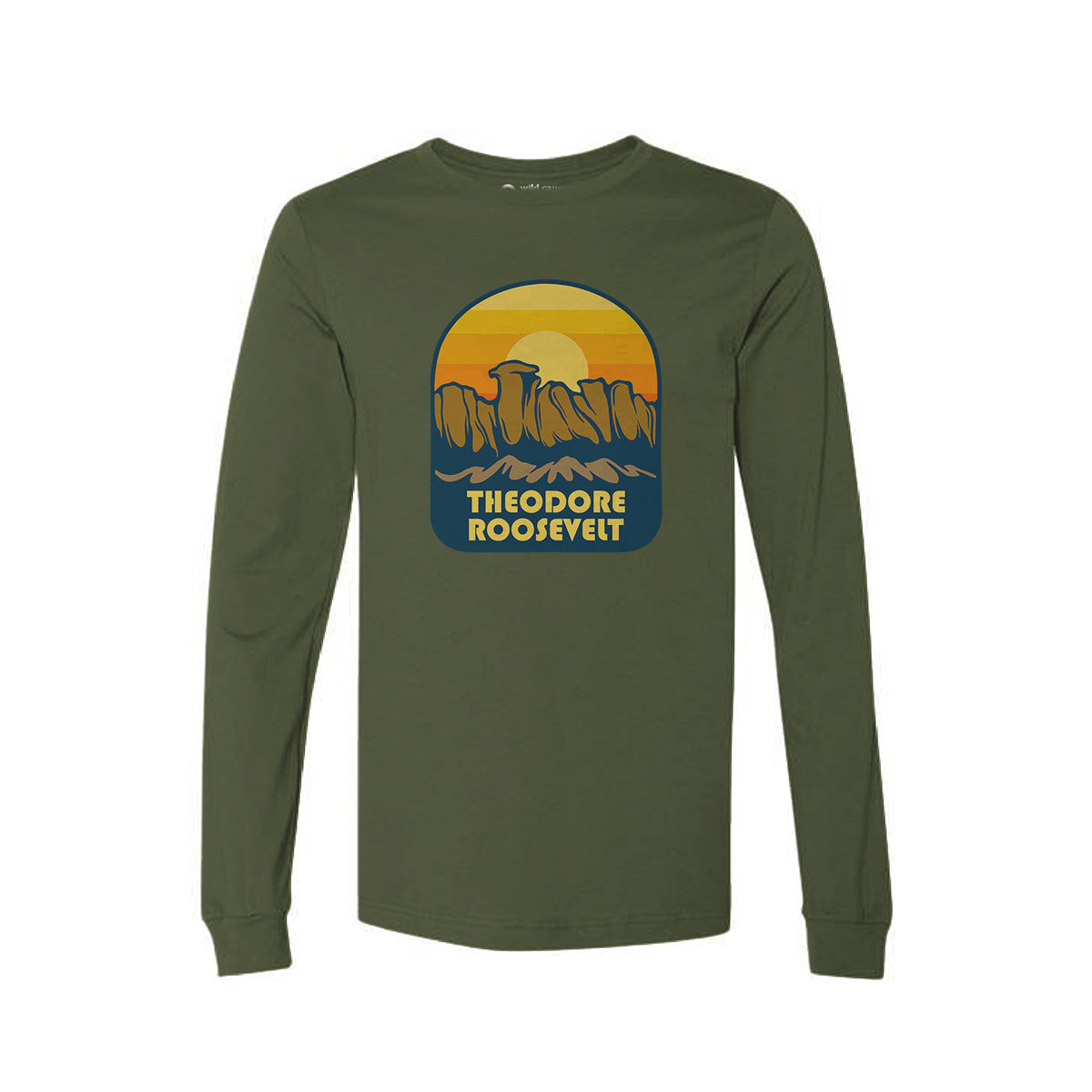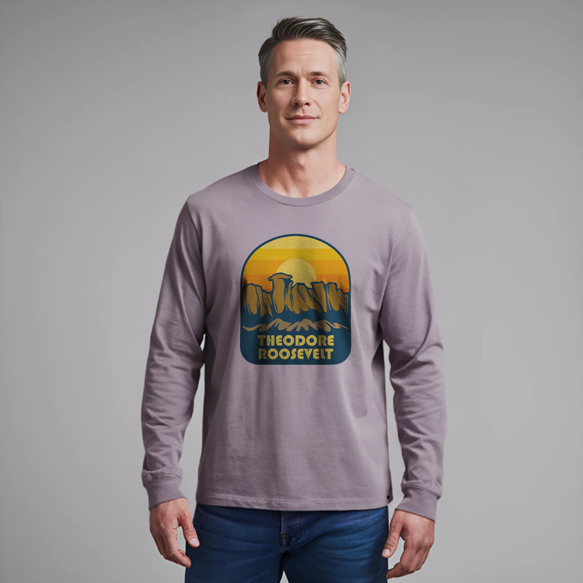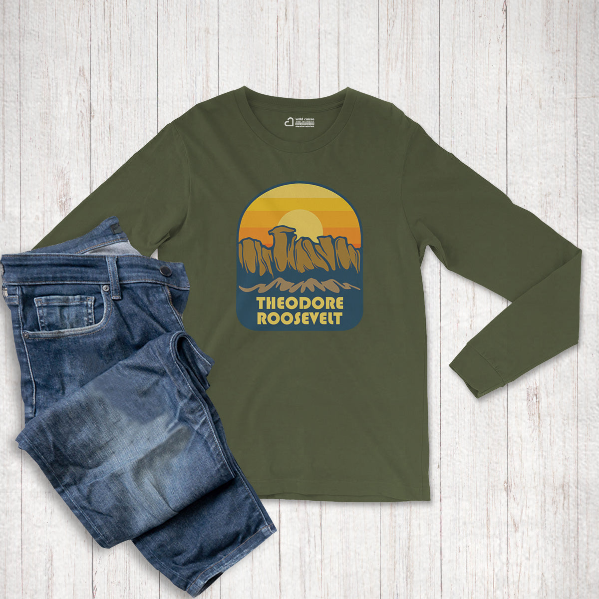 The Theodore Roosevelt Park Adventure Adult Long Sleeve Tee T-Shirt is ideal for outdoor trek in Roosevelt Park. Explore Roosevelt’s wilderness with this wild frontier adventure tee. Featuring Roosevelt National Park and frontier trails design.