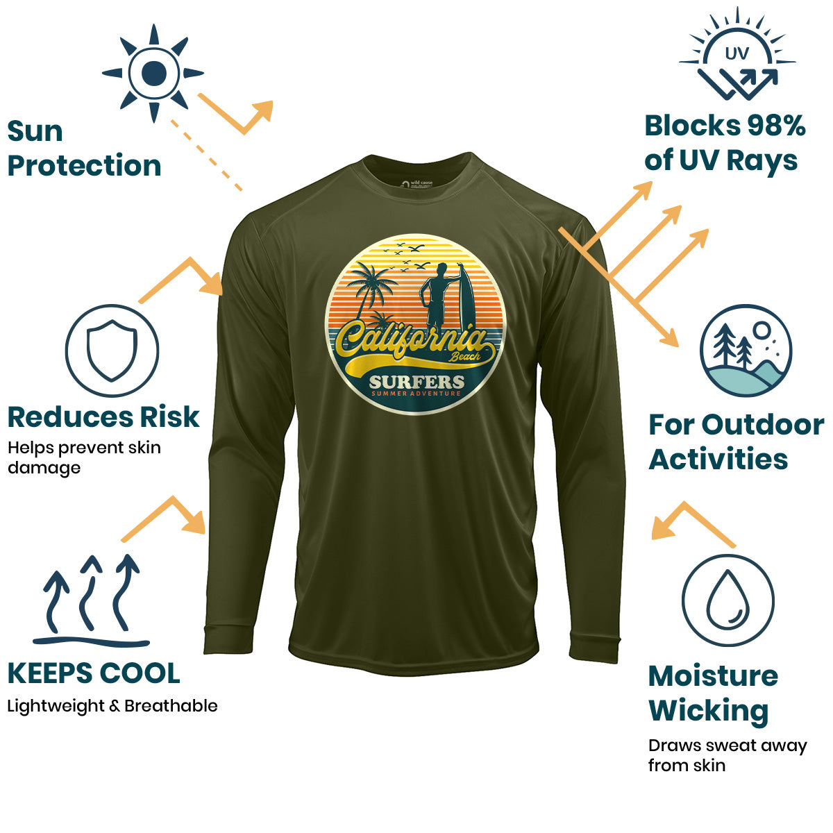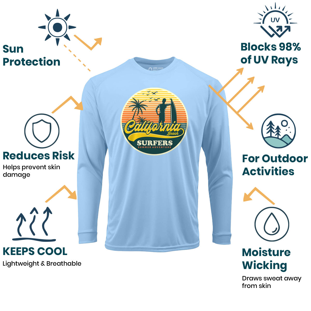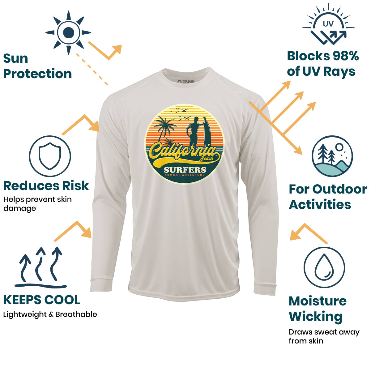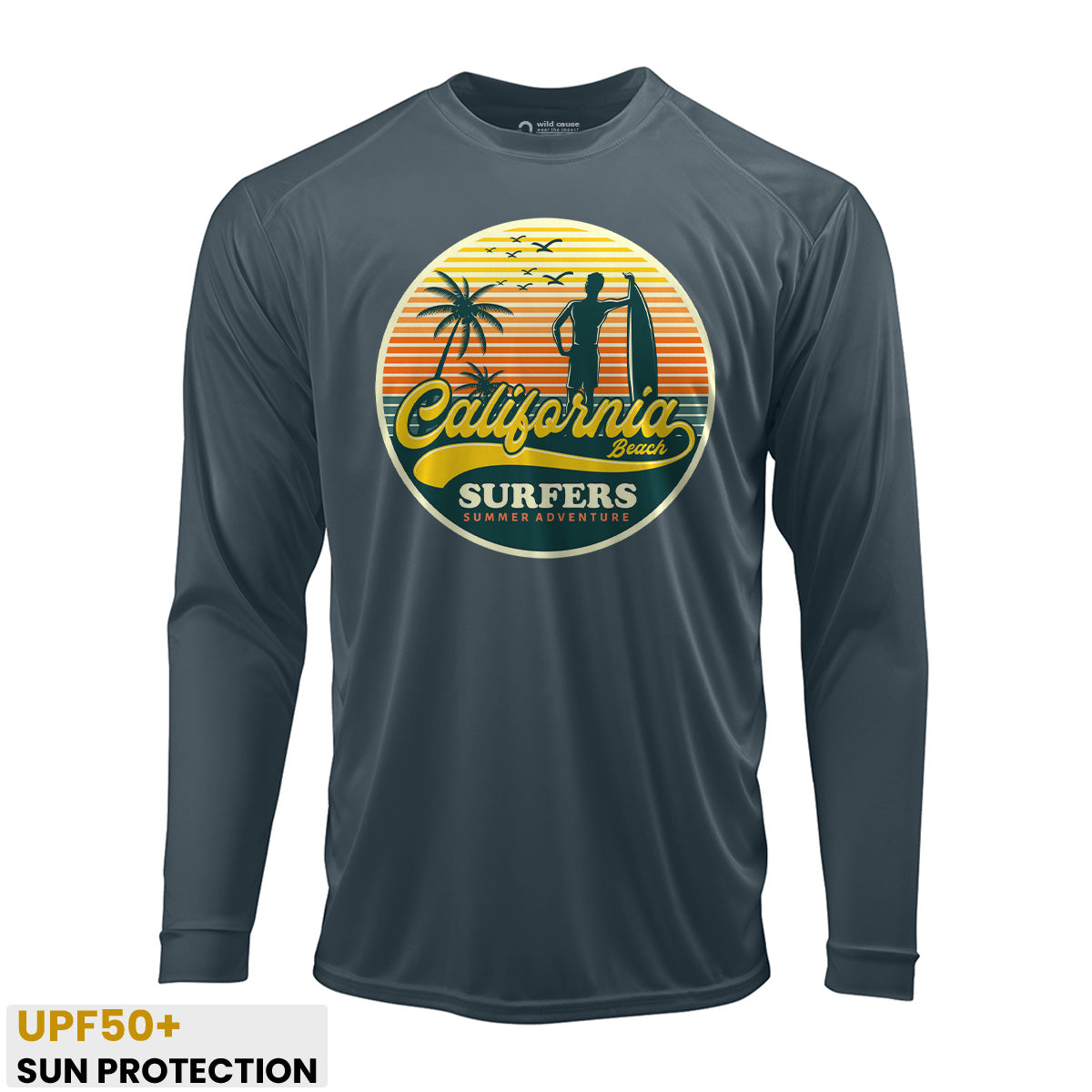 California surfers enjoying summer fun Sun Protection UV Performance Shirt UPF 50+ embodies the essence of summer surf adventure. This shirt offers California surfer vibes with its high UPF rating, perfect for surf season in California. Catch waves with style in this must-have shirt.