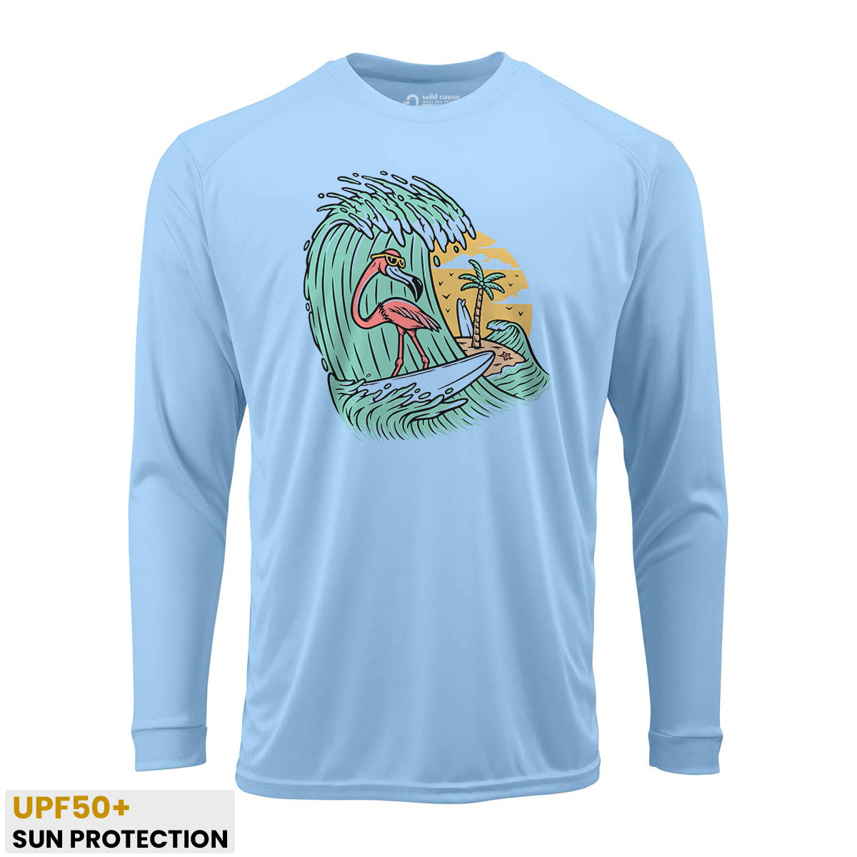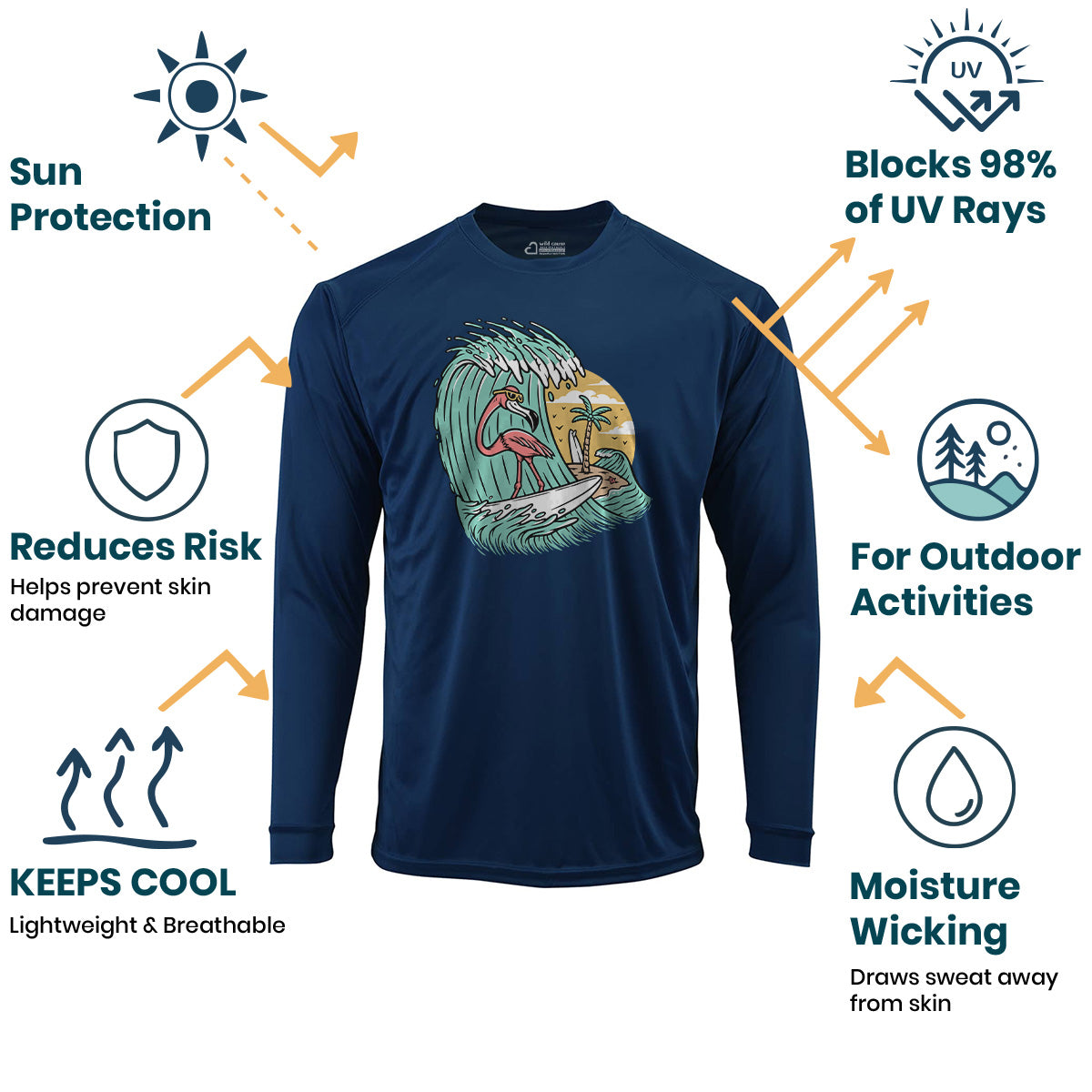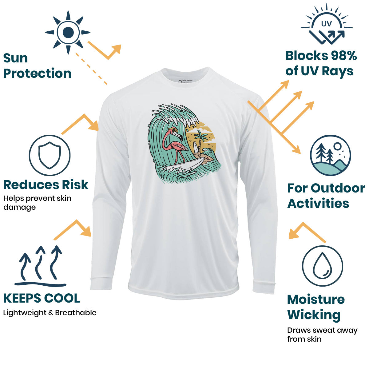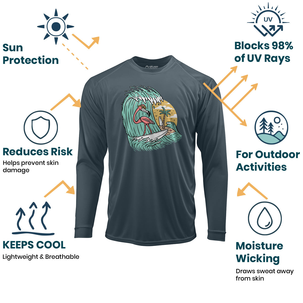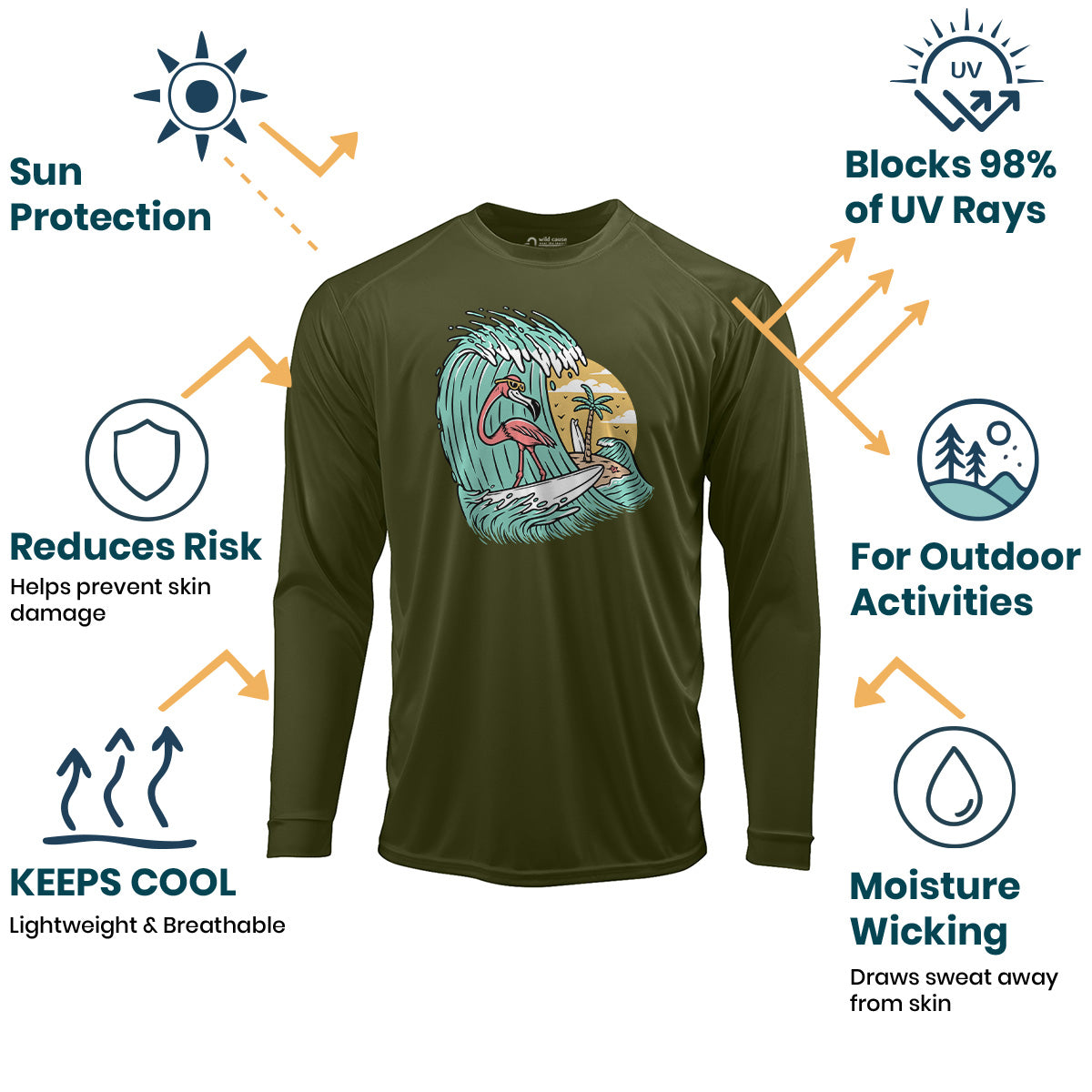 The Cute flamingo surfing the sea waves. Sun Protection UV Performance Shirt UPF 50+ exudes Flamingo Riding Ocean Waves vibes. Stay stylish and protected on warm surf days in paradise with this fun design. Flamingo knows how to surf!