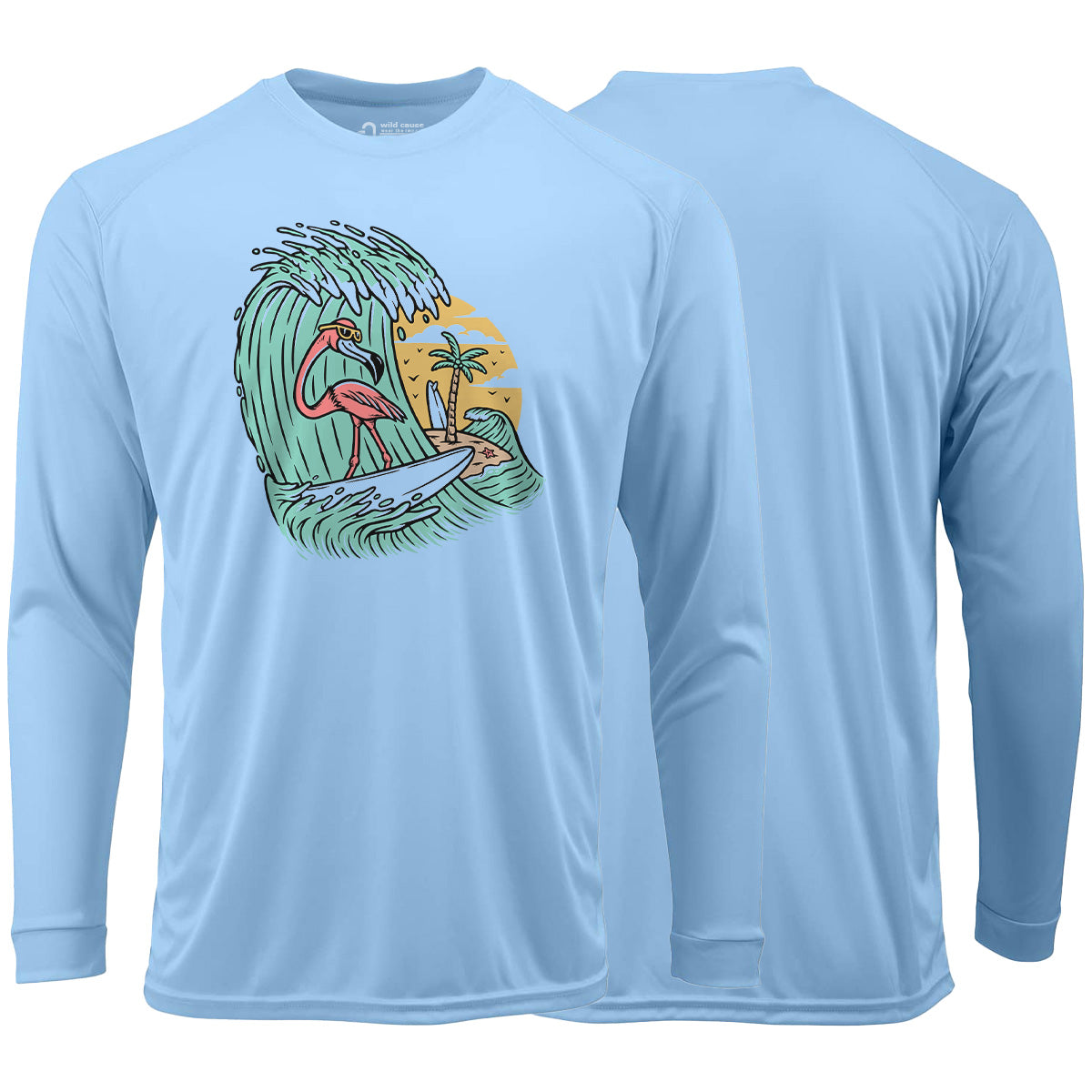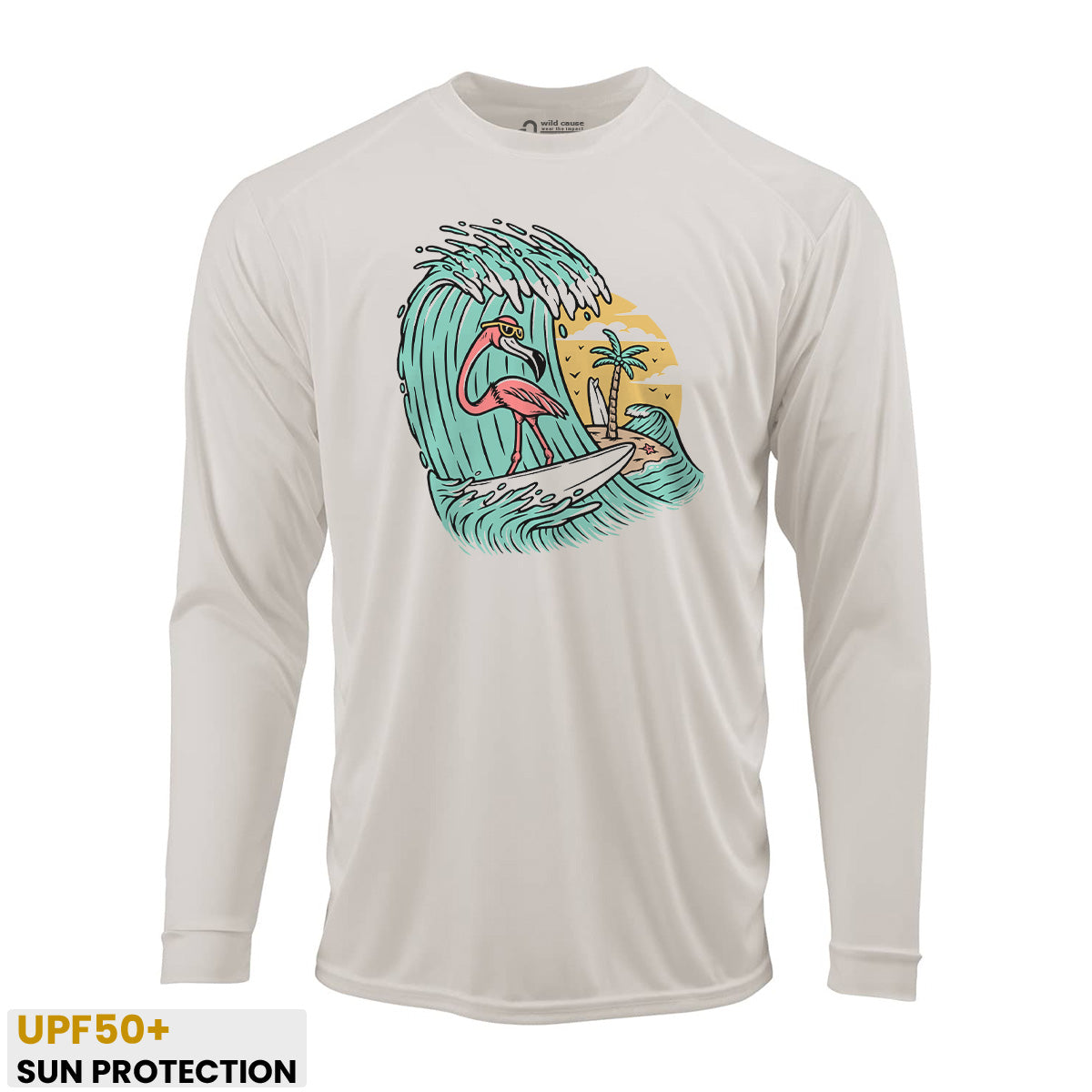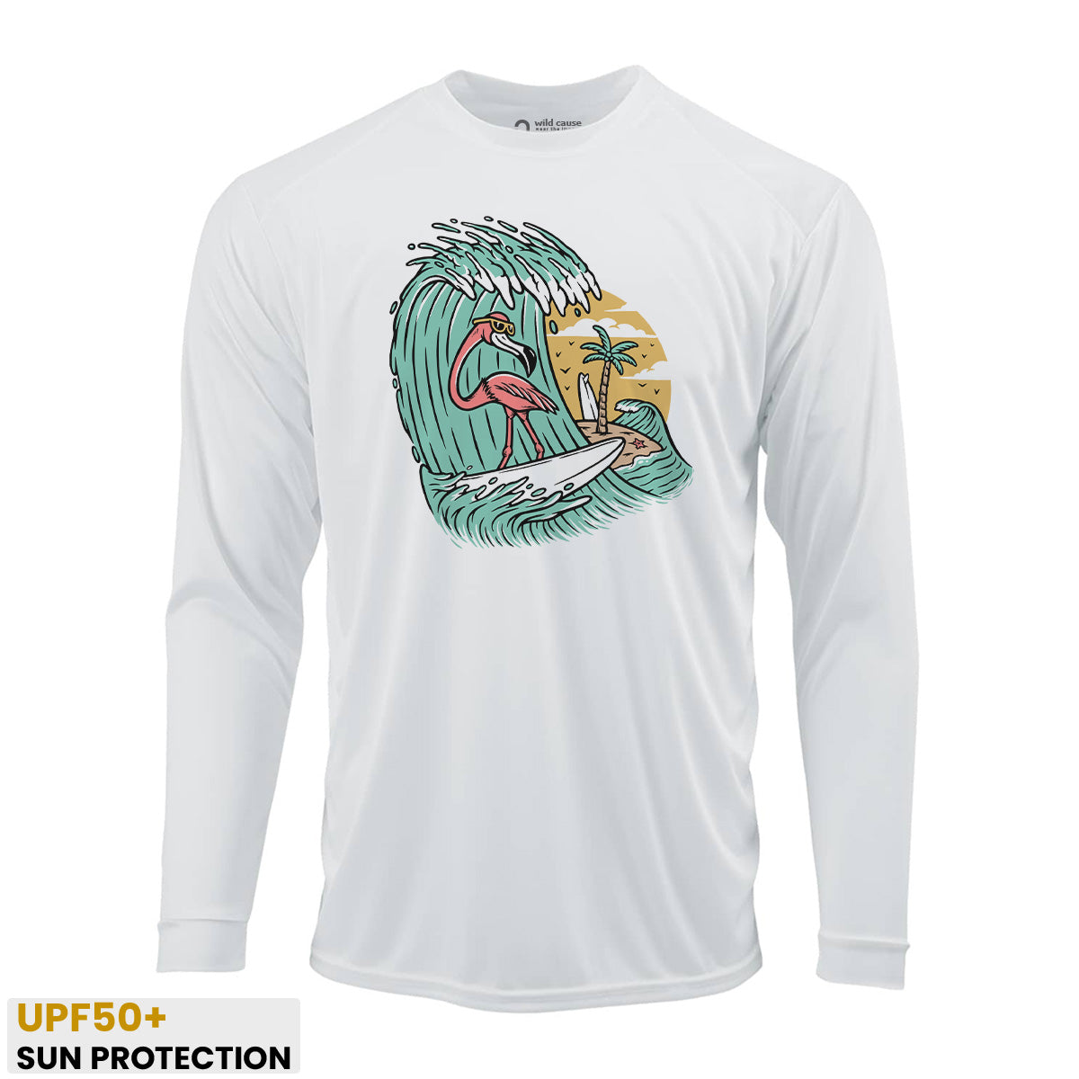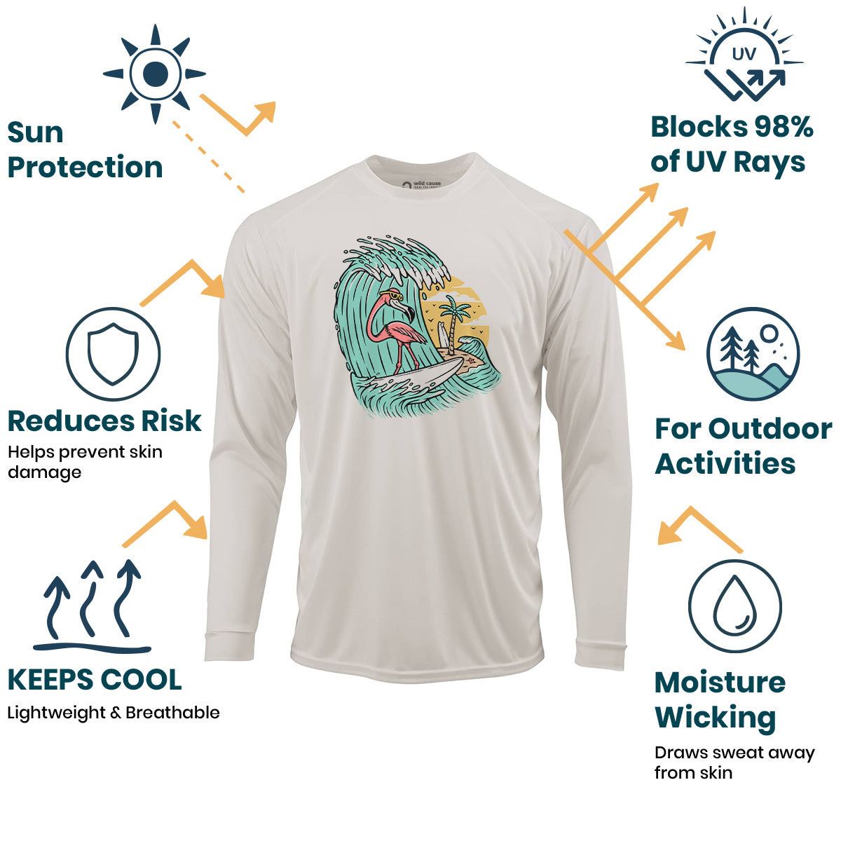 The Cute flamingo surfing the sea waves. Sun Protection UV Performance Shirt UPF 50+ exudes Flamingo Riding Ocean Waves vibes. Stay stylish and protected on warm surf days in paradise with this fun design. Flamingo knows how to surf!