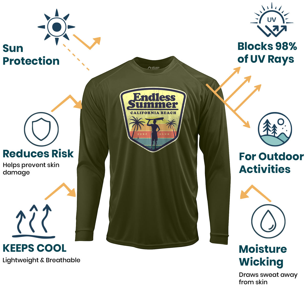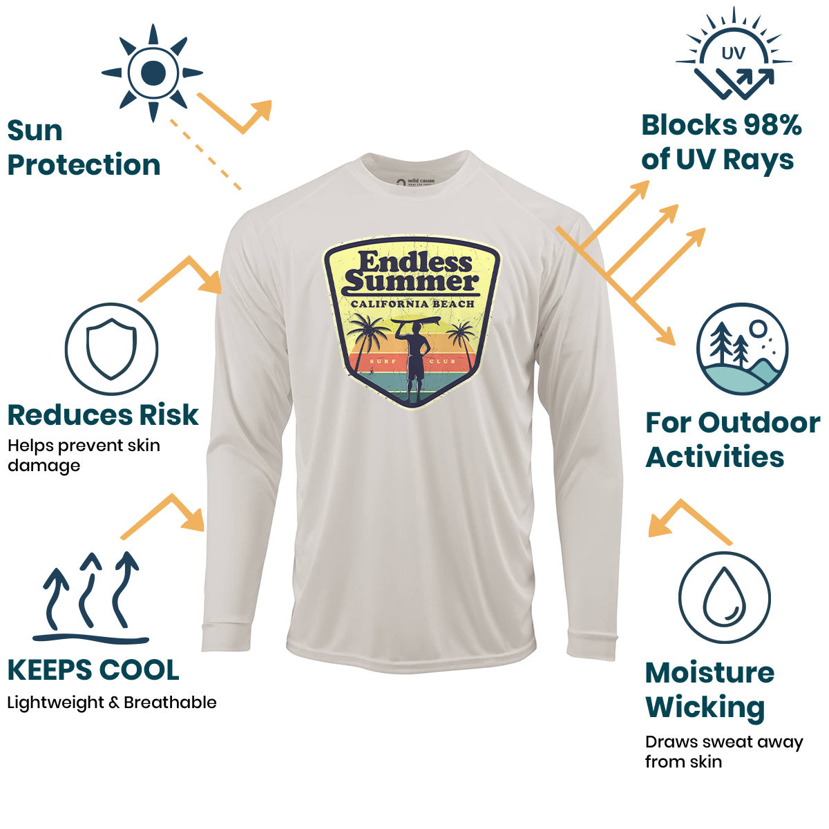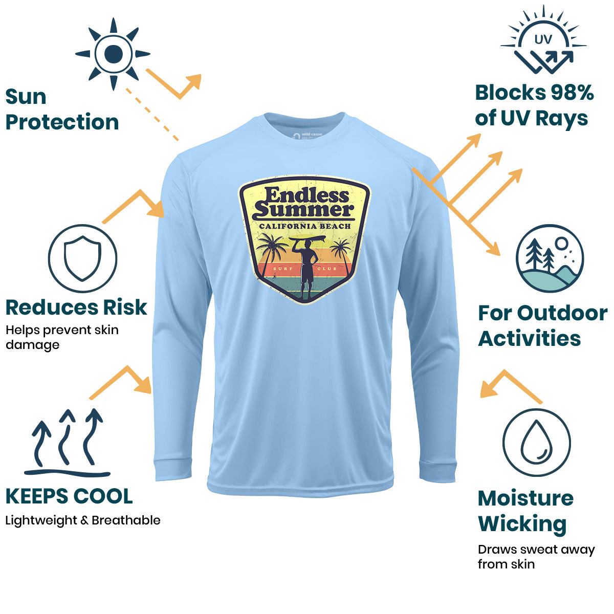 California beach adventure this summer. Sun Protection UV Performance Shirt UPF 50+ is ideal for summer surf vibes only. Surfing with the club crew and summer surf club meetup is a breeze in this shirt. Stay cool on hot days with cool wave rides and board meetings all summer.