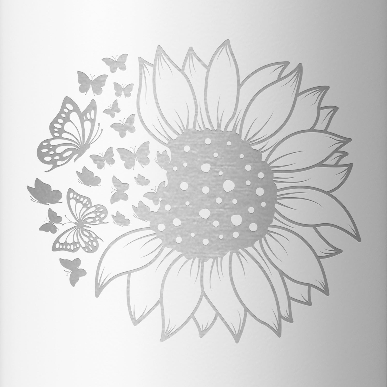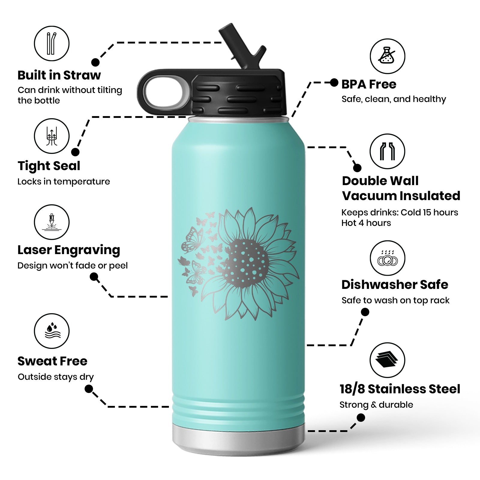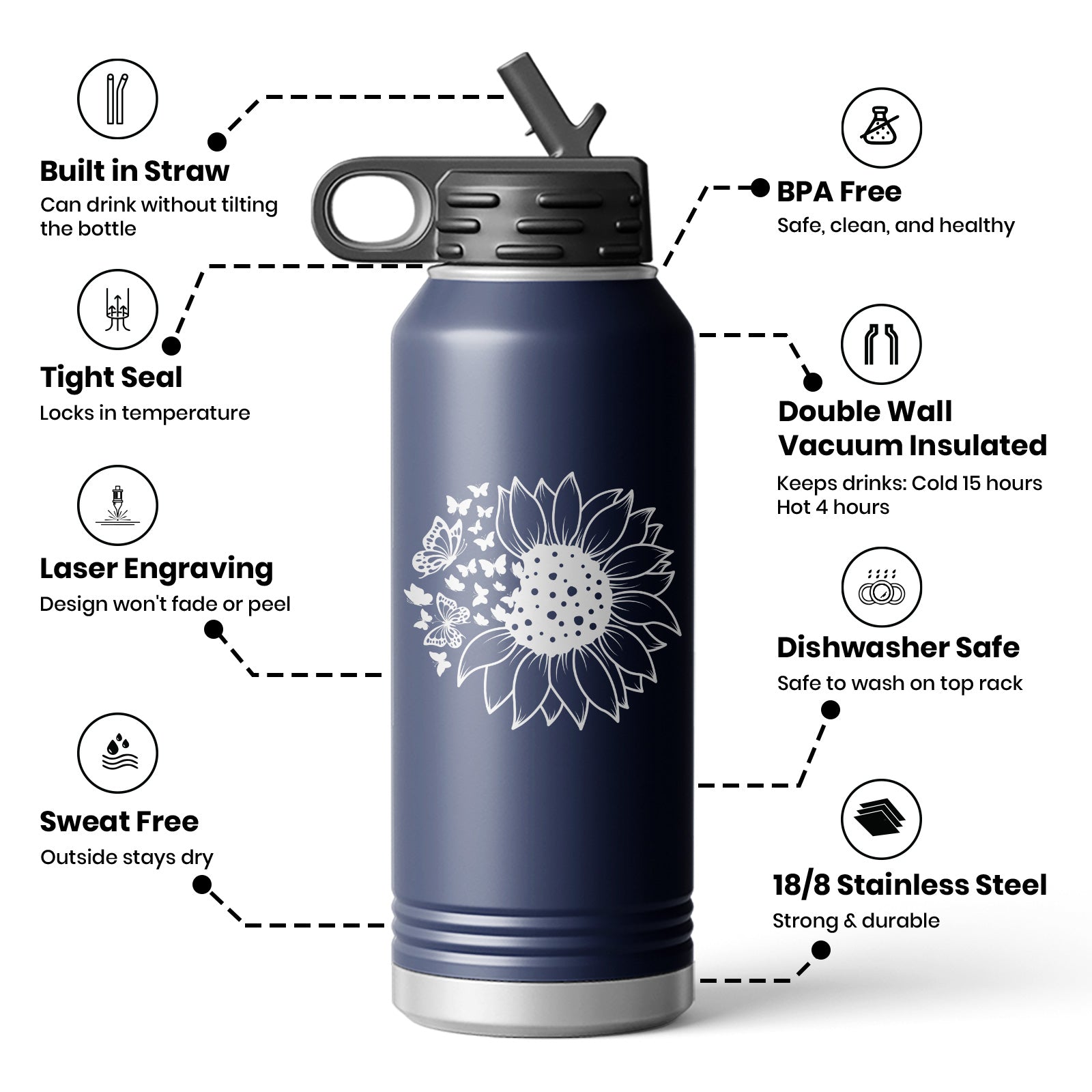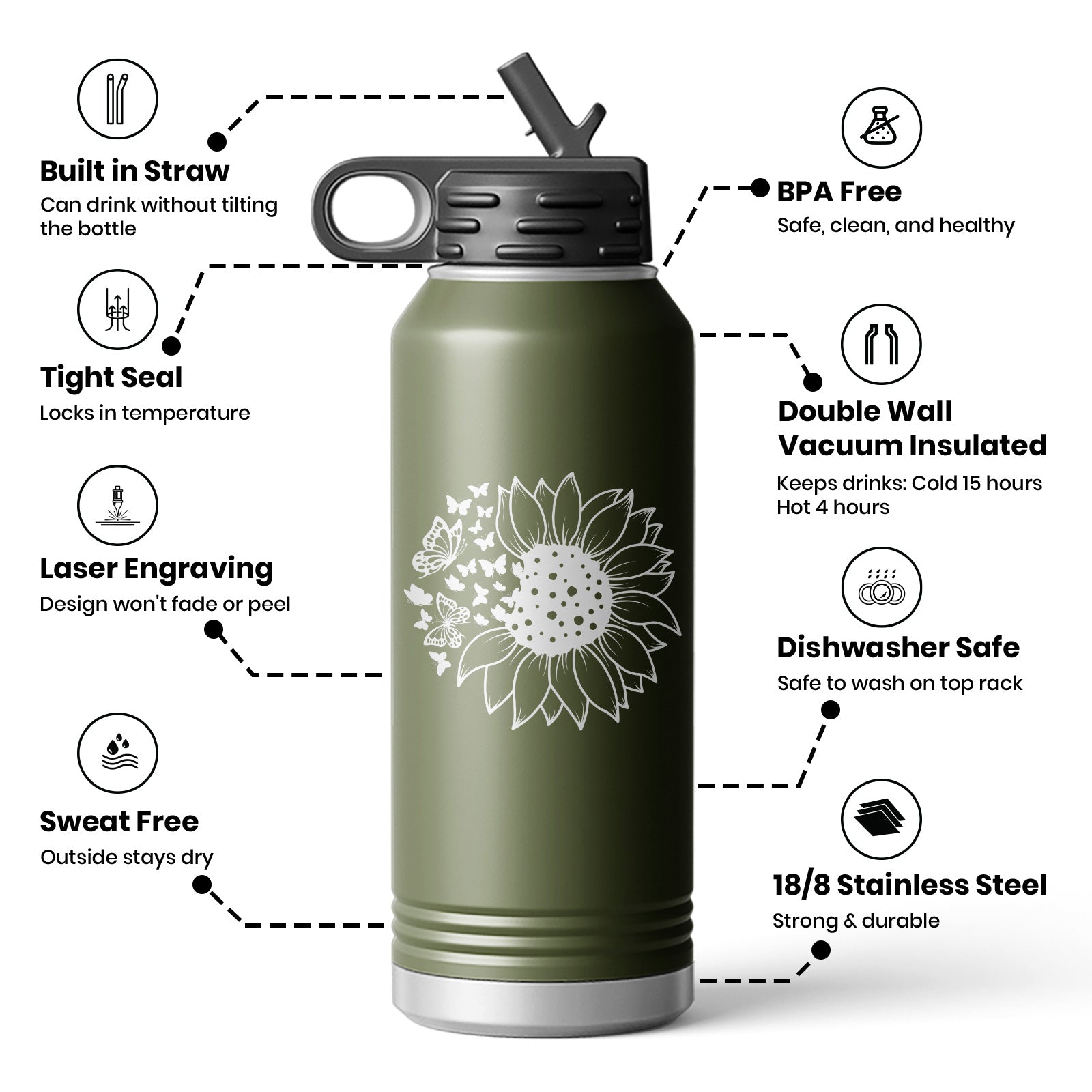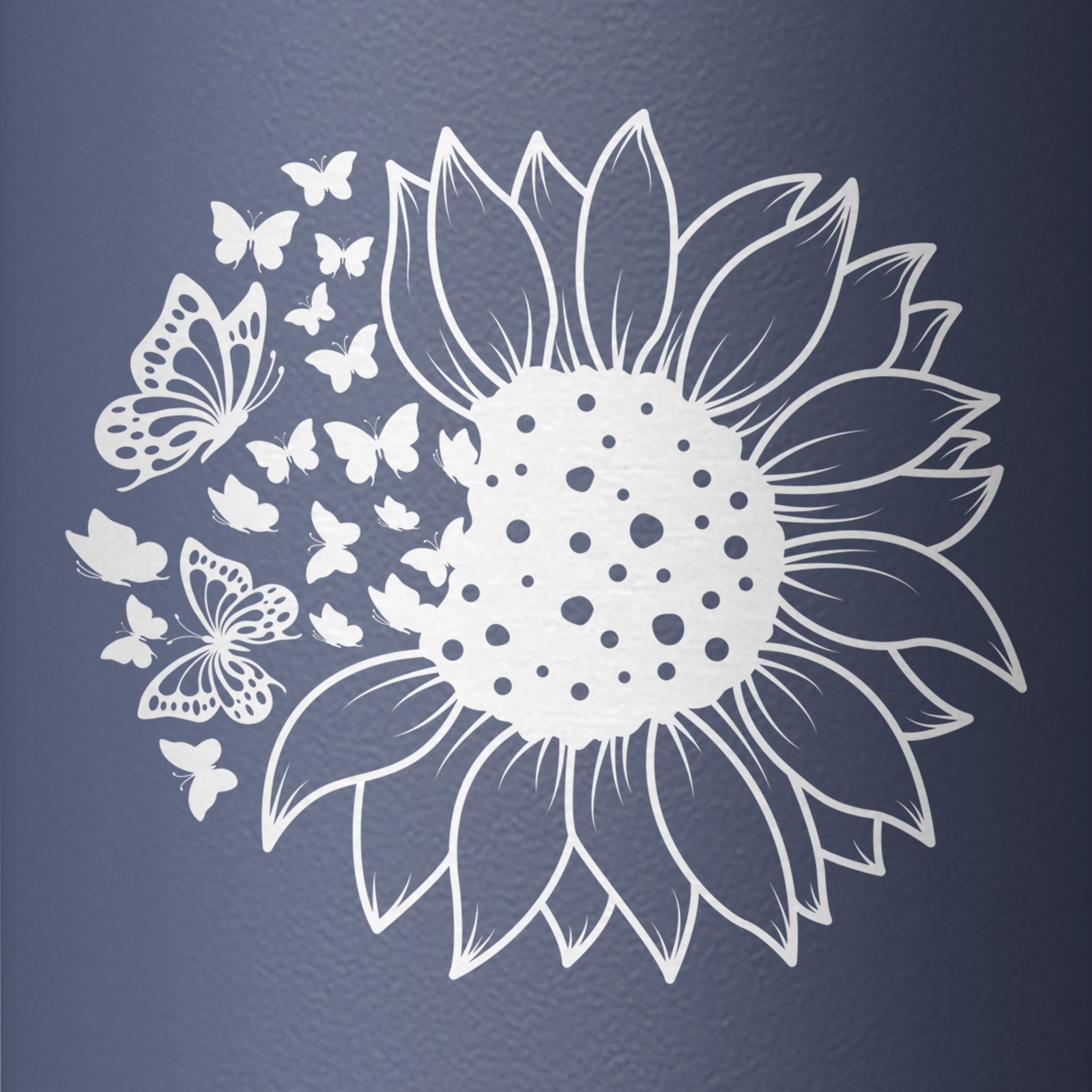 The Butterfly on Sunflower water bottle features a stunning floral and butterfly illustration. With a sunflower field backdrop, this floral butterfly art design is a beautiful addition to your collection. Carry your drinks in style with this Butterfly on Sunflower bottle.
