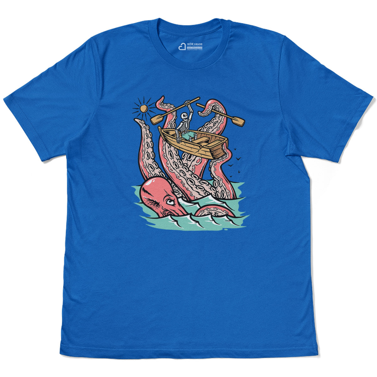 Embark on a sea adventure with giant octopus fun Adult Cotton Tee T-Shirt. This design exudes skeleton exploring fun and adventure vibes, perfect for those seeking spooky skeleton exploration time.