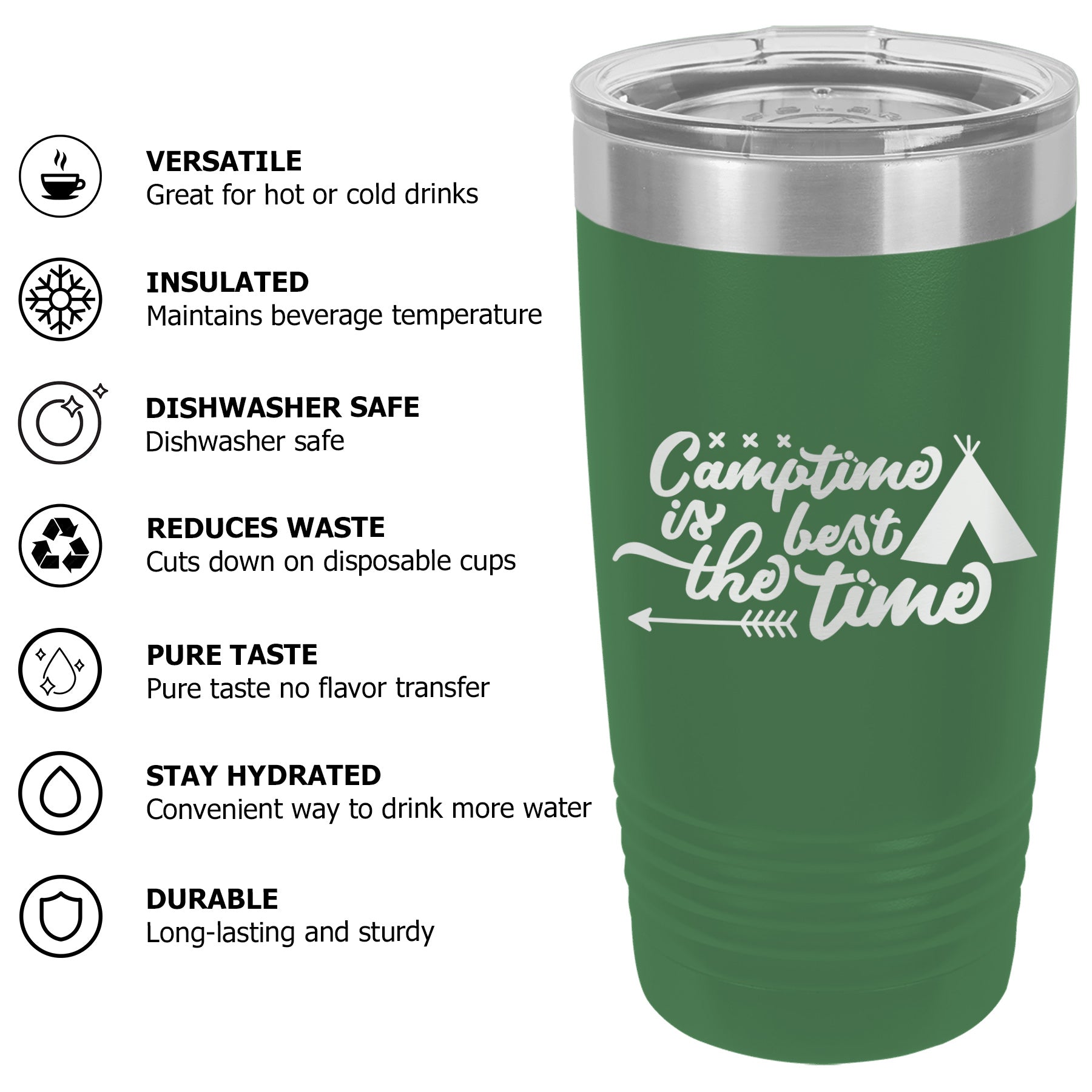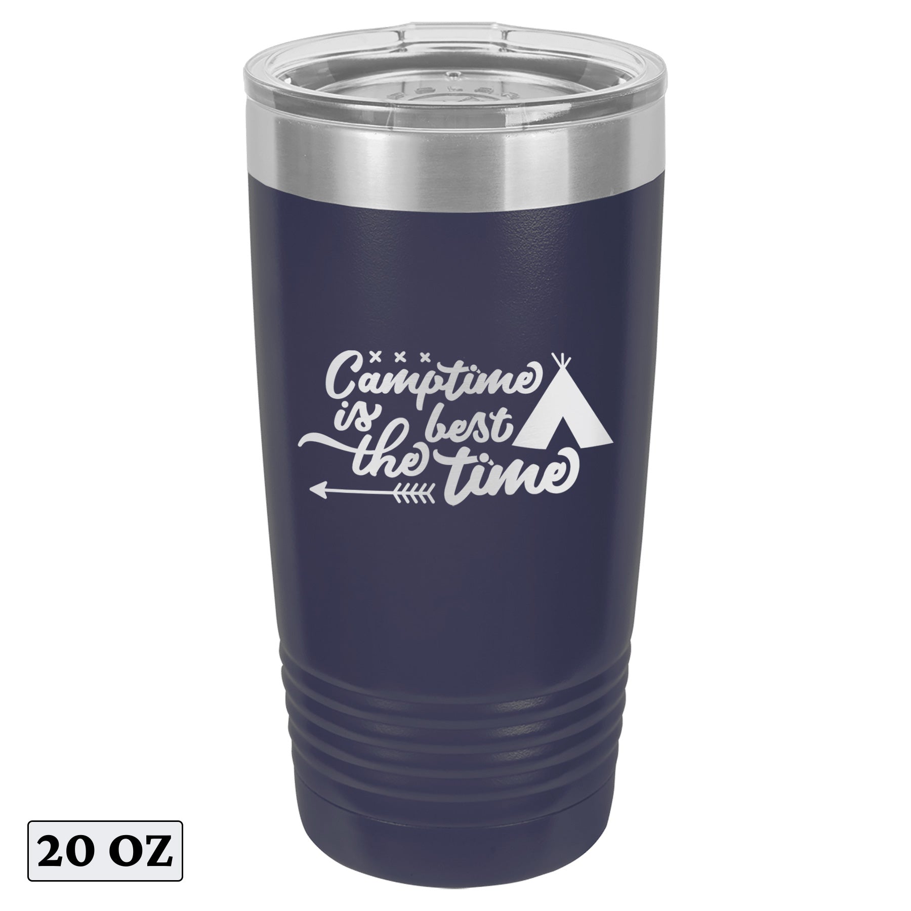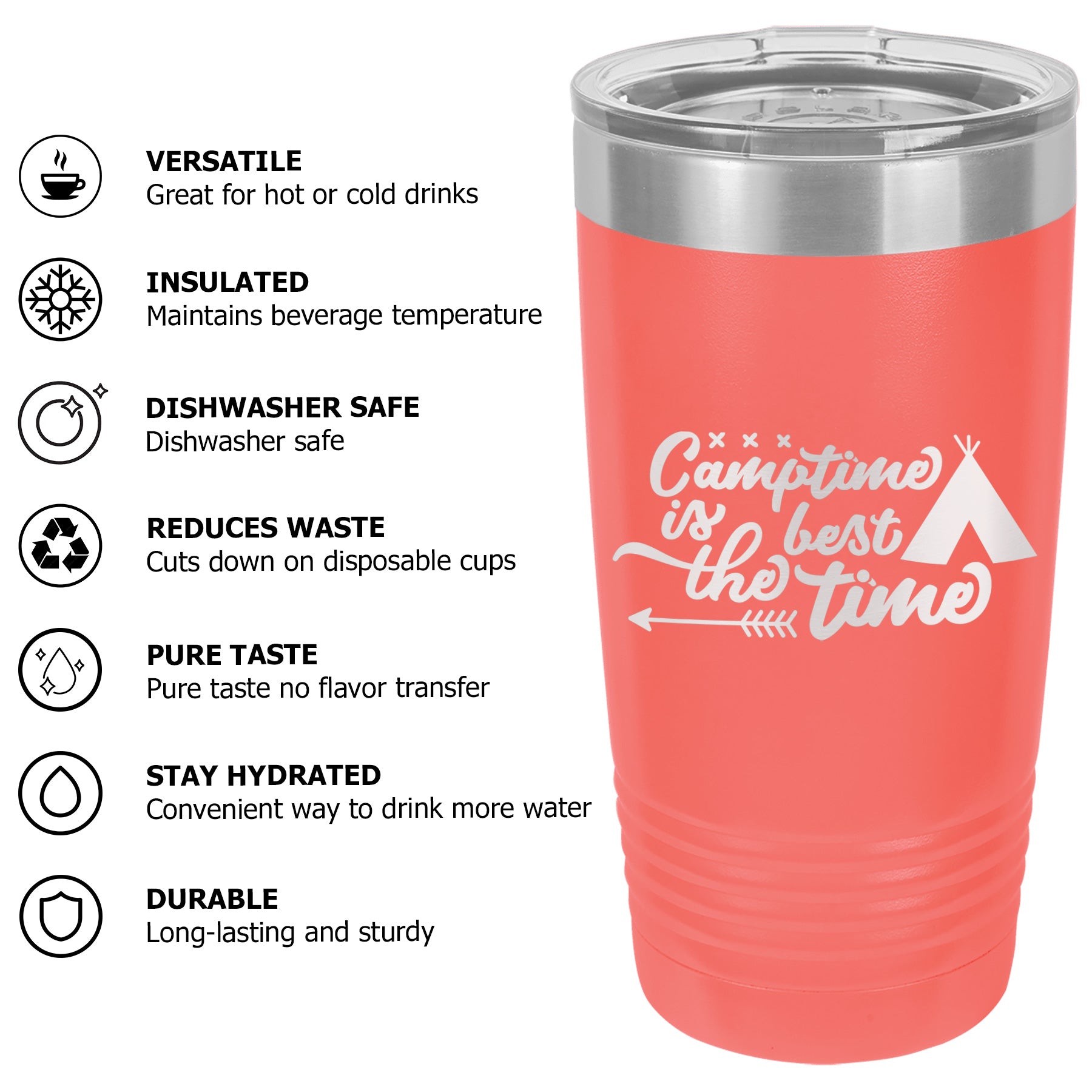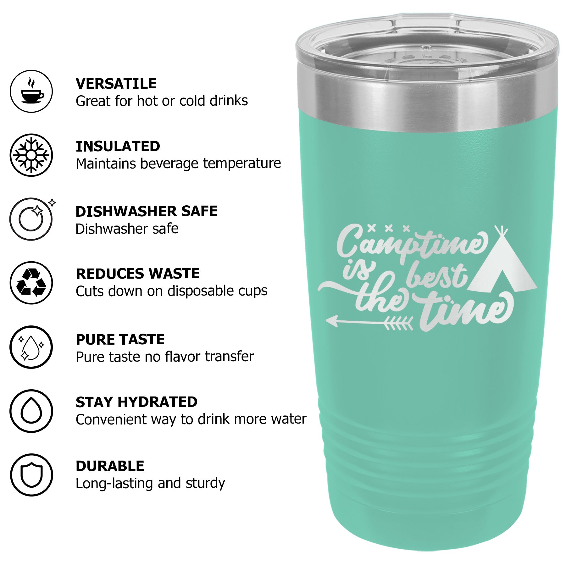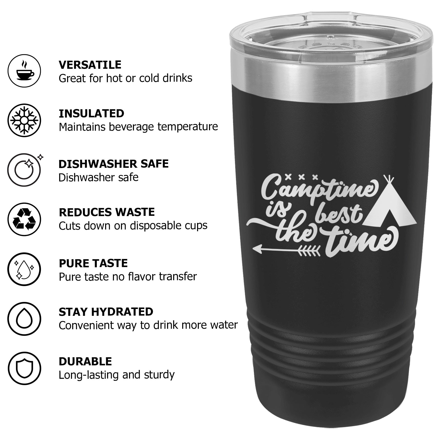 The Camptime always means outdoor fun Tumbler Cup Mug is perfect for outdoor enthusiasts. Made from durable materials, it is ideal for the best moments camping outdoors. This tumbler cup mug is designed for campers who know that CampTime Adventure Awaits. Enjoy the best CampTime with this versatile and stylish mug.