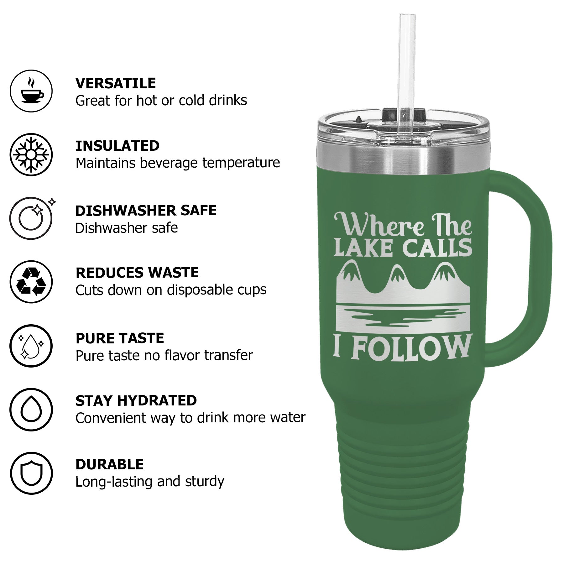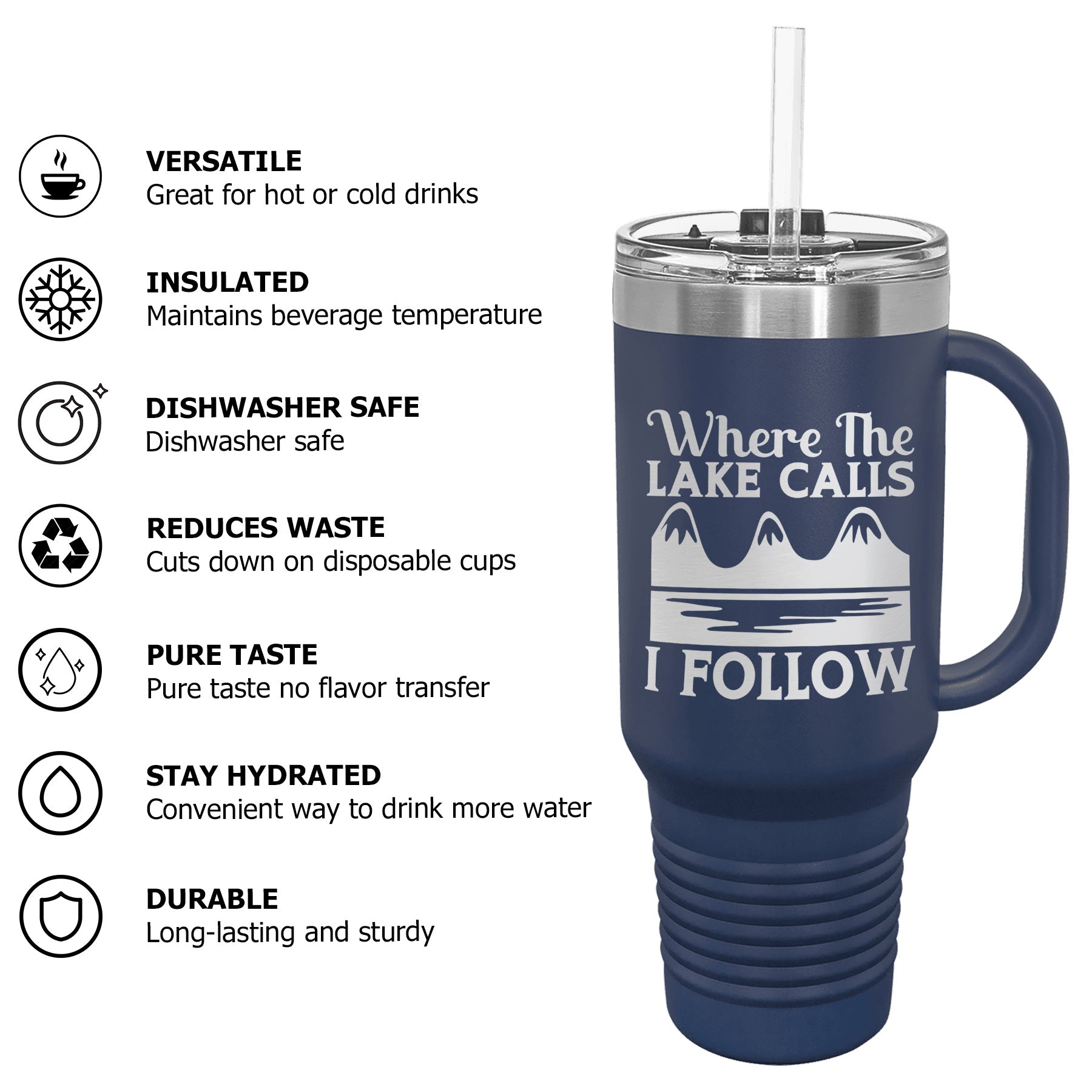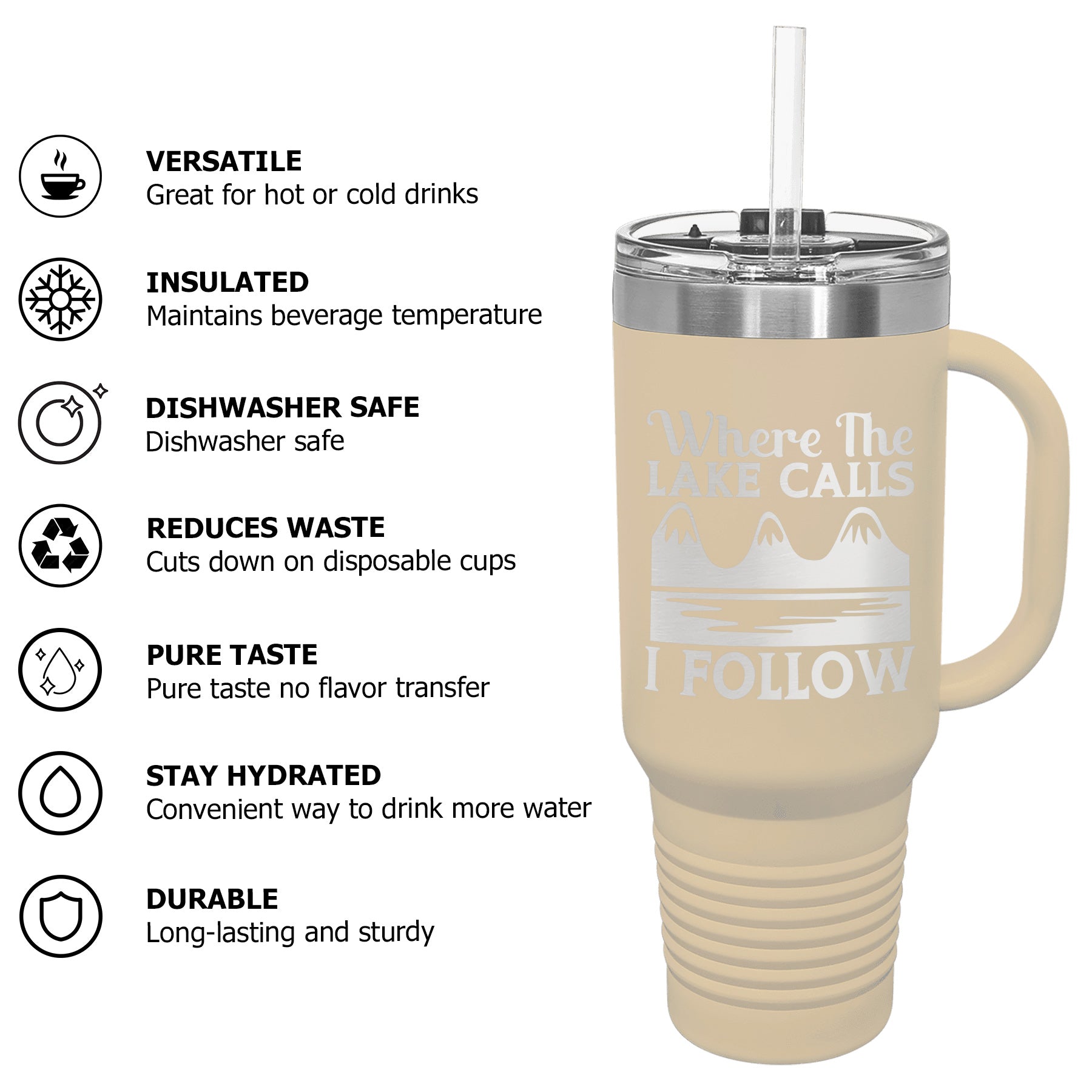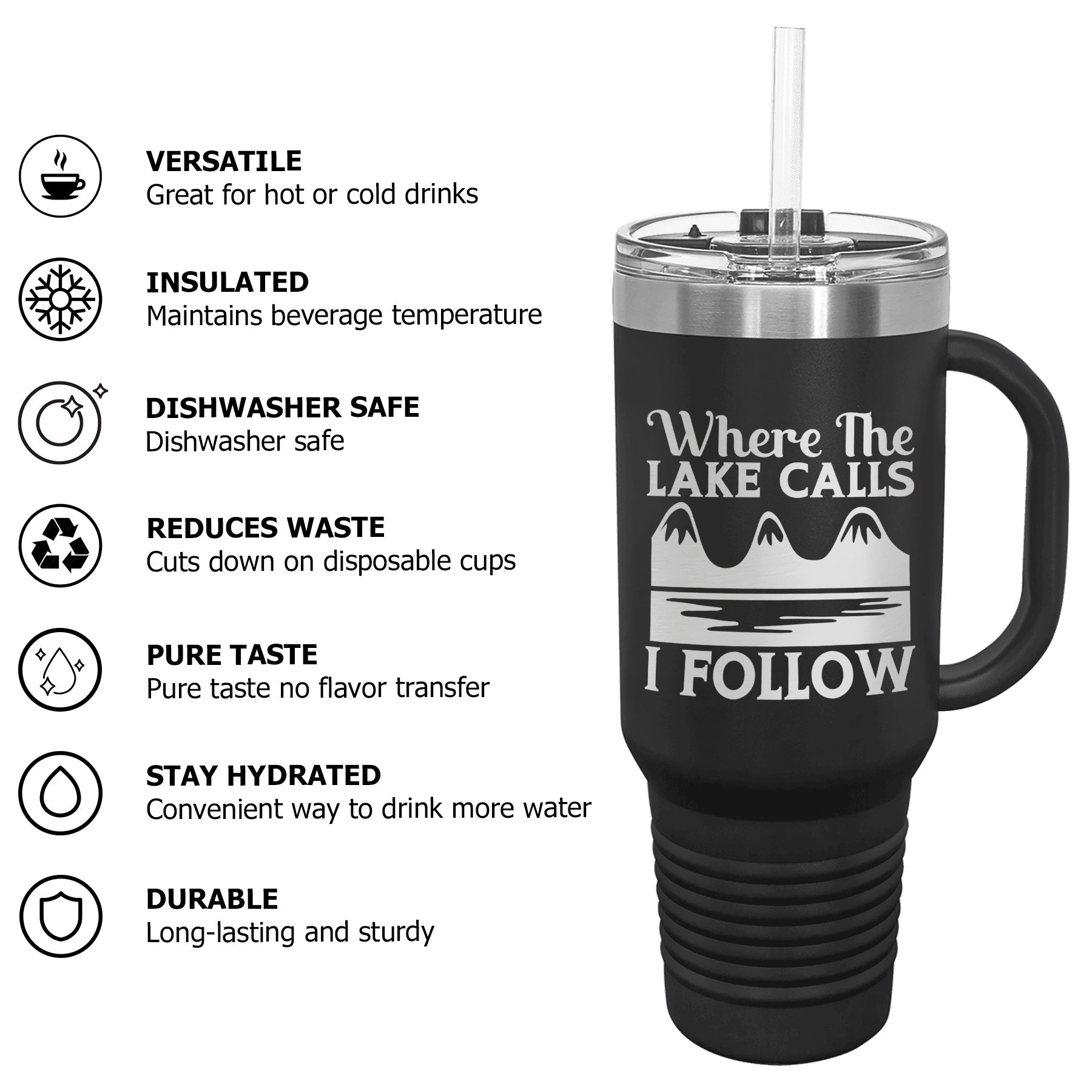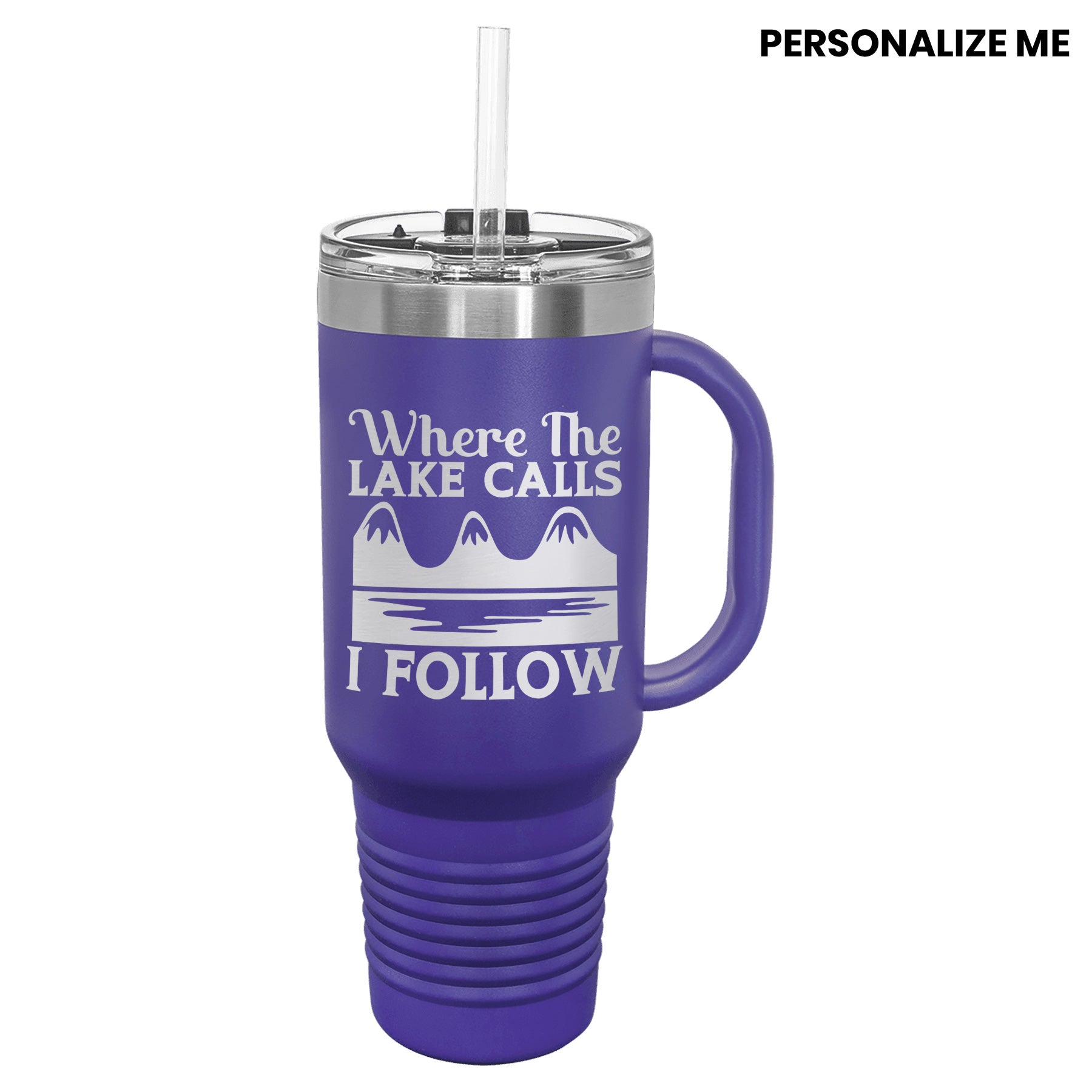Where The Lake Calls I Follow Text Image Tumbler with Handle