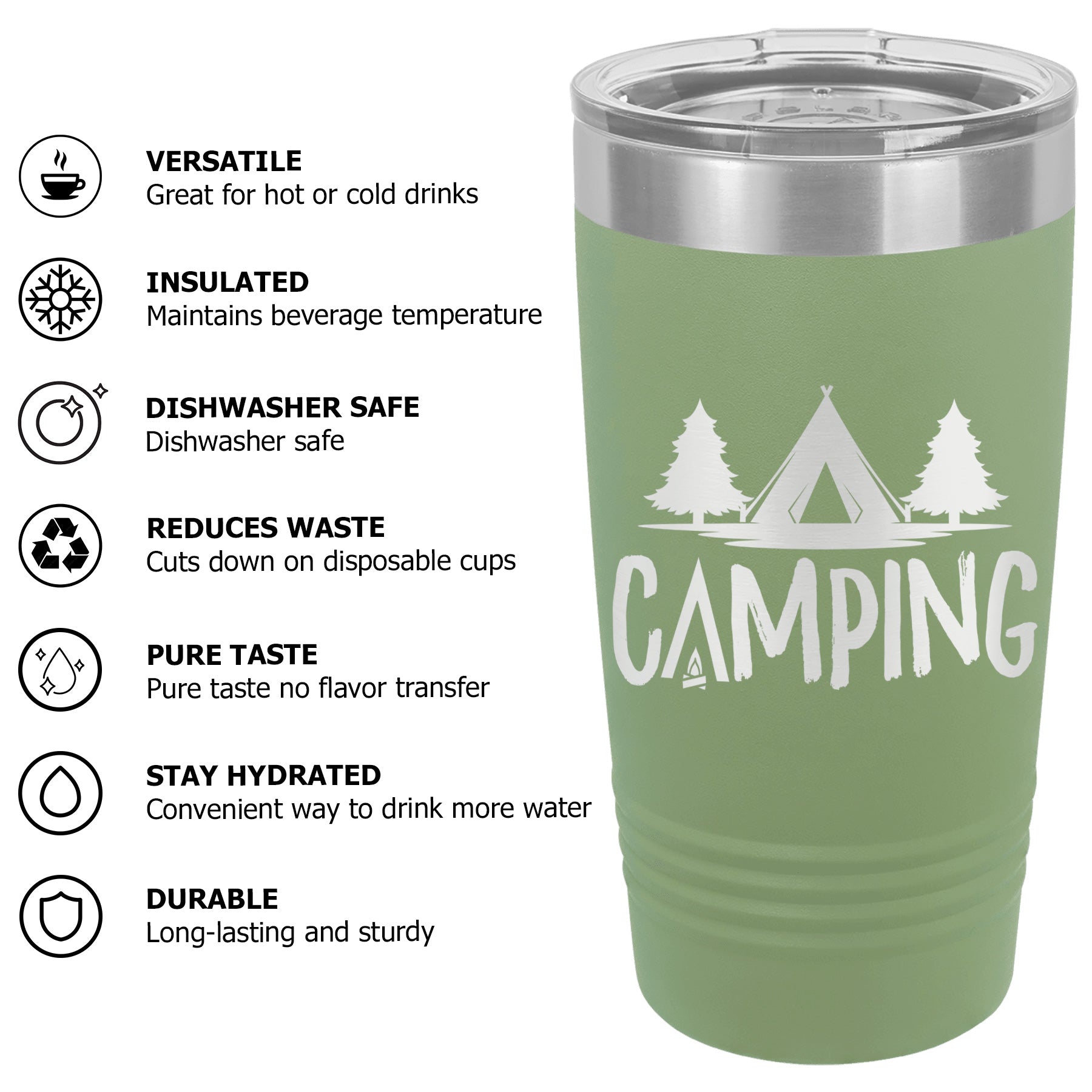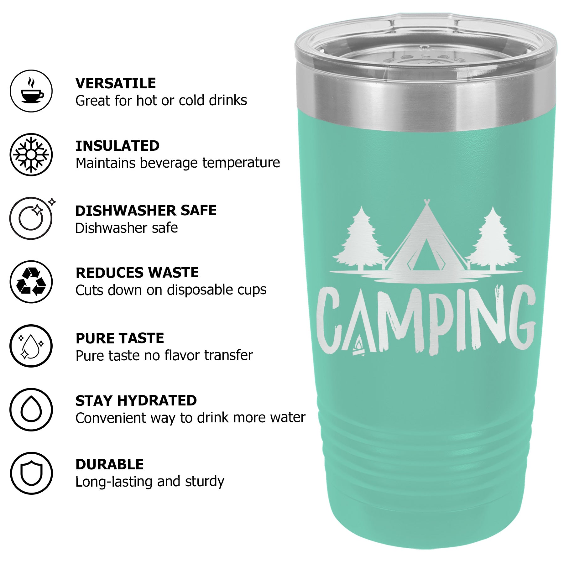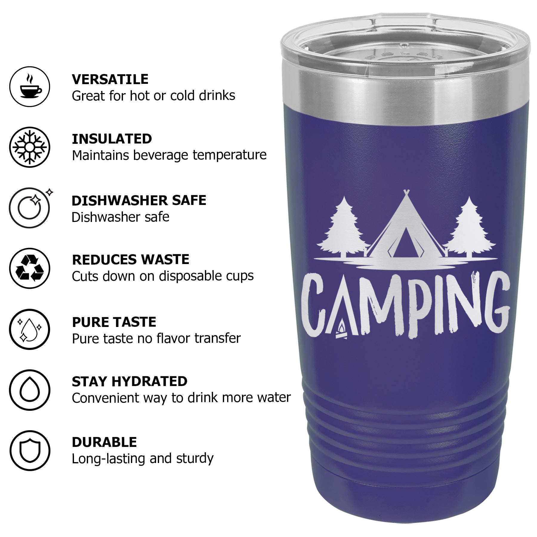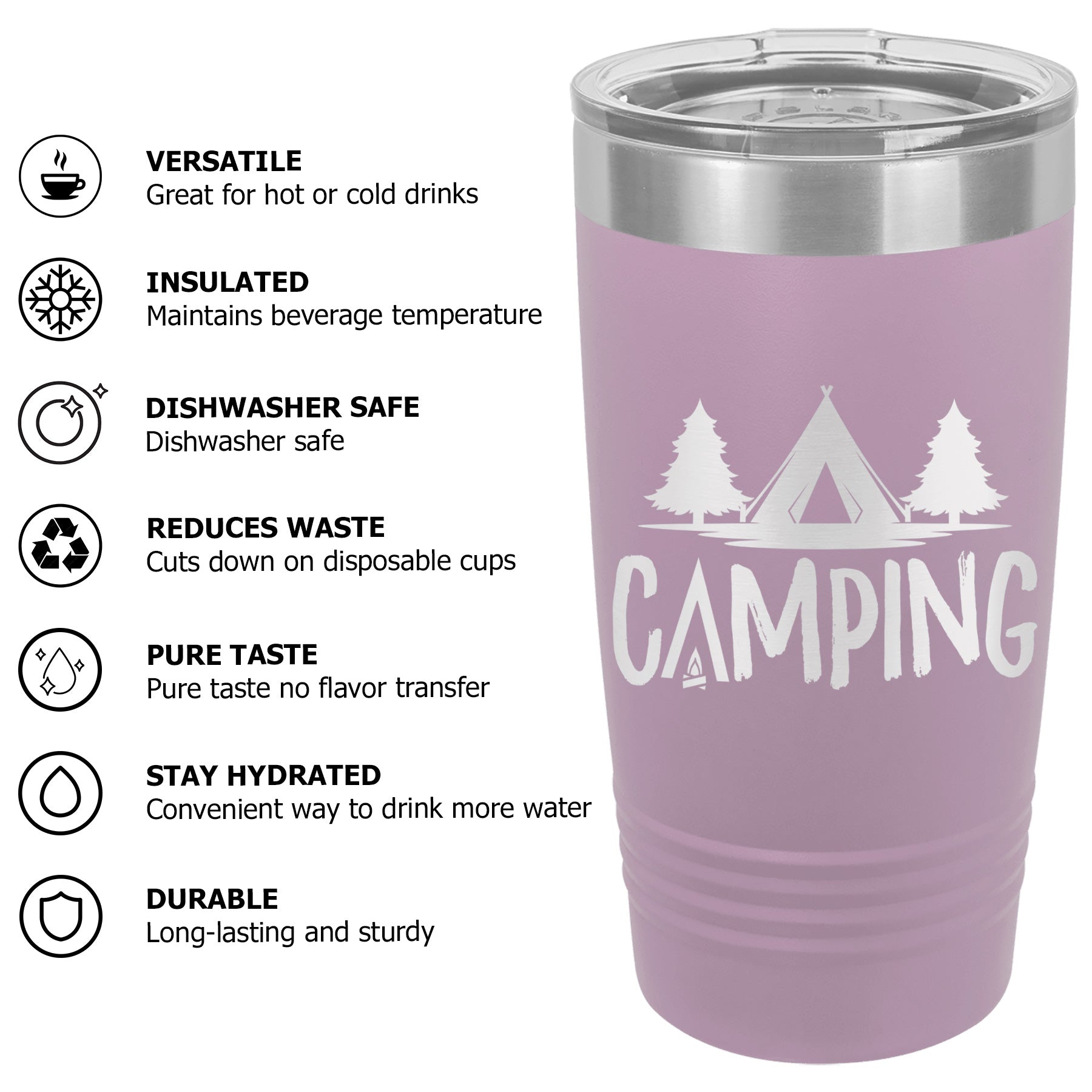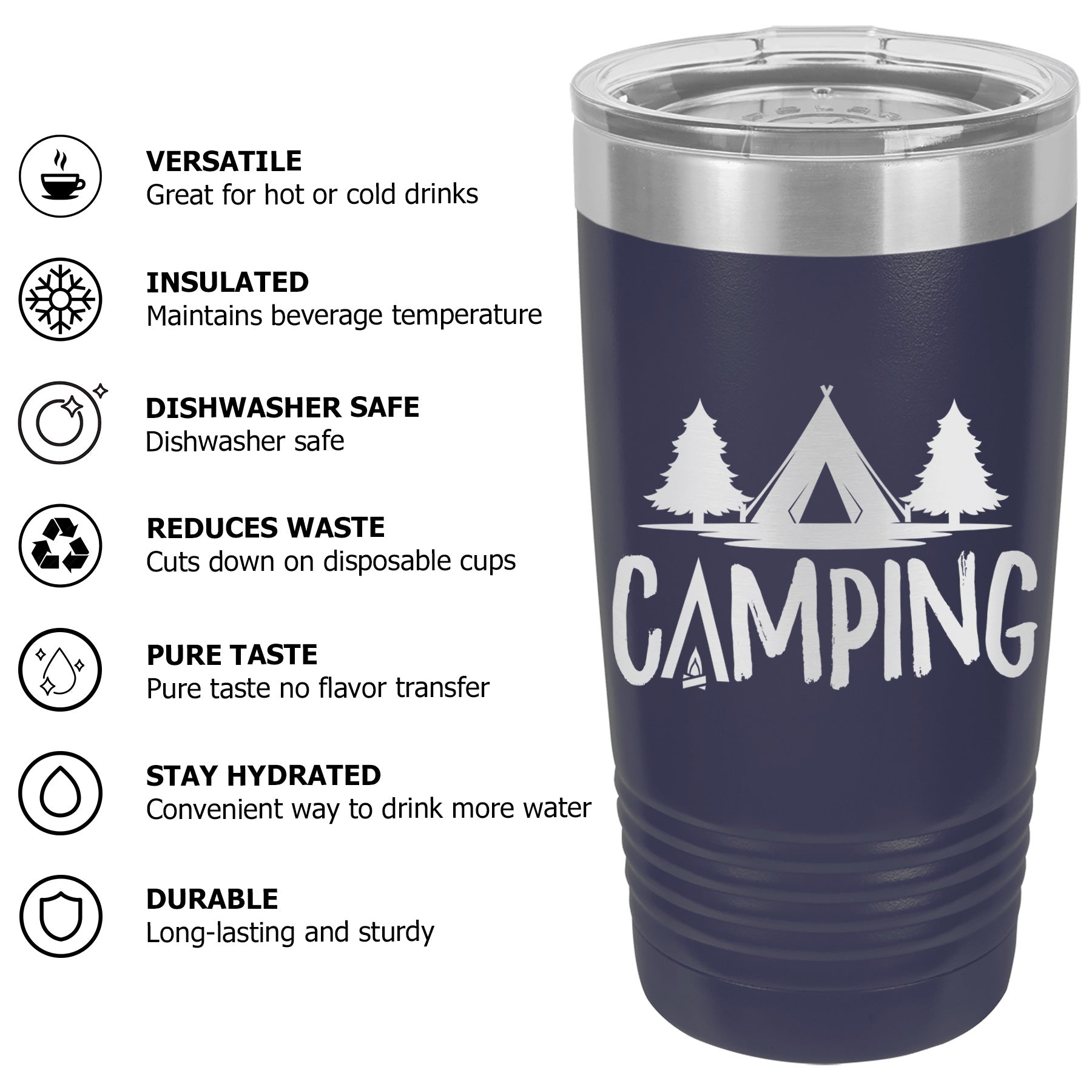 Available Sizes: 20 oz, 30 oz Designed to fit standard car cup holders for easy travel.