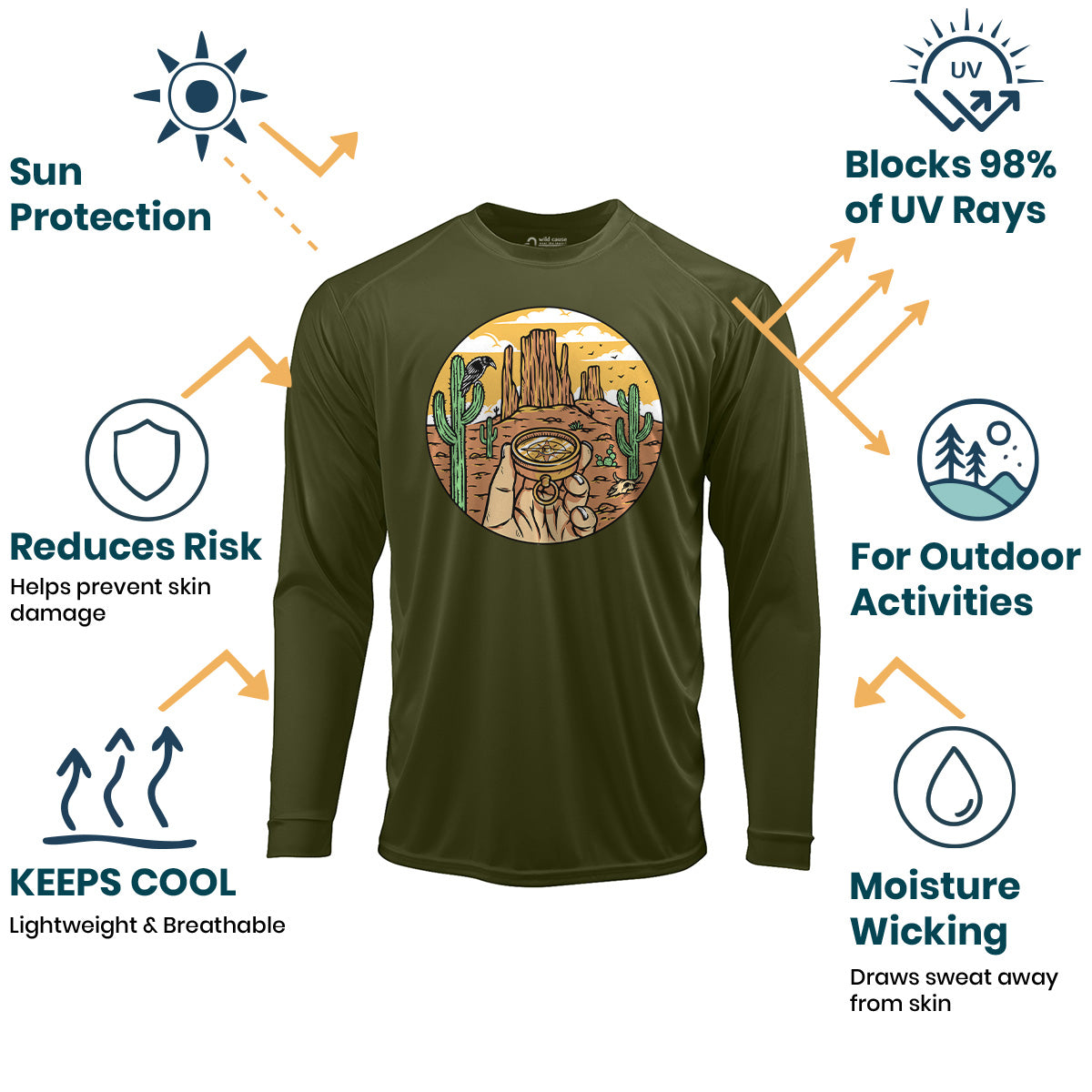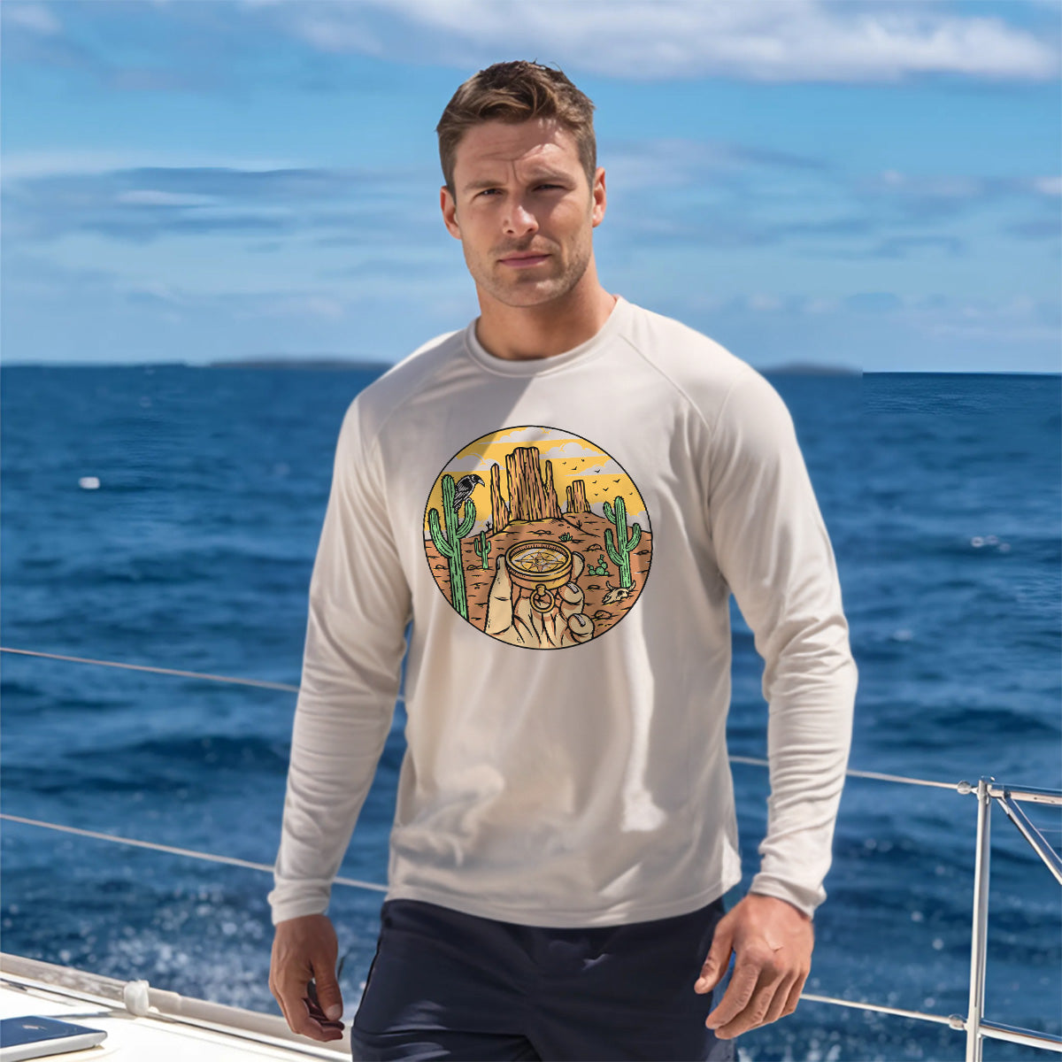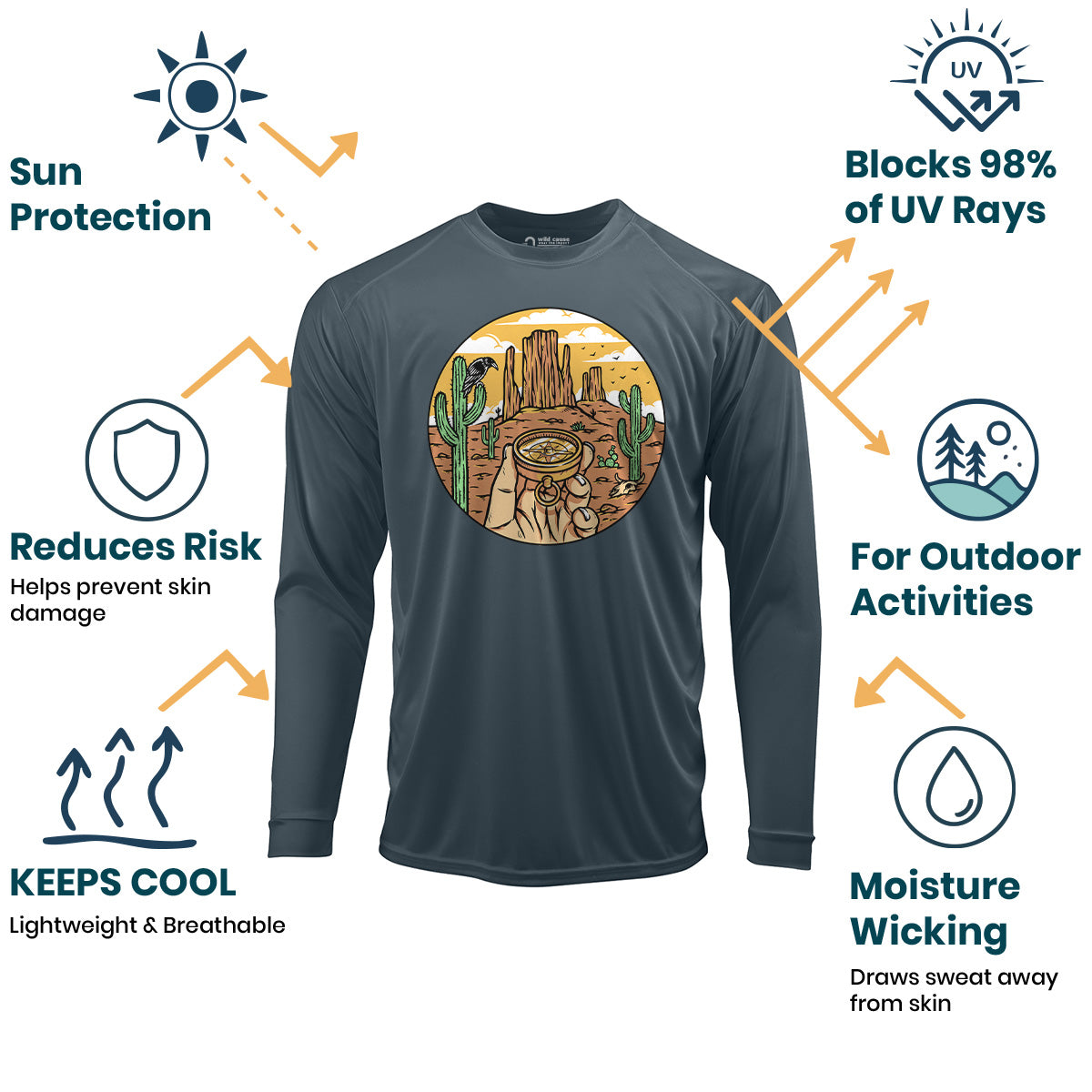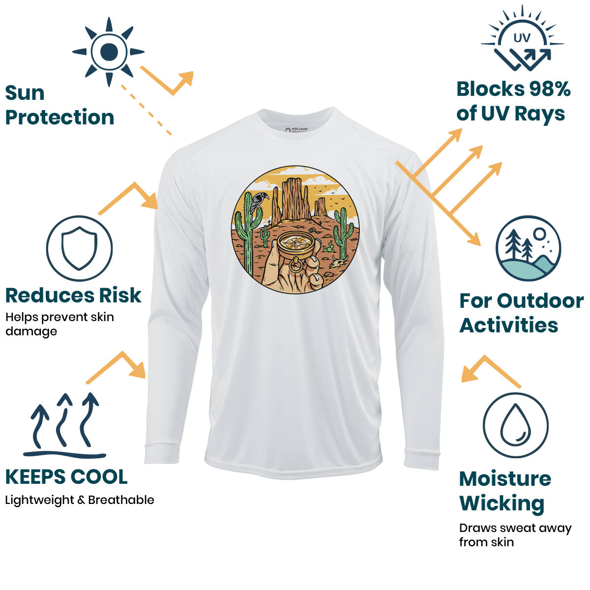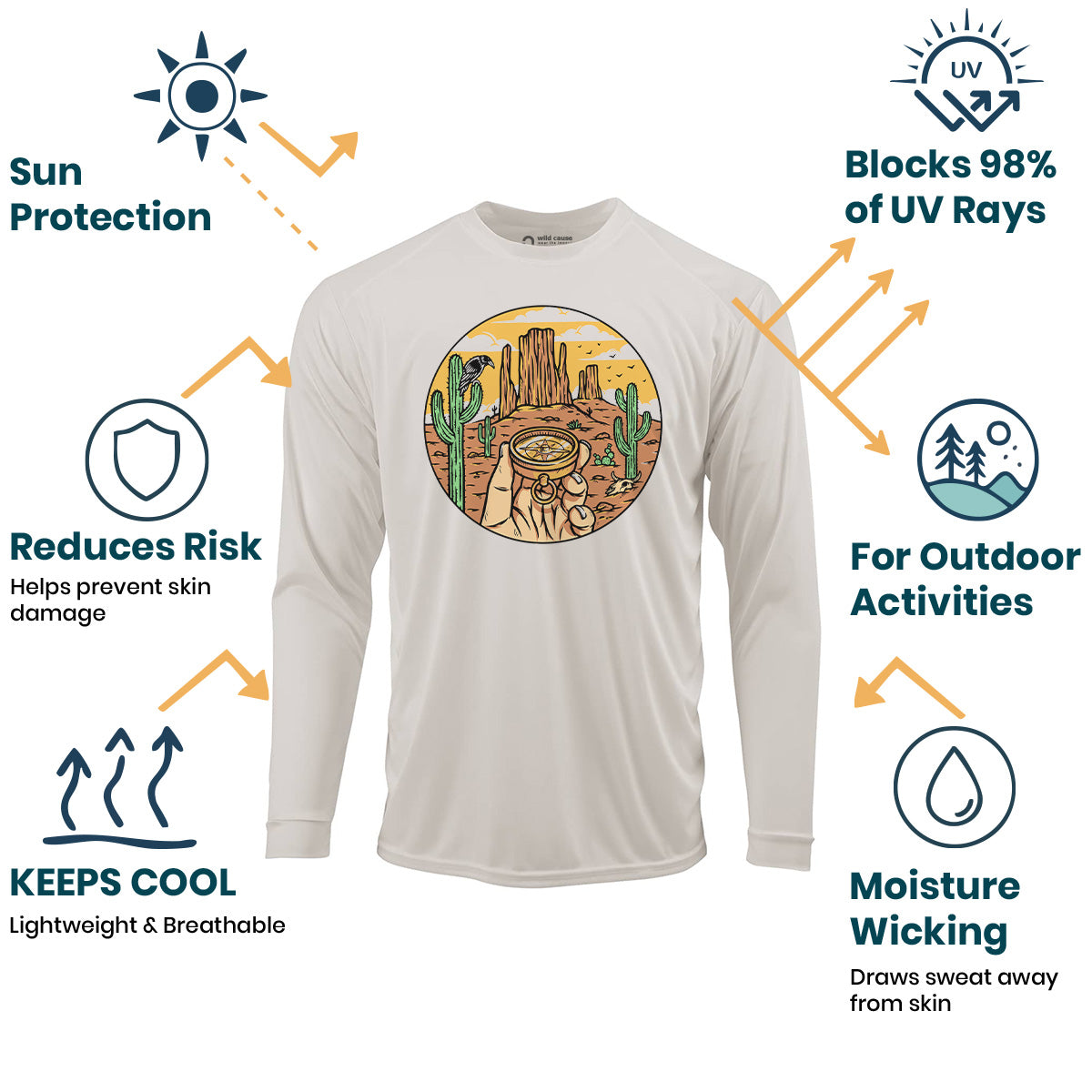 Find your way out there with the Desert Compass Sun Protection UV Performance Shirt UPF 50+. Designed for outdoor exploration, this shirt offers desert navigation with style. Embark on your compass journey in comfort and protection.