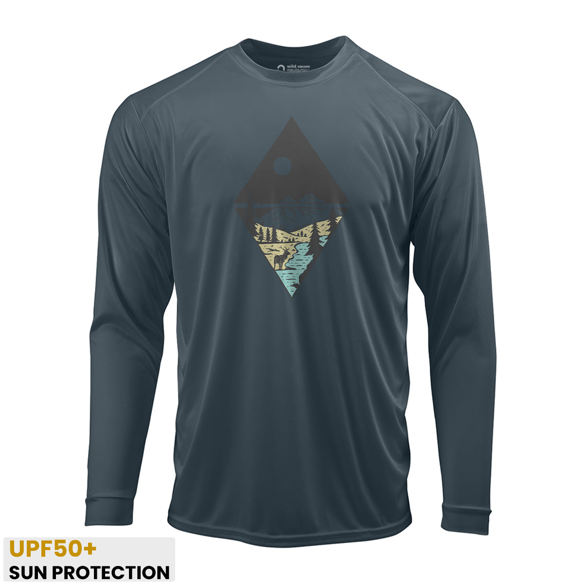 Stay calm and serene in the mountains with our Peace found in the peaks! Sun Protection UV Performance Shirt UPF 50+. Embrace the mountain calm and nature's silence in this highland serenity design.