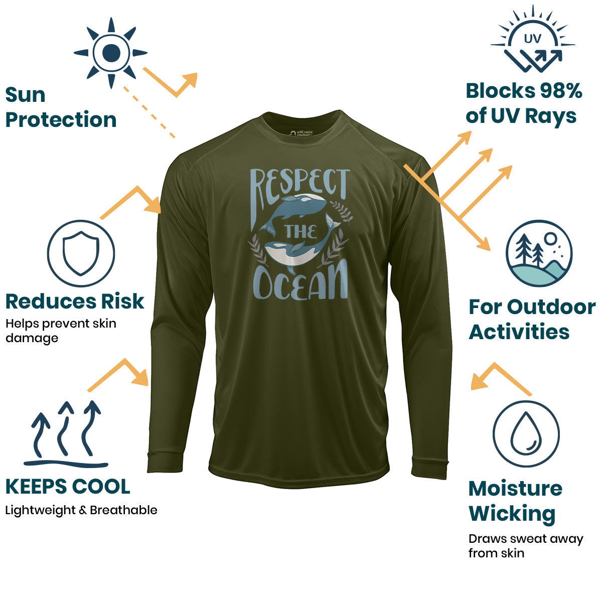 Respect Marine World Sun Protection UV Performance Shirt UPF 50+ is a must-have for those who Respect the Ocean and support Marine Conservation Campaign. Save Marine life in style with this shirt, showcasing Unity with the Seas on World Oceans Day.
