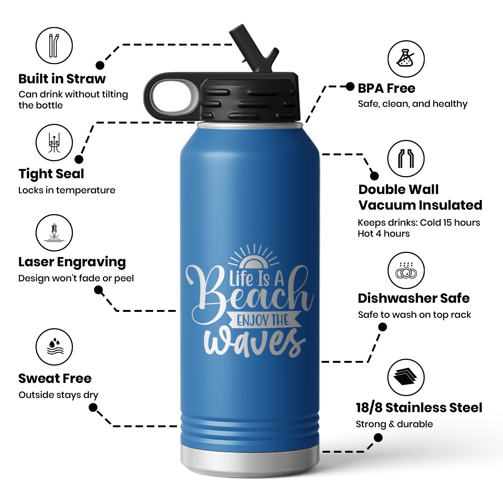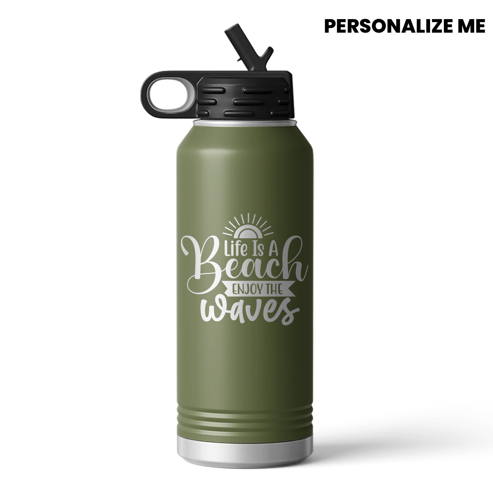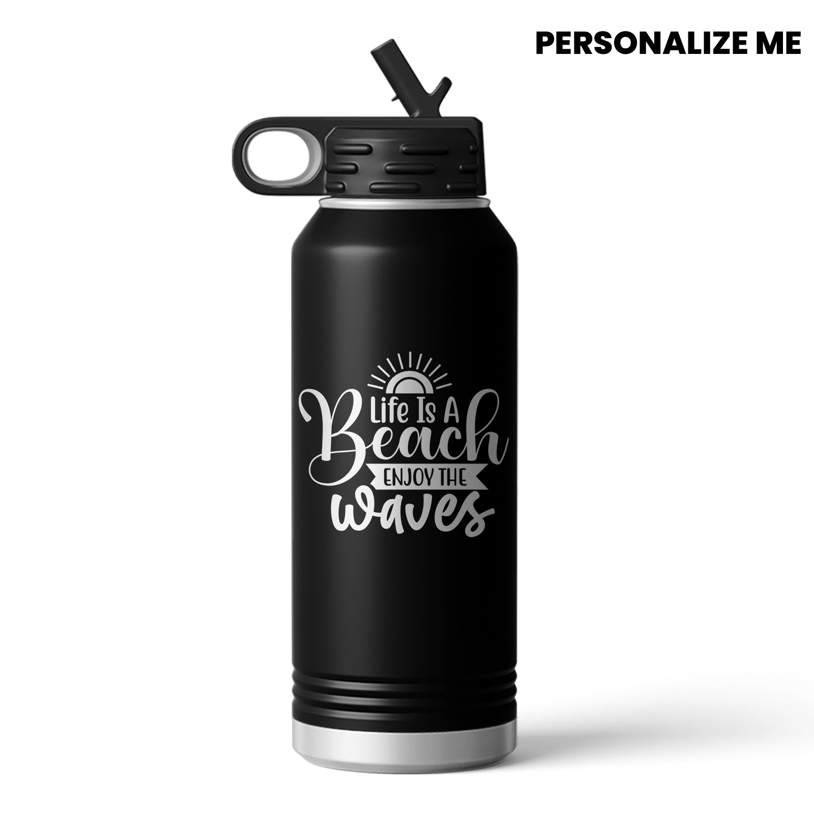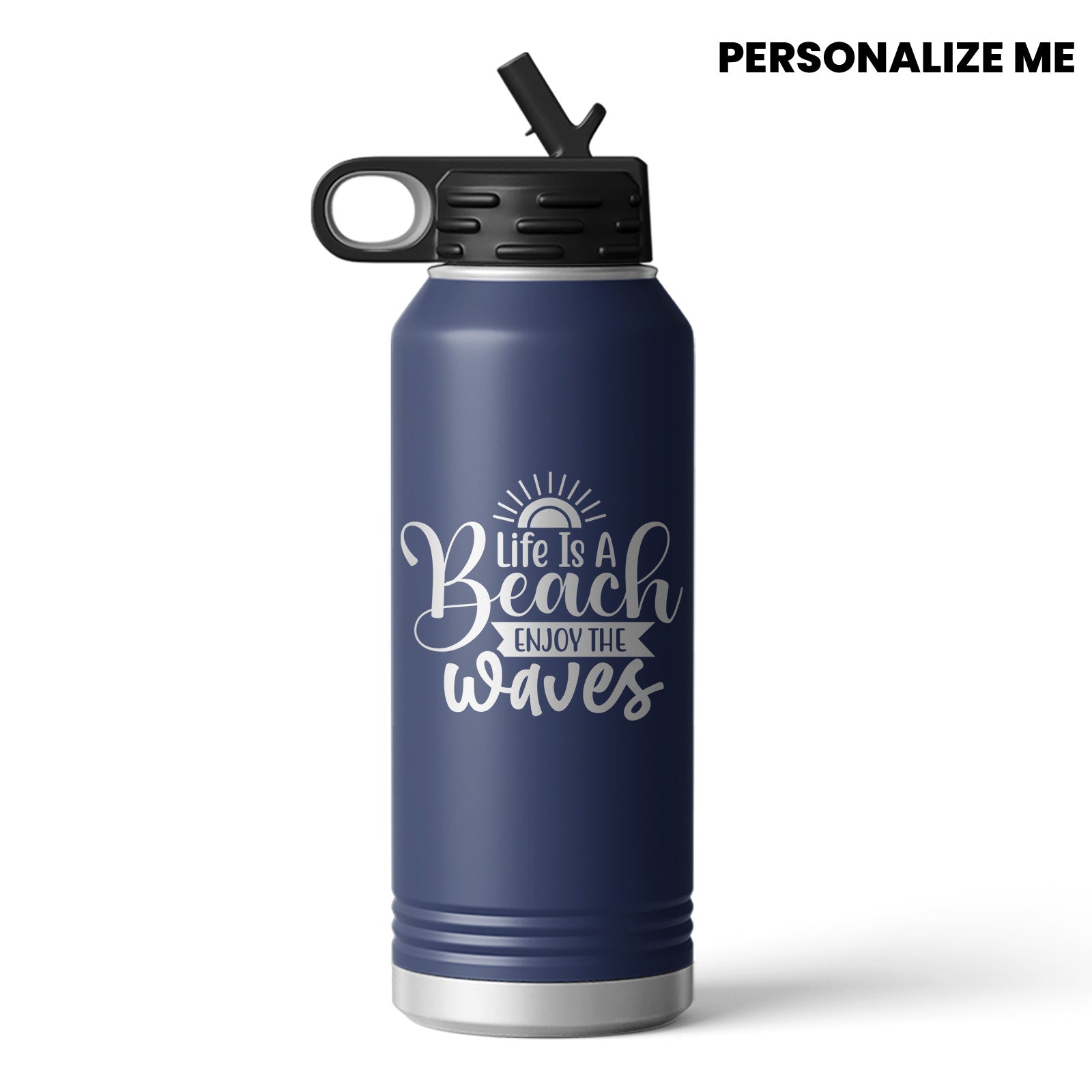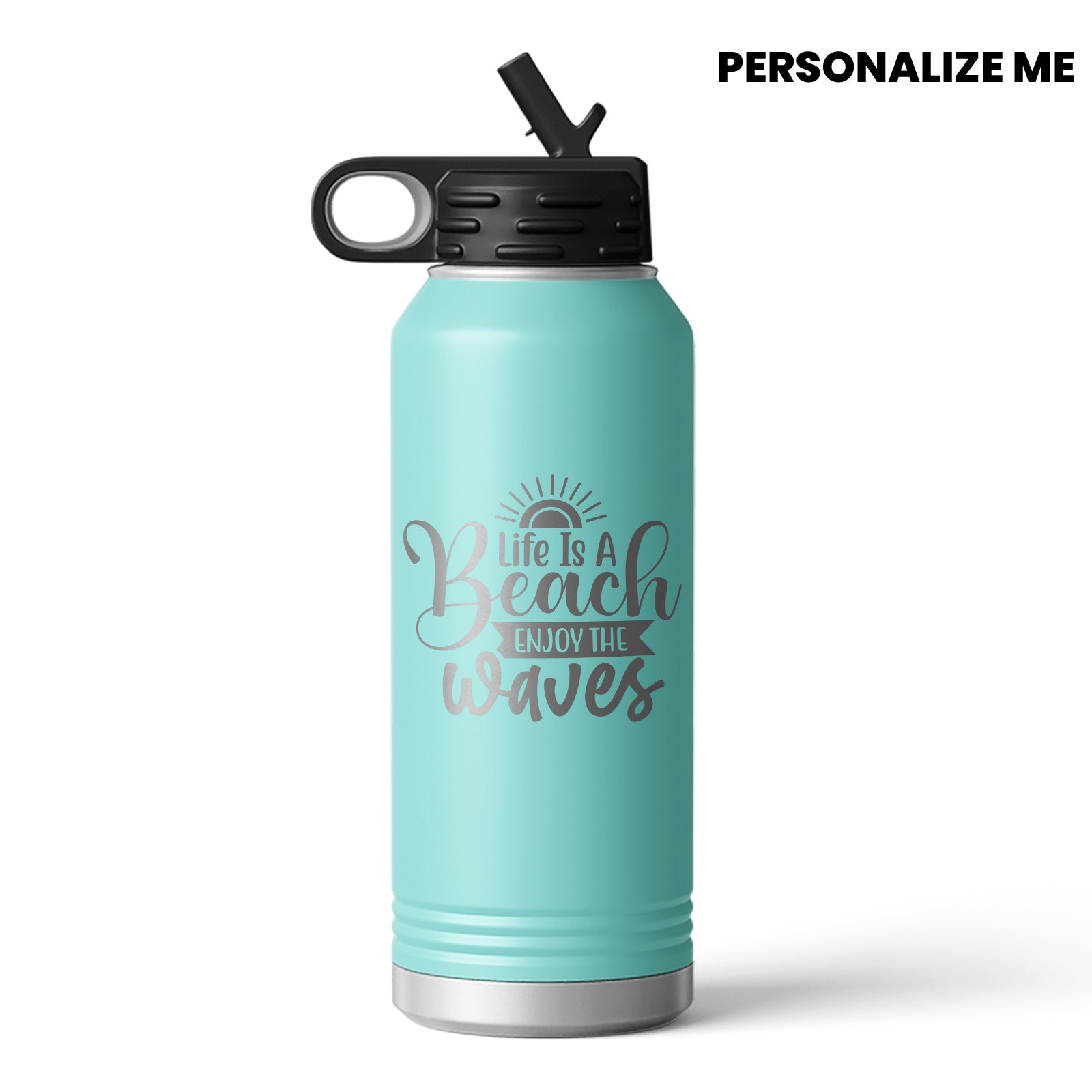 Stay hydrated and embrace the beach life with our Live life, enjoy beach waves water bottle. Ride the waves of refreshing drinks with this stylish and durable bottle. Perfect for beach vibes and forever beach fun, this bottle is a must-have for all beach lovers.