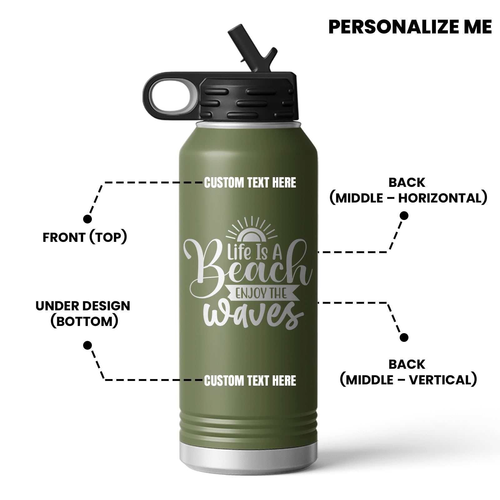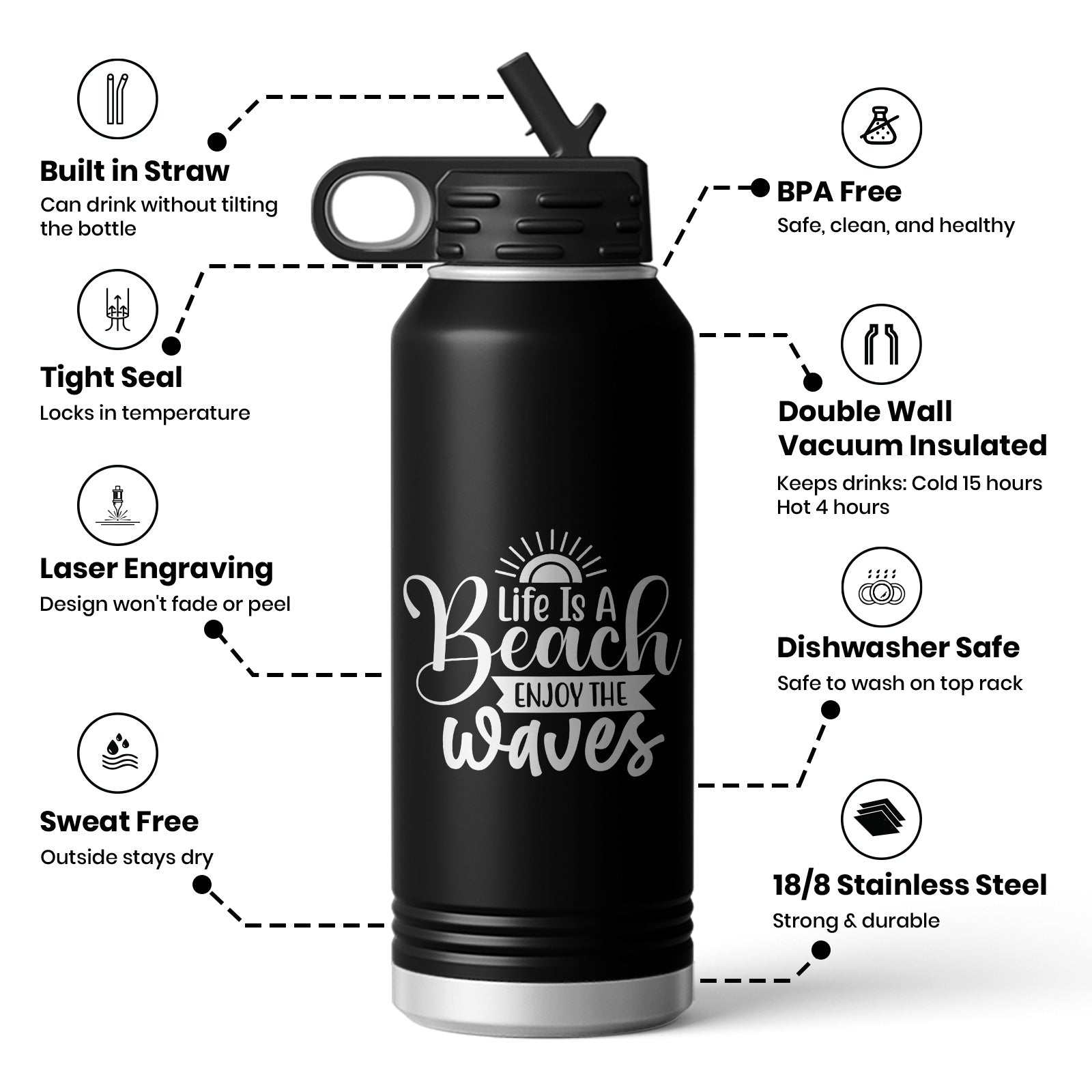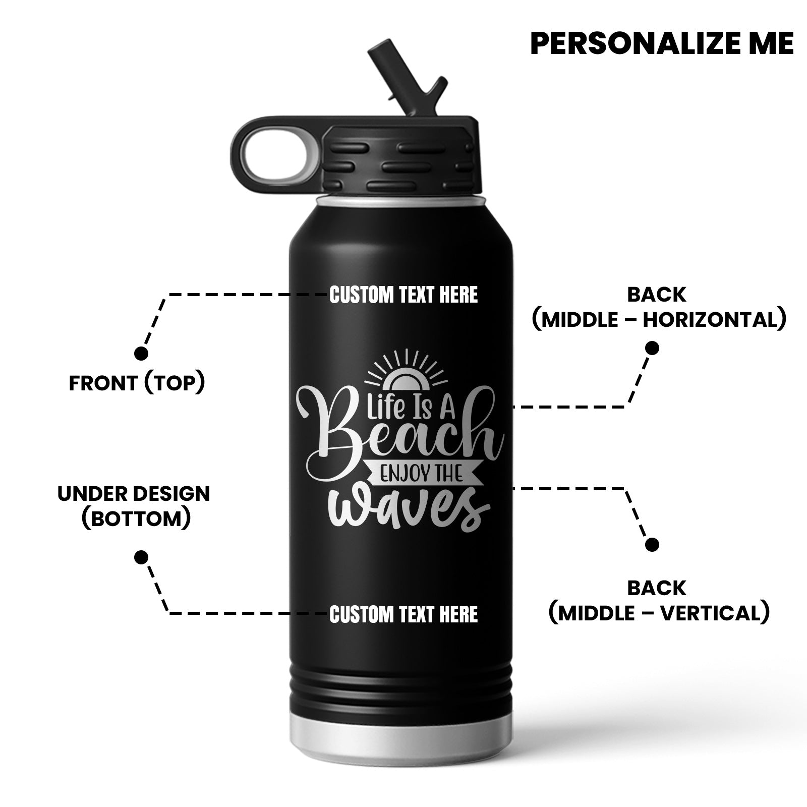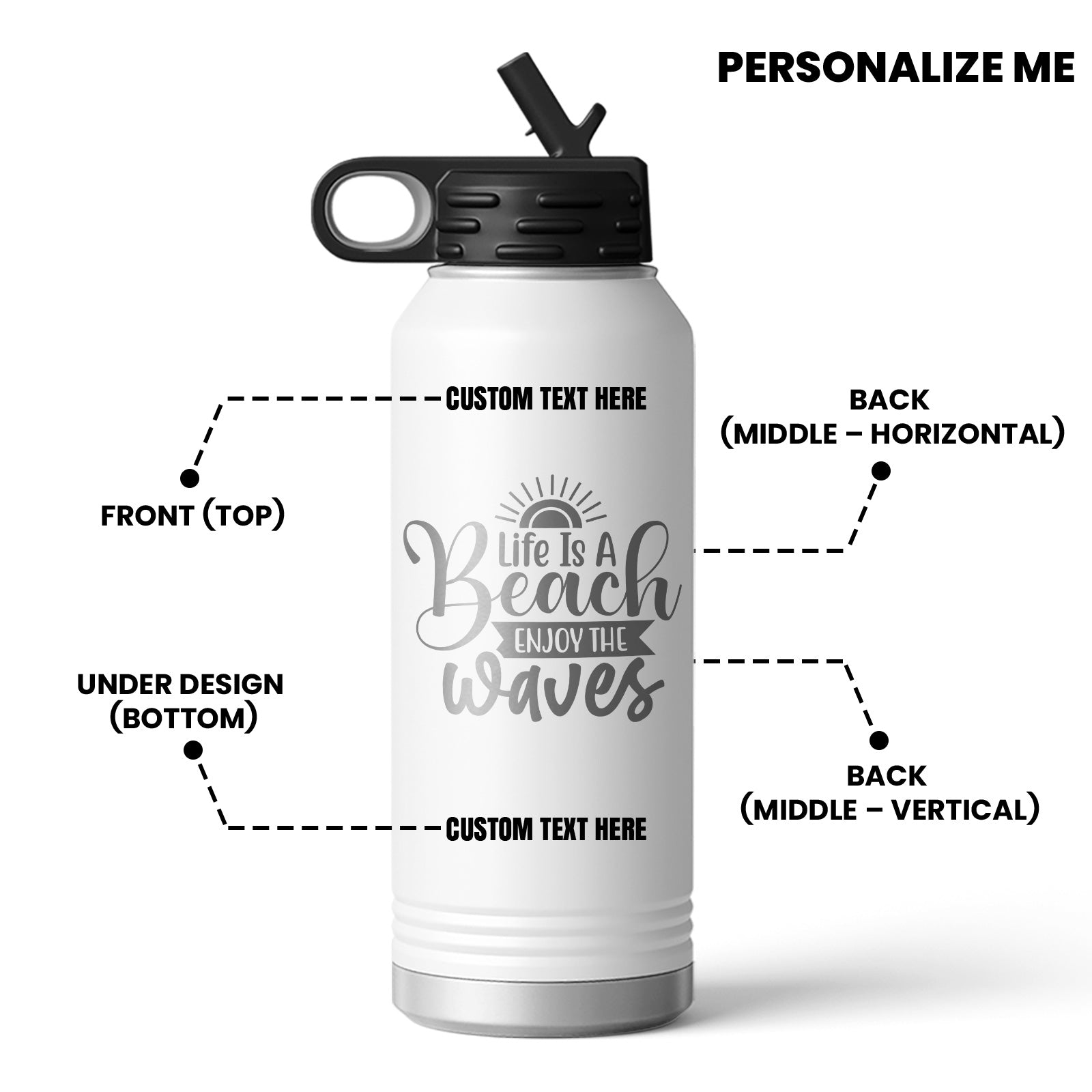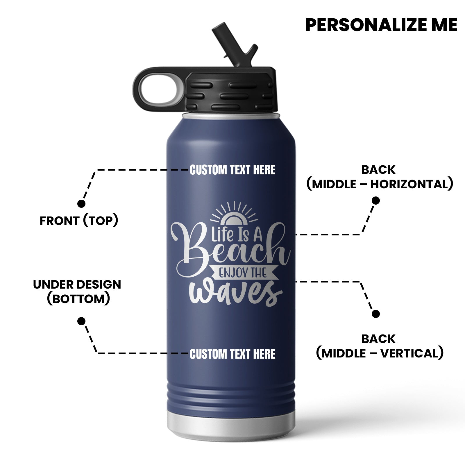 Stay hydrated and embrace the beach life with our Live life, enjoy beach waves water bottle. Ride the waves of refreshing drinks with this stylish and durable bottle. Perfect for beach vibes and forever beach fun, this bottle is a must-have for all beach lovers.