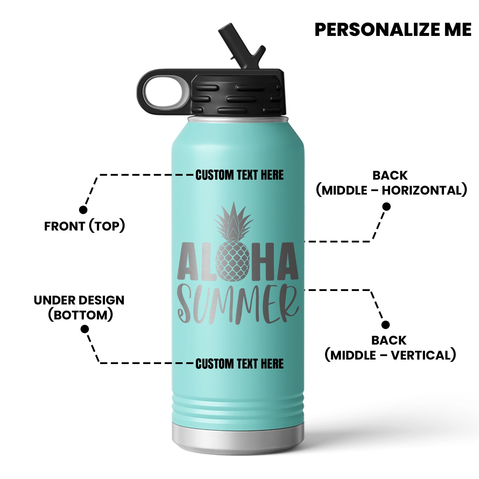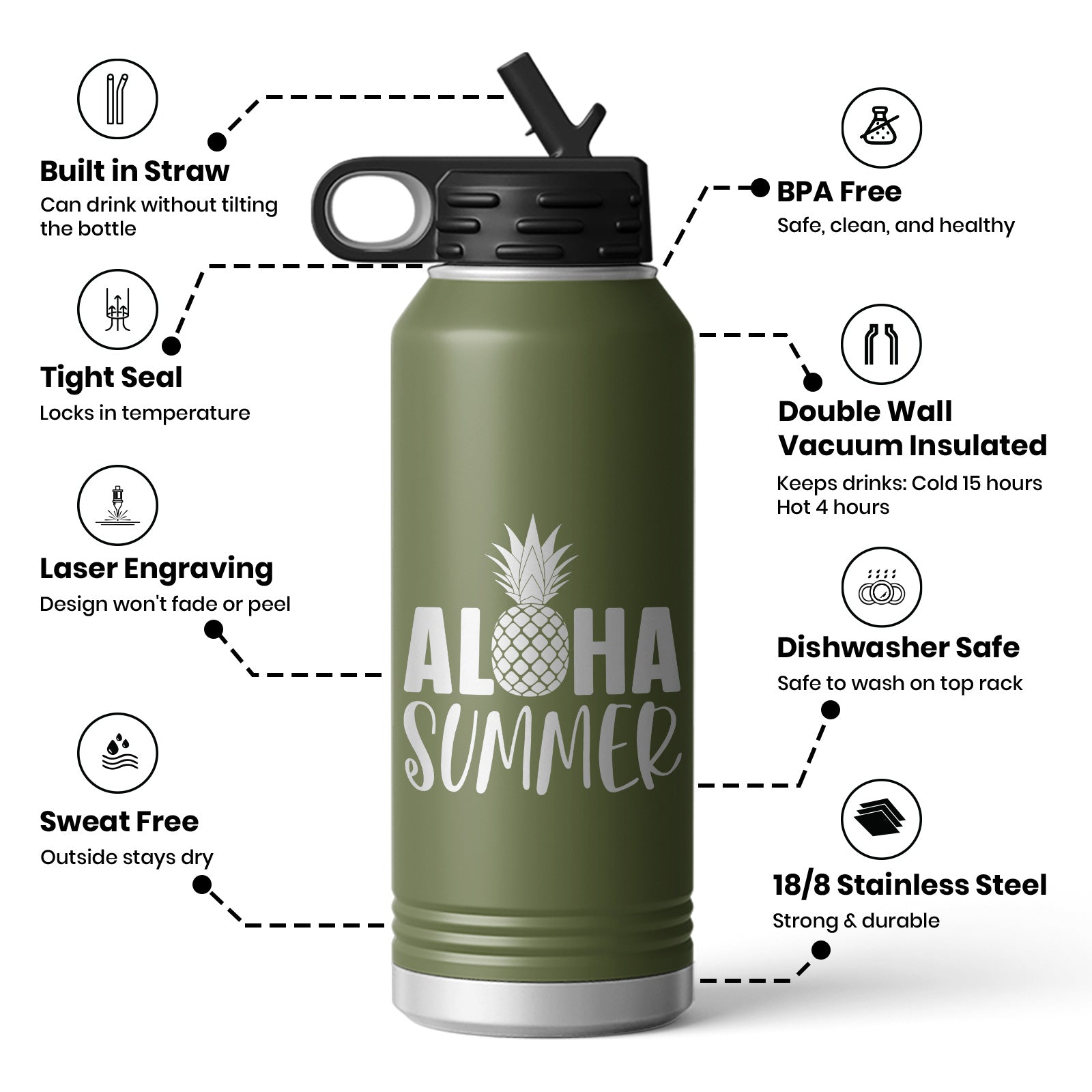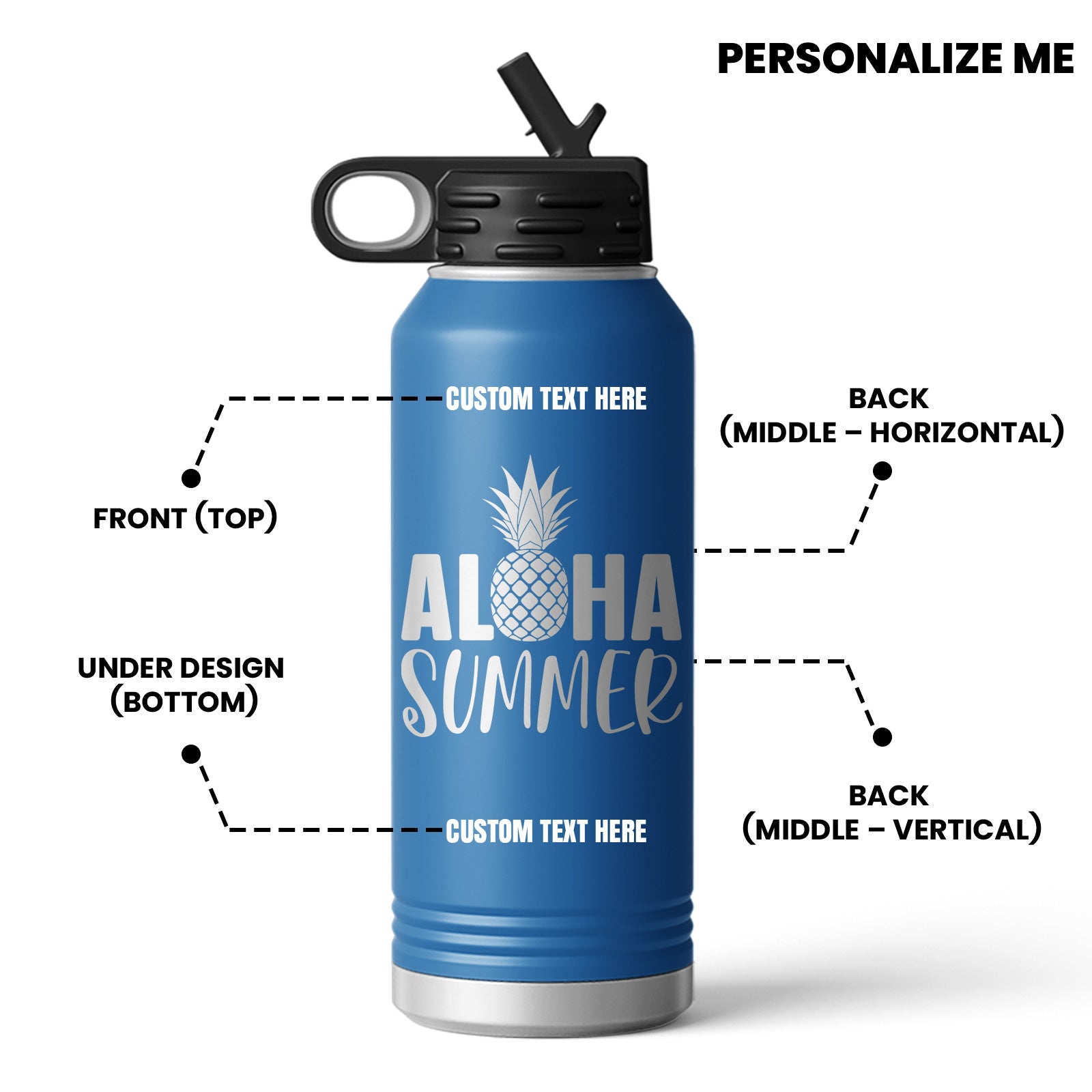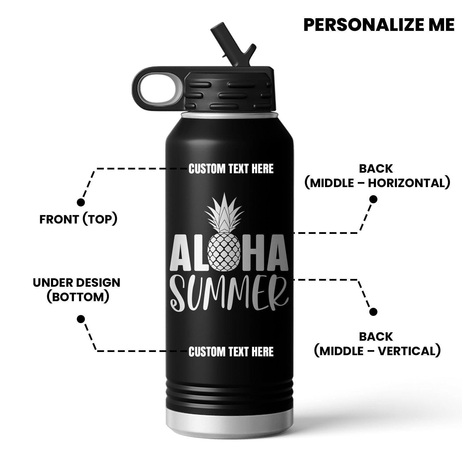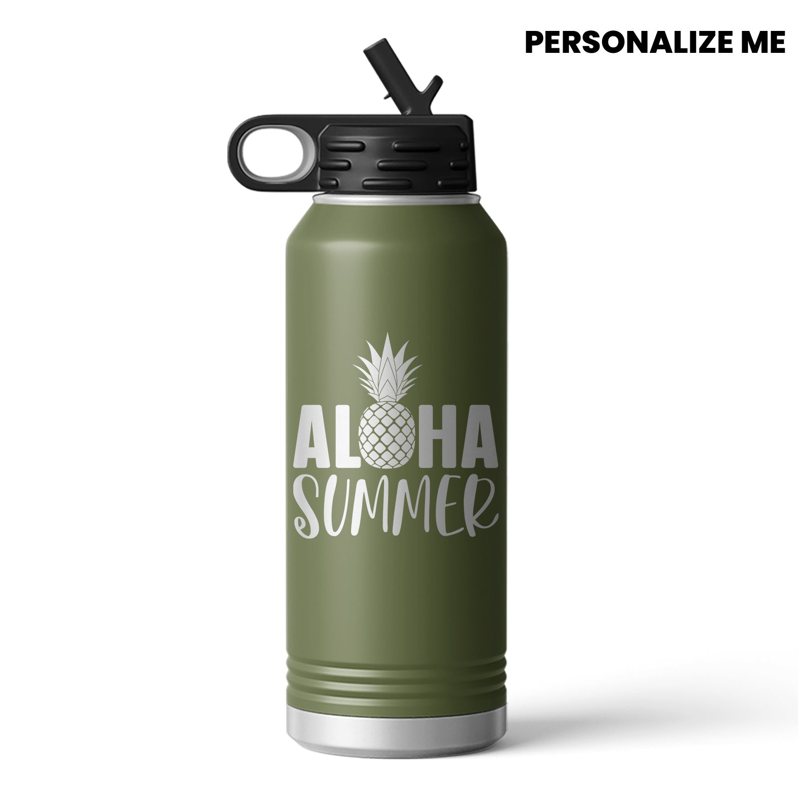 Stay refreshed with the Aloha vibes, summer beach fun water bottle. Embrace summer vibes with aloha and beach vibes, feeling the summer breeze and waves. Enjoy aloha days under the sun, where aloha means beach time.